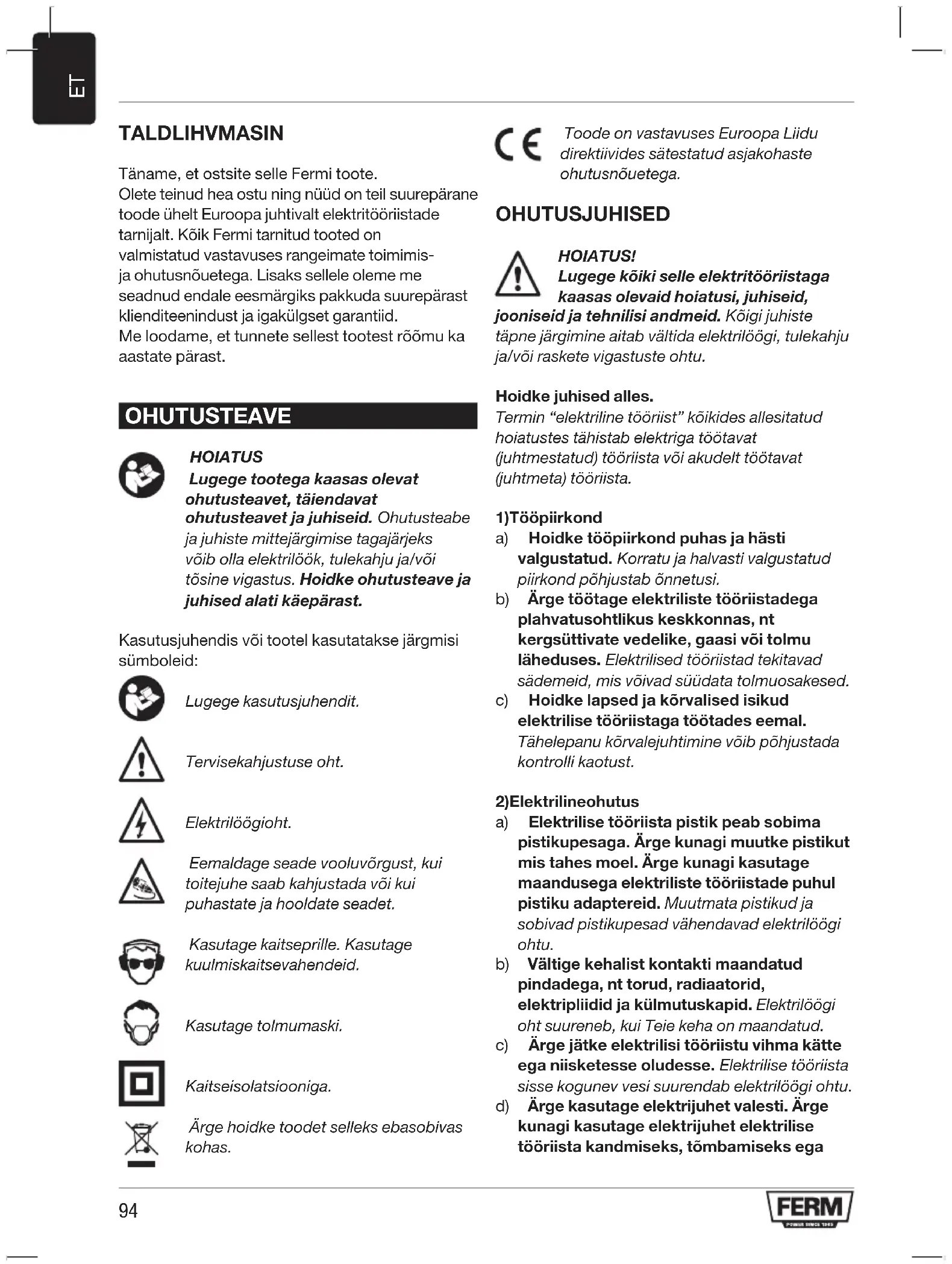 TALDLIHVMASIN Täname, et ostsite selle Fermi toote. Olete teinud hea ostu ning nüüd on teil suurepärane toode ühelt Euroopa juhtivalt elektritööriistade tarnijalt. Kõik Fermi tarnitud tooted on valmistatud vastavuses rangeimate toimimis- ja ohutusnõuetega. Lisaks sellele oleme me seadnud endale eesmärgiks pakkuda suurepärast klienditeenindust ja igakülgset garantiid. Me loodame, et tunnete sellest tootest rõõmu ka aastate pärast. OHUTUSTEAVE HOIATUS Lugege tootega kaasas olevat ohutusteavet, täiendavat ohutusteavet ja juhiseid. Ohutusteabe ja juhiste mittejärgimise tagajärjeks võib olla elektrilöök, tulekahju ja/või tõsine vigastus. Hoidke ohutusteave ja juhised alati käepärast. Kasutusjuhendis või tootel kasutatakse järgmisi sümboleid: Lugege kasutusjuhendit. Tervisekahjustuse oht. Elektrilöögioht. Eemaldage seade vooluvõrgust, kui toitejuhe saab kahjustada või kui puhastate ja hooldate seadet. Kasutage kaitseprille. Kasutage kuulmiskaitsevahendeid. Kasutage tolmumaski. Kaitseisolatsiooniga. Ärge hoidke toodet selleks ebasobivas kohas. Toode on vastavuses Euroopa Liidu direktiivides sätestatud asjakohaste ohutusnõuetega. OHUTUSJUHISED HOIATUS! Lugege kõiki selle elektritööriistaga kaasas olevaid hoiatusi, juhiseid, jooniseid ja tehnilisi andmeid. Kõigi juhiste täpne järgimine aitab vältida elektrilöögi, tulekahju ja/või raskete vigastuste ohtu. Hoidke juhised alles. Termin “elektriline tööriist” kõikides allesitatud hoiatustes tähistab elektriga töötavat (juhtmestatud) tööriista või akudelt töötavat (juhtmeta) tööriista.