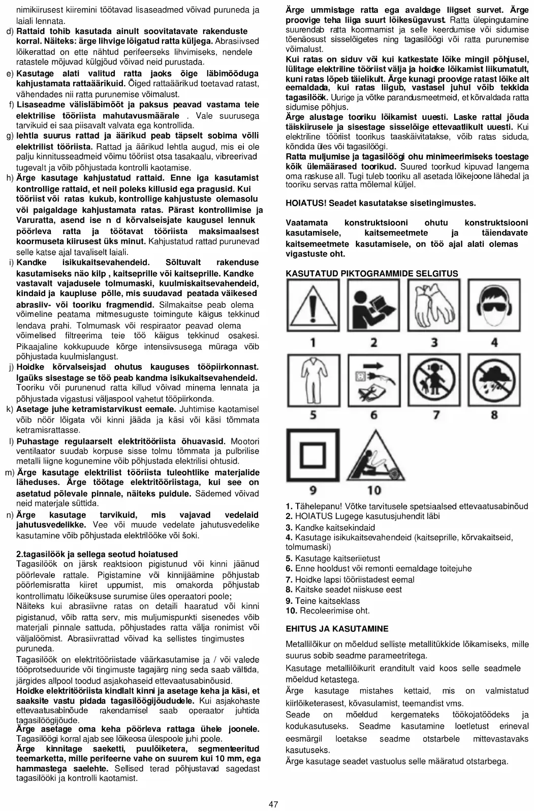 Metallilõikur on mõeldud selliste metallitükkide lõikamiseks, mille suurus sobib seadme parameetritega. Kasutage metallilõikurit eranditult vaid koos selle seadmele mõeldud ketastega. Ärge kasutage mistahes kettaid, mis on valmistatud kiirlõiketerasest, kõvasulamist, teemandist vms. Seade on mõeldud kergemateks töökojatöödeks ja kodukasutuseks. Seadme kasutamine loetletust erineval eesmärgil loetakse seadme otstarbele mittevastavaks kasutuseks. Ärge kasutage seadet vastuolus selle määratud otstarbega.48 JOONISTE KIRJELDUS Alltoodud numeratsioon vastab käesoleva juhendi joonistel toodud seadme elementide numeratsioonile.