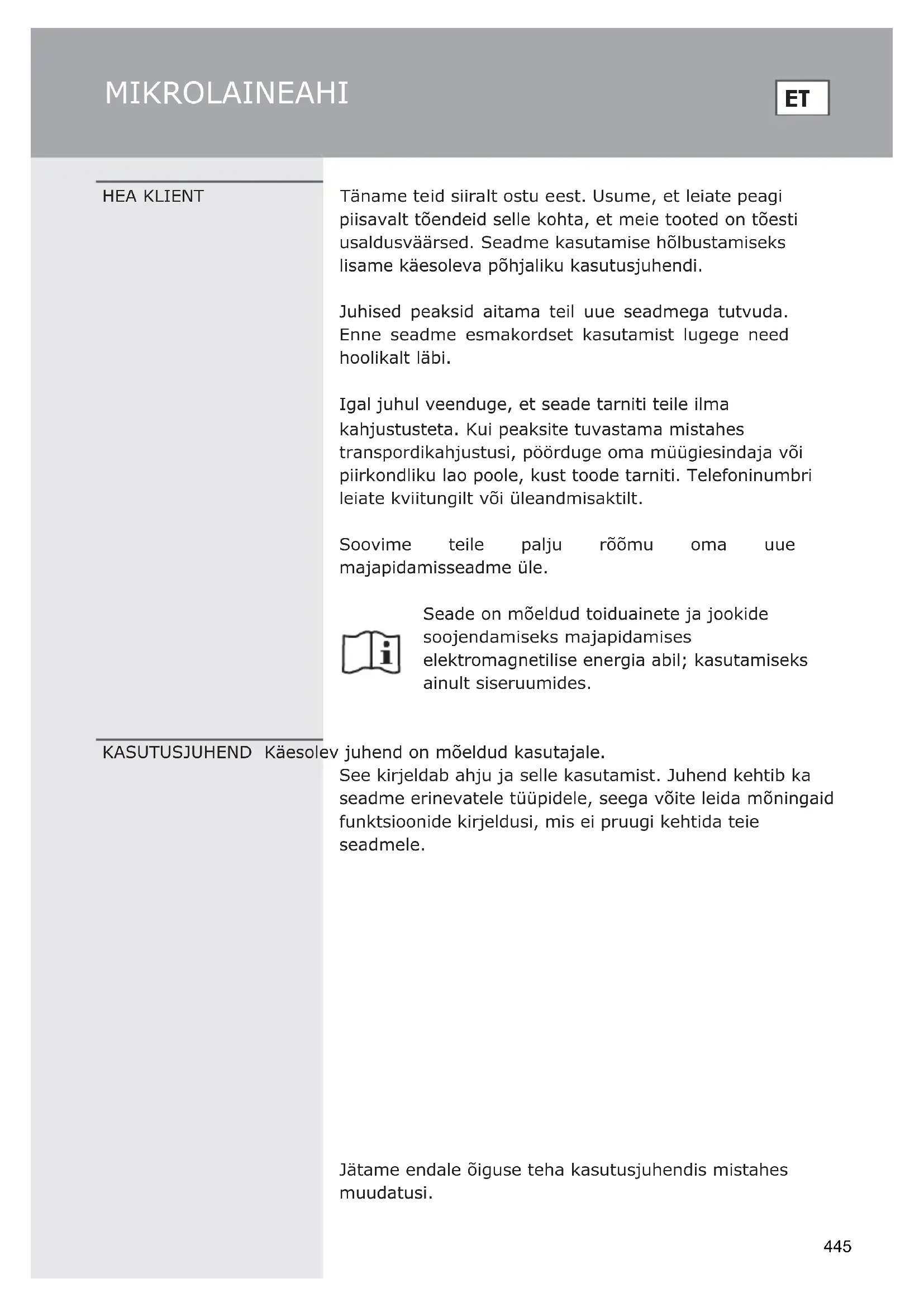 445OLULISED OHUTUSJUHISED Ärge kunagi puudutage kütte- või toiduvalmistamisseadmete pindu. Need muutuvad töötamise ajal kuumaks. Hoidke lapsi turvalises kauguses. Põletuse oht! Mikrolaineenergia ja kõrgepinge! Ärge eemaldage katet. HOIATUS! Seade ja selle ligipääsetavad osad kuumenevad kasutamise ajal. Vältige kütteelementide puudutamist. Alla 8-aastased lapsed tuleb hoida seadmest eemal, kui nad ei ole pideva järelevalve all. Lapsi tuleb jälgida, et nad ei mängiks seadmega. Seadet võivad kasutada lapsed alates 8. eluaastast ning pärsitud füüsiliste, sensoorsete või vaimsete võimete või kogemuste või teadmisteta isikud, kui neid on seadme ohutu kasutamise osas instrueeritud ja nende tegevust jälgitakse ning kui nad mõistavad tegevusega seotud ohtusid. Jälgige, et lapsed seadmega ei mängiks. Lastel ei ole lubatud teha puhastus- ja hooldustöid, välja arvatud juhul, kui nad on vanemad kui 8 aastat ja nad on järelevalve all. Hoidke seadet ja selle juhet alla 8-aastaste laste eest kättesaamatus kohas.