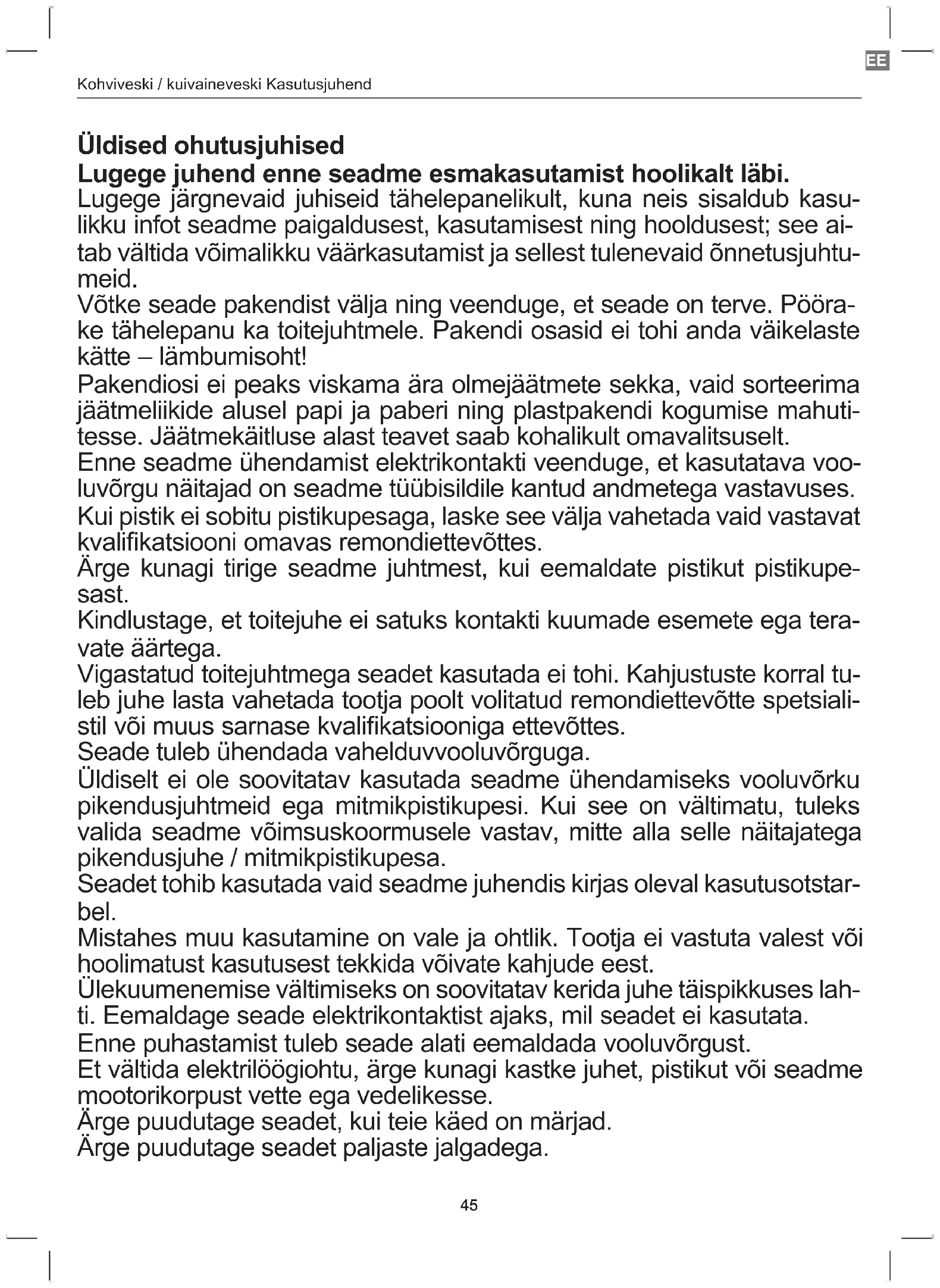 Üldised ohutusjuhised Lugege juhend enne seadme esmakasutamist hoolikalt läbi. Lugege järgnevaid juhiseid tähelepanelikult, kuna neis sisaldub kasu- likku infot seadme paigaldusest, kasutamisest ning hooldusest; see ai- tab vältida võimalikku väärkasutamist ja sellest tulenevaid õnnetusjuhtu- meid. Võtke seade pakendist välja ning veenduge, et seade on terve. Pööra- ke tähelepanu ka toitejuhtmele. Pakendi osasid ei tohi anda väikelaste kätte – lämbumisoht! Pakendiosi ei peaks viskama ära olmejäätmete sekka, vaid sorteerima jäätmeliikide alusel papi ja paberi ning plastpakendi kogumise mahuti- tesse. Jäätmekäitluse alast teavet saab kohalikult omavalitsuselt. Enne seadme ühendamist elektrikontakti veenduge, et kasutatava voo- luvõrgu näitajad on seadme tüübisildile kantud andmetega vastavuses. Kui pistik ei sobitu pistikupesaga, laske see välja vahetada vaid vastavat kvalikatsiooni omavas remondiettevõttes. Ärge kunagi tirige seadme juhtmest, kui eemaldate pistikut pistikupe- sast. Kindlustage, et toitejuhe ei satuks kontakti kuumade esemete ega tera- vate äärtega. Vigastatud toitejuhtmega seadet kasutada ei tohi. Kahjustuste korral tu- leb juhe lasta vahetada tootja poolt volitatud remondiettevõtte spetsiali- stil või muus sarnase kvalikatsiooniga ettevõttes. Seade tuleb ühendada vahelduvvooluvõrguga. Üldiselt ei ole soovitatav kasutada seadme ühendamiseks vooluvõrku pikendusjuhtmeid ega mitmikpistikupesi. Kui see on vältimatu, tuleks valida seadme võimsuskoormusele vastav, mitte alla selle näitajatega pikendusjuhe / mitmikpistikupesa. Seadet tohib kasutada vaid seadme juhendis kirjas oleval kasutusotstar- bel. Mistahes muu kasutamine on vale ja ohtlik. Tootja ei vastuta valest või hoolimatust kasutusest tekkida võivate kahjude eest. Ülekuumenemise vältimiseks on soovitatav kerida juhe täispikkuses lah- ti. Eemaldage seade elektrikontaktist ajaks, mil seadet ei kasutata. Enne puhastamist tuleb seade alati eemaldada vooluvõrgust. Et vältida elektrilöögiohtu, ärge kunagi kastke juhet, pistikut või seadme mootorikorpust vette ega vedelikesse. Ärge puudutage seadet, kui teie käed on märjad. Ärge puudutage seadet paljaste jalgadega.46 Kohviveski / kuivaineveski Kasutusjuhend Seadet ei tohi jätta ilmastikutingimuste mõju alla (sademed, niiskus, äär- muslikud temperatuurid). Ärge kasutage seadet plahvatusohtlike, ülisüttivate ainete, põlevate ga- aside ega lahtise tule või kuumusallikate läheduses. Lastel, vähevõimekatel isikutel või ilma tehnilise ko- gemustega isikutel ei tohi lubada seadet kasutada, kui keegi neid selles ei abista ega juhenda. Tähelepa- nelikkus on vajalik, kui seade on töötamas väikelaste juuresolekul. Lapsed ei tohi seadmega mängida. Kui seade kõrvaldatakse kasutuselt, tehke see mit- tekasutatavaks juhtme äralõikamise teel, pärast voo- luvõrgust eemaldamist. Muutke kõik ohtlikud osad lastele ohututeks. Hoiatused Seade ja selle juhe ei tohi asuda kuumuse mõjualas. Ärge kunagi kastke seadet vette ega muudesse vedelikesse. Ärge puudutage seadme jahvatusterasid ajal, kui need pöörlevad. Hoidke seadet tasasel ja kindlal aluspinnal, kus pole ohtu seadme alla- kukkumiseks. Ärge lülitage seadet sisse tühjana. Ärge kasutage seadet kohviubadest erinevate toiduainete peenestami- seks. Ärge pange kätt masina mahutisse ajal, mil seade on ühendatud elektrikontakti. Jahvatusterad on teravad, nende puhastamisel tuleb olla ettevaatlik. Hoidke vigastuste ja kahjude vältimiseks käed ja söögiriistad seadme liikuvatest teradest eemal. Mistahes seadmeosa kahjustuste korral ei tohi seadet kasutada. Ärge jätke seadet elektrikontakti ühendatuna järelevalveta. Kui seade ei ole kasutusel või kui seadet hakatakse puhastama, eemal- dage seadme pistik elektrikontaktist. Seadmel pole lukustusnuppu – seega ei tohi seadet jätta pärast kasuta- mist vooluvõrku ühendatuna seisma.47 Kohviveski / kuivaineveski Kasutusjuhend