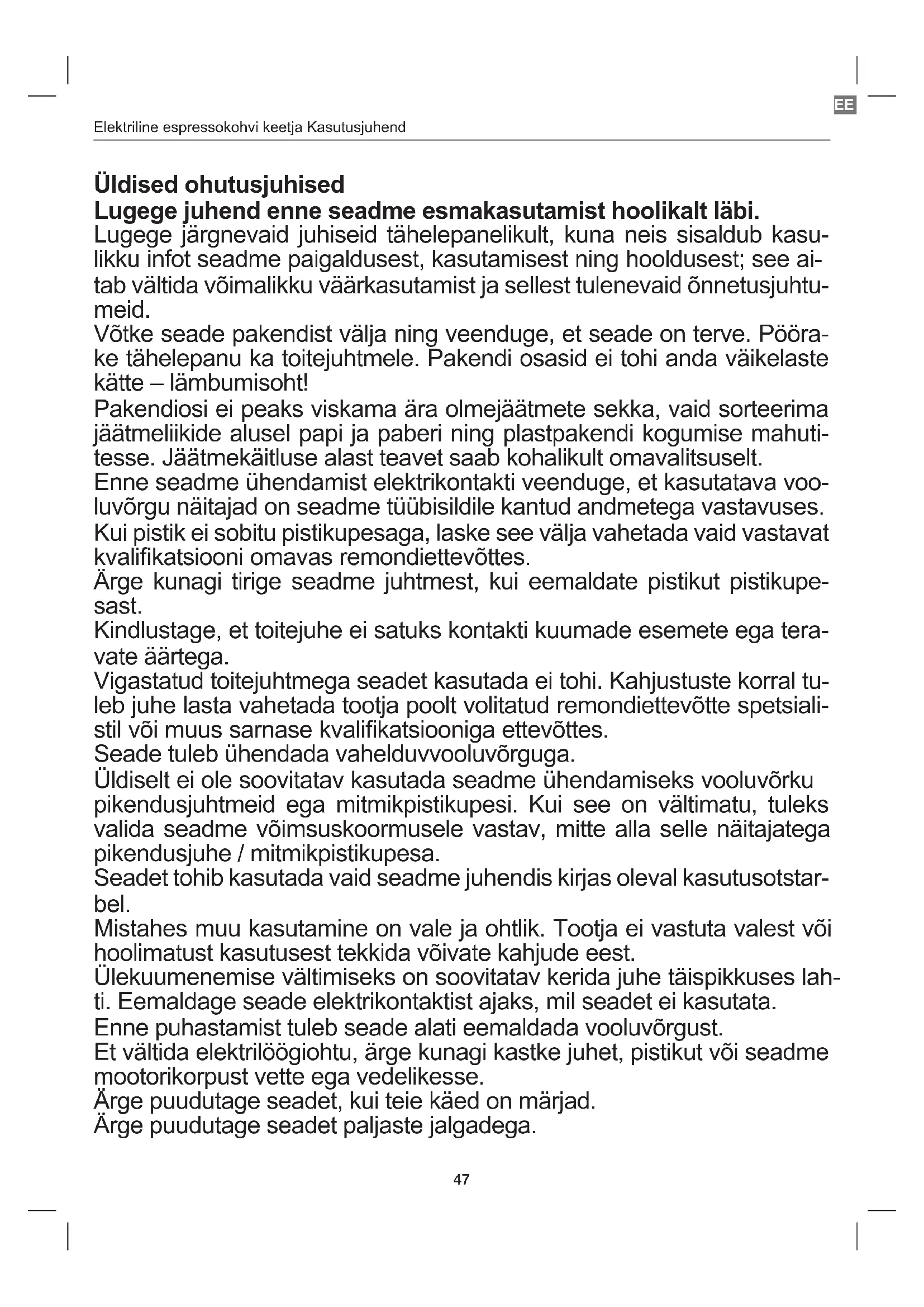Üldised ohutusjuhised Lugege juhend enne seadme esmakasutamist hoolikalt läbi. Lugege järgnevaid juhiseid tähelepanelikult, kuna neis sisaldub kasu- likku infot seadme paigaldusest, kasutamisest ning hooldusest; see ai- tab vältida võimalikku väärkasutamist ja sellest tulenevaid õnnetusjuhtu- meid. Võtke seade pakendist välja ning veenduge, et seade on terve. Pööra- ke tähelepanu ka toitejuhtmele. Pakendi osasid ei tohi anda väikelaste kätte – lämbumisoht! Pakendiosi ei peaks viskama ära olmejäätmete sekka, vaid sorteerima jäätmeliikide alusel papi ja paberi ning plastpakendi kogumise mahuti- tesse. Jäätmekäitluse alast teavet saab kohalikult omavalitsuselt. Enne seadme ühendamist elektrikontakti veenduge, et kasutatava voo- luvõrgu näitajad on seadme tüübisildile kantud andmetega vastavuses. Kui pistik ei sobitu pistikupesaga, laske see välja vahetada vaid vastavat kvalikatsiooni omavas remondiettevõttes. Ärge kunagi tirige seadme juhtmest, kui eemaldate pistikut pistikupe- sast. Kindlustage, et toitejuhe ei satuks kontakti kuumade esemete ega tera- vate äärtega. Vigastatud toitejuhtmega seadet kasutada ei tohi. Kahjustuste korral tu- leb juhe lasta vahetada tootja poolt volitatud remondiettevõtte spetsiali- stil või muus sarnase kvalikatsiooniga ettevõttes. Seade tuleb ühendada vahelduvvooluvõrguga. Üldiselt ei ole soovitatav kasutada seadme ühendamiseks vooluvõrku pikendusjuhtmeid ega mitmikpistikupesi. Kui see on vältimatu, tuleks valida seadme võimsuskoormusele vastav, mitte alla selle näitajatega pikendusjuhe / mitmikpistikupesa. Seadet tohib kasutada vaid seadme juhendis kirjas oleval kasutusotstar- bel. Mistahes muu kasutamine on vale ja ohtlik. Tootja ei vastuta valest või hoolimatust kasutusest tekkida võivate kahjude eest. Ülekuumenemise vältimiseks on soovitatav kerida juhe täispikkuses lah- ti. Eemaldage seade elektrikontaktist ajaks, mil seadet ei kasutata. Enne puhastamist tuleb seade alati eemaldada vooluvõrgust. Et vältida elektrilöögiohtu, ärge kunagi kastke juhet, pistikut või seadme mootorikorpust vette ega vedelikesse. Ärge puudutage seadet, kui teie käed on märjad. Ärge puudutage seadet paljaste jalgadega.48 Elektriline espressokohvi keetja Kasutusjuhend Seadet ei tohi jätta ilmastikutingimuste mõju alla (sademed, niiskus, äär- muslikud temperatuurid). Ärge kasutage seadet plahvatusohtlike, ülisüttivate ainete, põlevate ga- aside ega lahtise tule või kuumusallikate läheduses. Lastel, vähevõimekatel isikutel või ilma tehnilise ko- gemustega isikutel ei tohi lubada seadet kasutada, kui keegi neid selles ei abista ega juhenda. Tähelepa- nelikkus on vajalik, kui seade on töötamas väikelaste juuresolekul. Lapsed ei tohi seadmega mängida. Kui seade kõrvaldatakse kasutuselt, tehke see mit- tekasutatavaks juhtme äralõikamise teel, pärast voo- luvõrgust eemaldamist. Muutke kõik ohtlikud osad lastele ohututeks. Ohutusjuhised Lugege juhiseid enne seadme kasutusele võtmist hoolikalt. Eemaldage seade pakendist ja veenduge, et seade on terve ning kõik selle osad on komplektis. Pakendi osi ei tohi anda väikelaste kätte. Käidelge pakend vastavalt kohalikule jäätmeseadusele. Enne seadme ühendamist vooluvõrku tuleb veenduda, et kasutatava vooluvõrgu näitajad vastavad seadme tüübisildi andmetele tarbitava toi- te kohta. Kindlustage, et toitejuhe ei saaks vigastada mehaaniliselt ega termiliselt. Ärge kasutage kahjustunud toitejuhtmega seadet. Defektse toitejuhtmega elektriseadet kasutada ei tohi. Kahjustuste kor- ral tuleb juhe lasta vastava kvalikatsiooniga remondiettevõttes vaheta- da terve juhtme vastu. Seade ühendatakse vahelduvvooluvõrku. Üldiselt pole soovitatav ühendada seadet elektrikontakti pikendusjuhtme kaudu. Kui see siiski on vältimatu, kasutage pikendusjuhet, mille koor- musnäitajad on vastavuses seadme tarbimisvõimsusega, et ei tekiks juhtme ülekuumenemisest tulenevaid ohte. Seadet tohib kasutada ainult juhendis kirjeldatud otstarbel. Mistahes muu kasutusviis on ebaõige ja ohtlik. Tootja keeldub vastu- tusest mistahes võimalike kahjude osas, mis tulenevad seadme valest kasutamisest ja/või kasutusjuhendi juhiste eiramisest.49 Elektriline espressokohvi keetja Kasutusjuhend