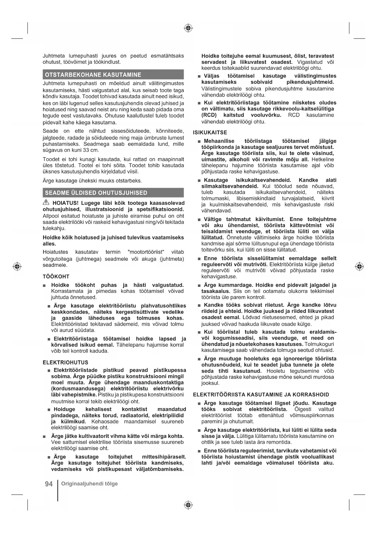 Originaaljuhendi tõlgeNeed ennetavad ohutusmeetmed vähendavad tööriista tahtmatu käivitumise riski. ■ Hoidke kasutuses mitteolevaid elektritööriistu lastele kättesaamatus kohas ja ärge lubage elektritööriista mitte tundvaid või kasutusjuhendiga mitte tutvunud isikuid elektritööriista kasutada. Oskamatu kasutaja käes olev elektritööriist on ohtlik. ■ Hooldage elektritööriistu ja tarvikuid. Kontrollige liikuvate osade mittetsentreeritust ja kinnitumist, osade vigastusi ning tehke kindlaks muud seisundid, mis võivad mõjustada elektritööriista tööd. Kui mõni osa on vigastatud, siis laske elektritööriist enne kasutamist ära parandada. Halvasti hooldatud elektritööriistad põhjustavad palju õnnetusi. ■ Hoidke lõiketerad teravad ja puhtad. Teravate lõiketeradega ja nõuetekohaselt hooldatud lõikeriistad jäävad harvemini kinni ning neid on kergem kontrolli all hoida. ■ Tööriistade, tarvikute, otsakute ja muude lisaseadmete kasutamisel juhinduge nende kasutusjuhenditest, võttes arvesse tehtavat tööd ja tööolusid. Tööoperatsiooniks mitte ettenähtud tööriista kasutamine võib tekitada ohtliku olukorra. ■ Hoidke tööriista käepidemed ja haardepinnad kuivana, puhtana ja ärge laske neile sattuda õli või määret. Libedad käepidemed ja haardepinnad ei võimalda tööriista turvaliselt haarata ja ootamatutes olukordades kontrollida.