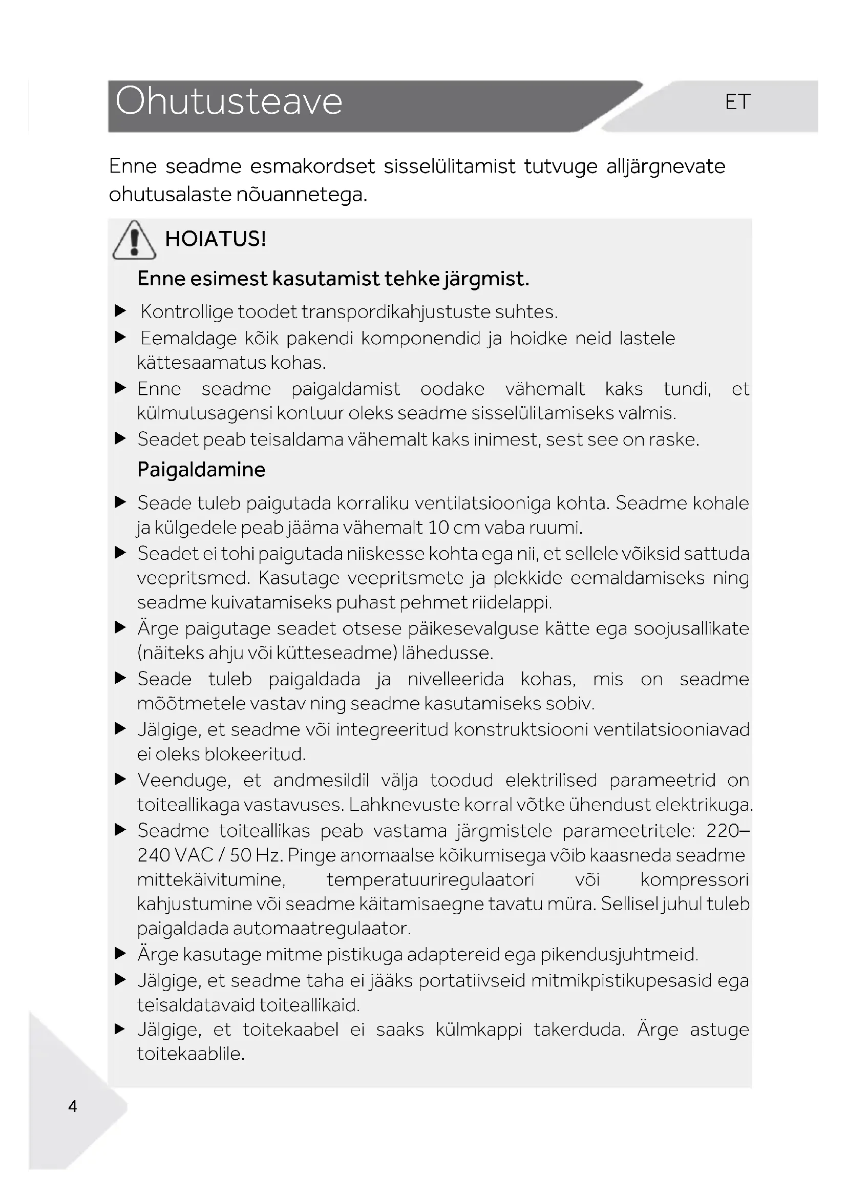 HOIATUS! Enne esimest kasutamist tehke järgmist. Kontrollige toodet transpordikahjustuste suhtes. Eemaldage kõik pakendi komponendid ja hoidke neid lastele kättesaamatus kohas. Enne seadme paigaldamist oodake vähemalt kaks tundi, et külmutusagensi kontuur oleks seadme sisselülitamiseks valmis. Seadet peab teisaldama vähemalt kaks inimest, sest see on raske. Paigaldamine Seade tuleb paigutada korraliku ventilatsiooniga kohta. Seadme kohale ja külgedele peab jääma vähemalt 10 cm vaba ruumi. Seadet ei tohi paigutada niiskesse kohta ega nii, et sellele võiksid sattuda veepritsmed. Kasutage veepritsmete ja plekkide eemaldamiseks ning seadme kuivatamiseks puhast pehmet riidelappi. Ärge paigutage seadet otsese päikesevalguse kätte ega soojusallikate (näiteks ahju või kütteseadme) lähedusse. Seade tuleb paigaldada ja nivelleerida kohas, mis on seadme mõõtmetele vastav ning seadme kasutamiseks sobiv. Jälgige, et seadme või integreeritud konstruktsiooni ventilatsiooniavad ei oleks blokeeritud. Veenduge, et andmesildil välja toodud elektrilised parameetrid on toiteallikaga vastavuses. Lahknevuste korral võtke ühendust elektrikuga. Seadme toiteallikas peab vastama järgmistele parameetritele: 220– 240 VAC / 50 Hz. Pinge anomaalse kõikumisega võib kaasneda seadme mittekäivitumine, temperatuuriregulaatori või kompressori kahjustumine või seadme käitamisaegne tavatu müra. Sellisel juhul tuleb paigaldada automaatregulaator. Ärge kasutage mitme pistikuga adaptereid ega pikendusjuhtmeid. Jälgige, et seadme taha ei jääks portatiivseid mitmikpistikupesasid ega teisaldatavaid toiteallikaid. Jälgige, et toitekaabel ei saaks külmkappi takerduda. Ärge astuge toitekaablile.Ohutusteave
