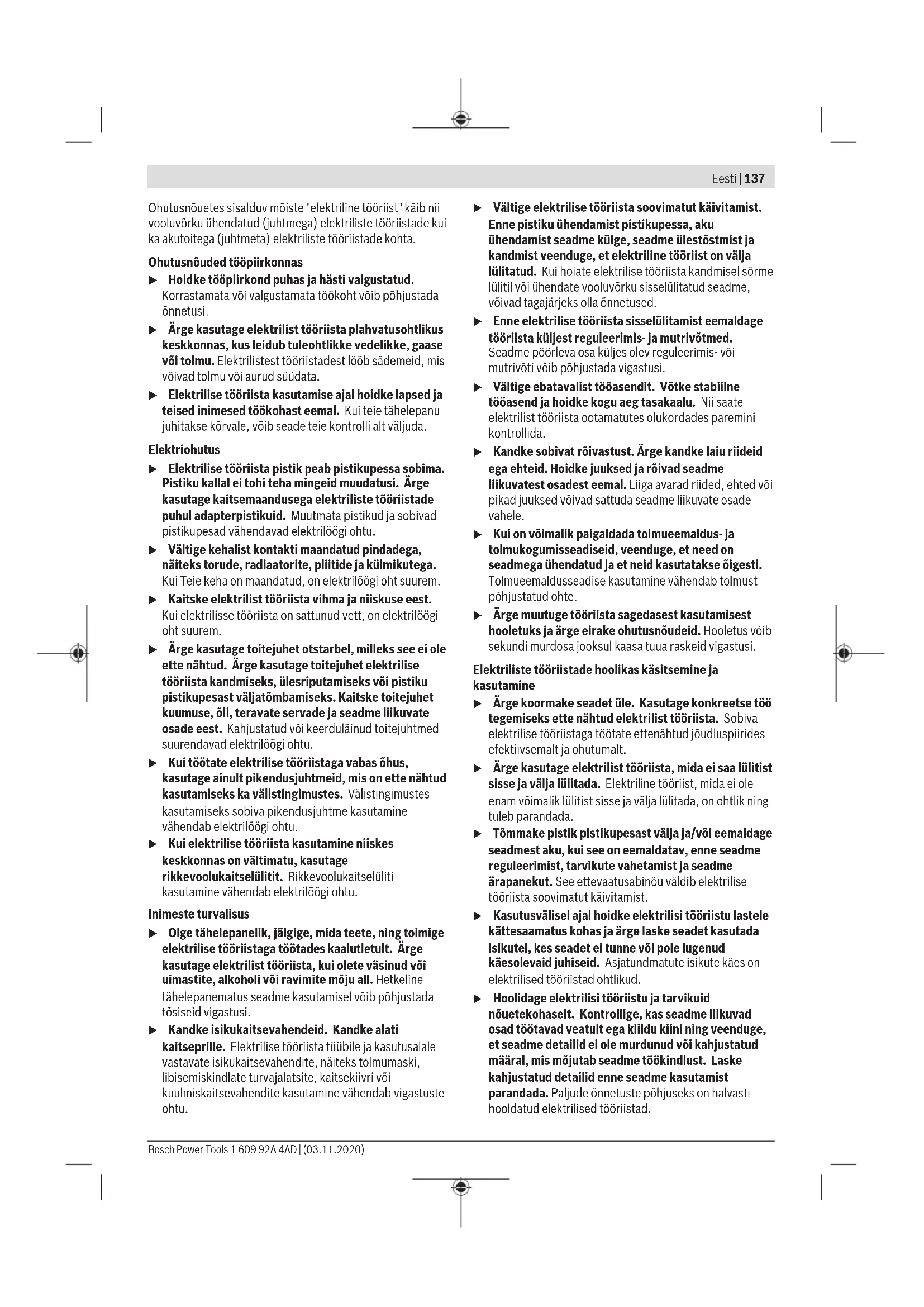 Kutiju za prašinu (2) stavite na nastavak za ispuhivanje (14). Stanje napunjenosti kutije za prašinu (2) možete lako provjeriti kroz prozirni spremnik. Za pražnjenje kutije za prašinu (2) lagano je okrećući izvucite prema natrag. Odvijte uložak filtra (15) s kutije za prašinu (2). Ispraznite kutiju za prašinu. Lagano protresite uložak filtra (15) na čvrstoj podlozi kako biste odvojili prašinu. Lamele uloška filtra (15) očistite mekom četkom. Napomena: Kako bi se osiguralo optimalno usisavanje prašine, pravovremeno ispraznite kutiju za prašinu (2) i redovito čistite uložak filtra (15). Bosch Power Tools 1 609 92A 4AD | (03.11.2020)136 | Eesti Pri radu na okomitim površinama električni alat držite tako da je kutija za prašinu (2) okrenuta prema dolje. Vanjsko usisavanje (vidjeti sliku K) Nataknite usisno crijevo (16) (pribor) na nastavak za ispuhivanje (14). Spojite usisno crijevo (16) s usisavačem (pribor). Usisavač mora biti prikladan za obrađivani materijal. Kod usisavanja suhe prašine ili prašine koja je posebno opasna za zdravlje i kancerogena, treba koristiti specijalni usisavač. Pri radu na okomitim površinama električni alat držite tako da je usisno crijevo okrenuto prema dolje. Rad Puštanje u rad u Pridržavajte se mrežnog napona! Napon izvora struje mora se podudarati s podacima na tipskoj pločici električnog alata. Električni alati označeni sa 230V mogu raditi i na 220V. Uključivanje/isključivanje u Provjerite možete li pritisnuti prekidač za uključivanje/isključivanje bez otpuštanja ručke. Za uključivanje električnog alata pritisnite prekidač za uključivanje/isključivanje (1) udesno u položaj „I“. Za isključivanje električnog alata pritisnite prekidač za uključivanje/isključivanje (1) ulijevo u položaj „O“. Upute za rad u Prije svih radova na električnom alatu izvucite mrežni utikač iz utičnice. u Prije odlaganja električnog alata pričekajte da se zaustavi. Učinak skidanja materijala s površine kod brušenja u biti se određuje izborom brusnog lista. Samo besprijekorni brusni listovi daju dobar učinak brušenja i čuvaju električni alat. Pazite na jednolični pritisak kako bi se produljio vijek trajanja brusnih listova. Prekomjernim povećanjem pritiska ne povećava se učinak brušenja, nego dolazi do jačeg trošenja električnog alata i brusnog lista. Brusni list kojim je obrađivan metal ne koristite više za obradu drugih materijala. Koristite samo originalni Bosch pribor za brušenje. Održavanje i servisiranje Održavanje i čišćenje u Prije svih radova na električnom alatu izvucite mrežni utikač iz utičnice. u Električni alat i otvore za hlađenje održavajte čistima kako bi se moglo dobro i sigurno raditi. Ako je potrebna zamjena priključnog kabela, tada je treba provesti u Bosch servisu ili u ovlaštenom servisu za Bosch električne alate kako bi se izbjeglo ugrožavanje sigurnosti. Servisna služba i savjeti o uporabi Naša servisna služba će odgovoriti na vaša pitanja o popravku i održavanju vašeg proizvoda, kao i o rezervnim dijelovima. Crteže u rastavljenom obliku i informacije o rezervnim dijelovima možete naći i na našoj adresi: www.bosch-pt.com Tim Bosch savjetnika o uporabi rado će odgovoriti na vaša pitanja o našim proizvodima i njihovom priboru. U slučaju upita ili naručivanja rezervnih dijelova, molimo vas obavezno navedite 10‑znamenkasti kataloški broj s tipske pločice proizvoda. Hrvatski Robert Bosch d.o.o PT/SHR-BSC Kneza Branimira 22 10040 Zagreb Tel.: +385 12 958 051 Fax: +385 12 958 050 E-Mail: RBKN-bsc@hr.bosch.com www.bosch.hr Ostale adrese servisa možete pronaći na: www.bosch-pt.com/serviceaddresses Zbrinjavanje Električne alate, pribor i ambalažu treba dovesti na ekološki prihvatljivo recikliranje. Električne alate ne bacajte u kućni otpad! Samo za zemljeEU: Sukladno europskoj Direktivi 2012/19/EU za električne i elektroničke stare uređaje električni alati, koji više nisu uporabivi, moraju se odvojeno sakupljati i dovesti na ekološki prihvatljivo recikliranje. Eesti Ohutusnõuded Üldised ohutusnõuded elektriliste tööriistade kasutamisel HOIATUS Lugege läbi kõik tööriistaga kaasas olevad ohutusnõuded ja juhised ning tutvuge kõigi jooniste ja spetsifikatsioonidega. Ohutusnõuete ja juhiste eiramise tagajärjeks võib olla elektrilöök, tulekahju ja/või rasked vigastused. Hoidke kõik ohutusnõuded ja juhised edasiseks kasutamiseks hoolikalt alles. 1 609 92A 4AD | (03.11.2020) Bosch Power ToolsEesti | 137 Ohutusnõuetes sisalduv mõiste "elektriline tööriist" käib nii vooluvõrku ühendatud (juhtmega) elektriliste tööriistade kui ka akutoitega (juhtmeta) elektriliste tööriistade kohta. Ohutusnõuded tööpiirkonnas u Hoidke tööpiirkond puhas ja hästi valgustatud. Korrastamata või valgustamata töökoht võib põhjustada õnnetusi. u Ärge kasutage elektrilist tööriista plahvatusohtlikus keskkonnas, kus leidub tuleohtlikke vedelikke, gaase või tolmu. Elektrilistest tööriistadest lööb sädemeid, mis võivad tolmu või aurud süüdata. u Elektrilise tööriista kasutamise ajal hoidke lapsed ja teised inimesed töökohast eemal. Kui teie tähelepanu juhitakse kõrvale, võib seade teie kontrolli alt väljuda. Elektriohutus u Elektrilise tööriista pistik peab pistikupessa sobima. Pistiku kallal ei tohi teha mingeid muudatusi. Ärge kasutage kaitsemaandusega elektriliste tööriistade puhul adapterpistikuid. Muutmata pistikud ja sobivad pistikupesad vähendavad elektrilöögi ohtu. u Vältige kehalist kontakti maandatud pindadega, näiteks torude, radiaatorite, pliitide ja külmikutega. Kui Teie keha on maandatud, on elektrilöögi oht suurem. u Kaitske elektrilist tööriista vihma ja niiskuse eest. Kuielektrilisse tööriista on sattunud vett, on elektrilöögi oht suurem. u Ärge kasutage toitejuhet otstarbel, milleks see ei ole ette nähtud. Ärge kasutage toitejuhet elektrilise tööriista kandmiseks, ül