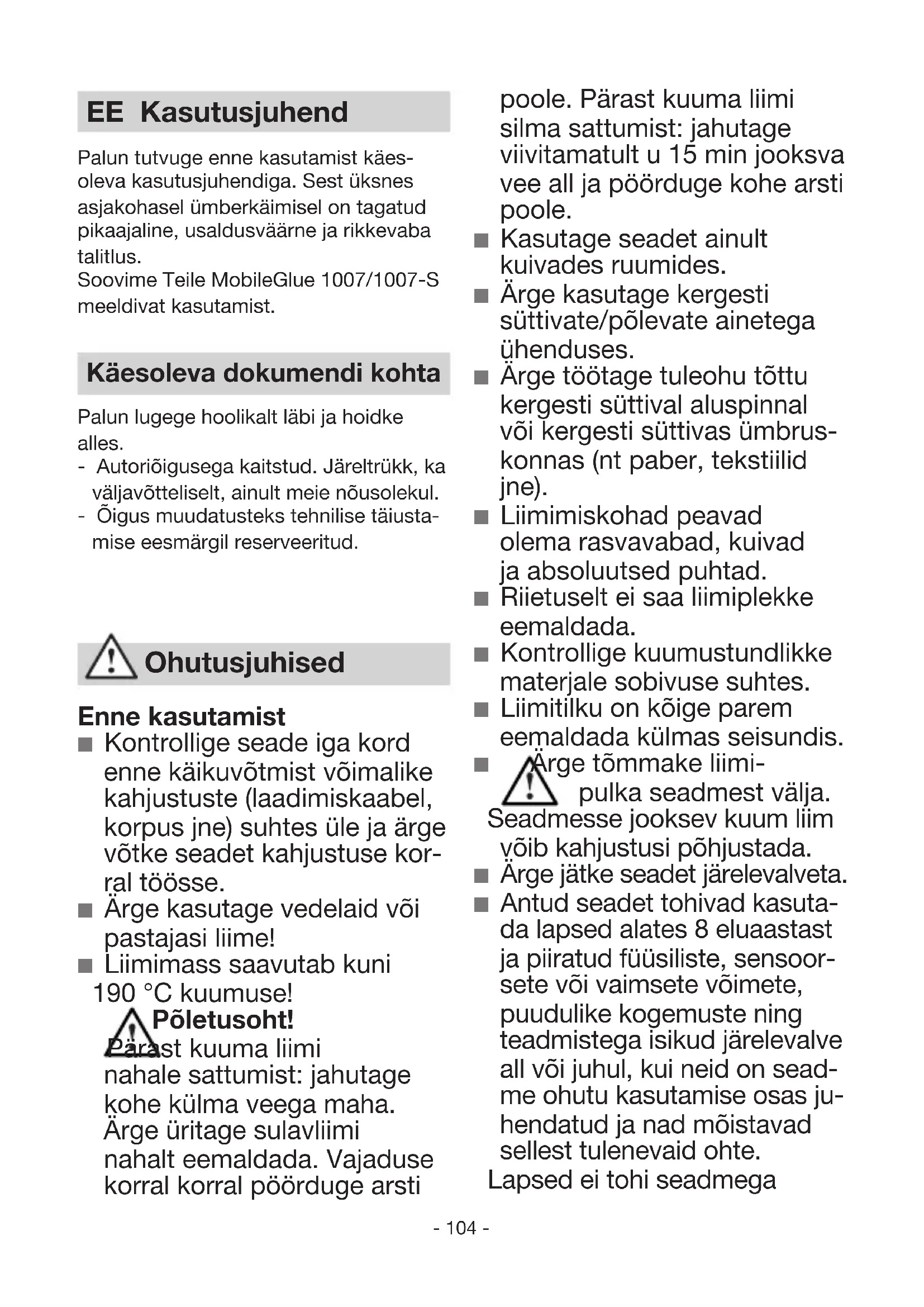 GODINA JAMSTVA Zbrinjavanje HR- 104 - EE Kasutusjuhend Palun tutvuge enne kasutamist käes- oleva kasutusjuhendiga. Sest üksnes asjakohasel ümberkäimisel on tagatud pikaajaline, usaldusväärne ja rikkevaba talitlus. Soovime Teile MobileGlue 1007/1007-S meeldivat kasutamist. Käesoleva dokumendi kohta Palun lugege hoolikalt läbi ja hoidke alles. - Autoriõigusega kaitstud. Järeltrükk, ka väljavõtteliselt, ainult meie nõusolekul. - Õigus muudatusteks tehnilise täiusta- mise eesmärgil reserveeritud. Enne kasutamist ■ Kontrollige seade iga kord enne käikuvõtmist võimalike kahjustuste (laadimiskaabel, korpus jne) suhtes üle ja ärge võtke seadet kahjustuse kor- ral töösse. ■ Ärge kasutage vedelaid või pastajasi liime! ■ Liimimass saavutab kuni 190 °C kuumuse! Põletusoht! Pärast kuuma liimi nahale sattumist: jahutage kohe külma veega maha. Ärge üritage sulavliimi nahalt eemaldada. Vajaduse korral korral pöörduge arsti Ohutusjuhised poole. Pärast kuuma liimi silma sattumist: jahutage viivitamatult u 15 min jooksva vee all ja pöörduge kohe arsti poole. ■ Kasutage seadet ainult kuivades ruumides. ■ Ärge kasutage kergesti süttivate/põlevate ainetega ühenduses. ■ Ärge töötage tuleohu tõttu kergesti süttival aluspinnal või kergesti süttivas ümbrus- konnas (nt paber, tekstiilid jne). ■ Liimimiskohad peavad olema rasvavabad, kuivad ja absoluutsed puhtad. ■ Riietuselt ei saa liimiplekke eemaldada. ■ Kontrollige kuumustundlikke materjale sobivuse suhtes. ■ Liimitilku on kõige parem eemaldada külmas seisundis. ■ Ärge tõmmake liimi- pulka seadmest välja. Seadmesse jooksev kuum liim võib kahjustusi põhjustada. ■ Ärge jätke seadet järelevalveta. ■ Antud seadet tohivad kasuta- da lapsed alates 8 eluaastast ja piiratud füüsiliste, sensoor- sete või vaimsete võimete, puudulike kogemuste ning teadmistega isikud järelevalve all või juhul, kui neid on sead- me ohutu kasutamise osas ju- hendatud ja nad mõistavad sellest tulenevaid ohte. Lapsed ei tohi seadmega- 105 - mängida. Puhastust ja kasu- tajapoolset hooldust ei tohi lapsed järelevalveta teostada. ■ Laitmatu talitlus tagatakse üksnes STEINELi originaal- pulkadega kasutamisel. USB laadimiskaabel ■ Hoidke laadimiskaabel pu- has. Määrdumise tõttu valit- seb elektrilöögi oht.