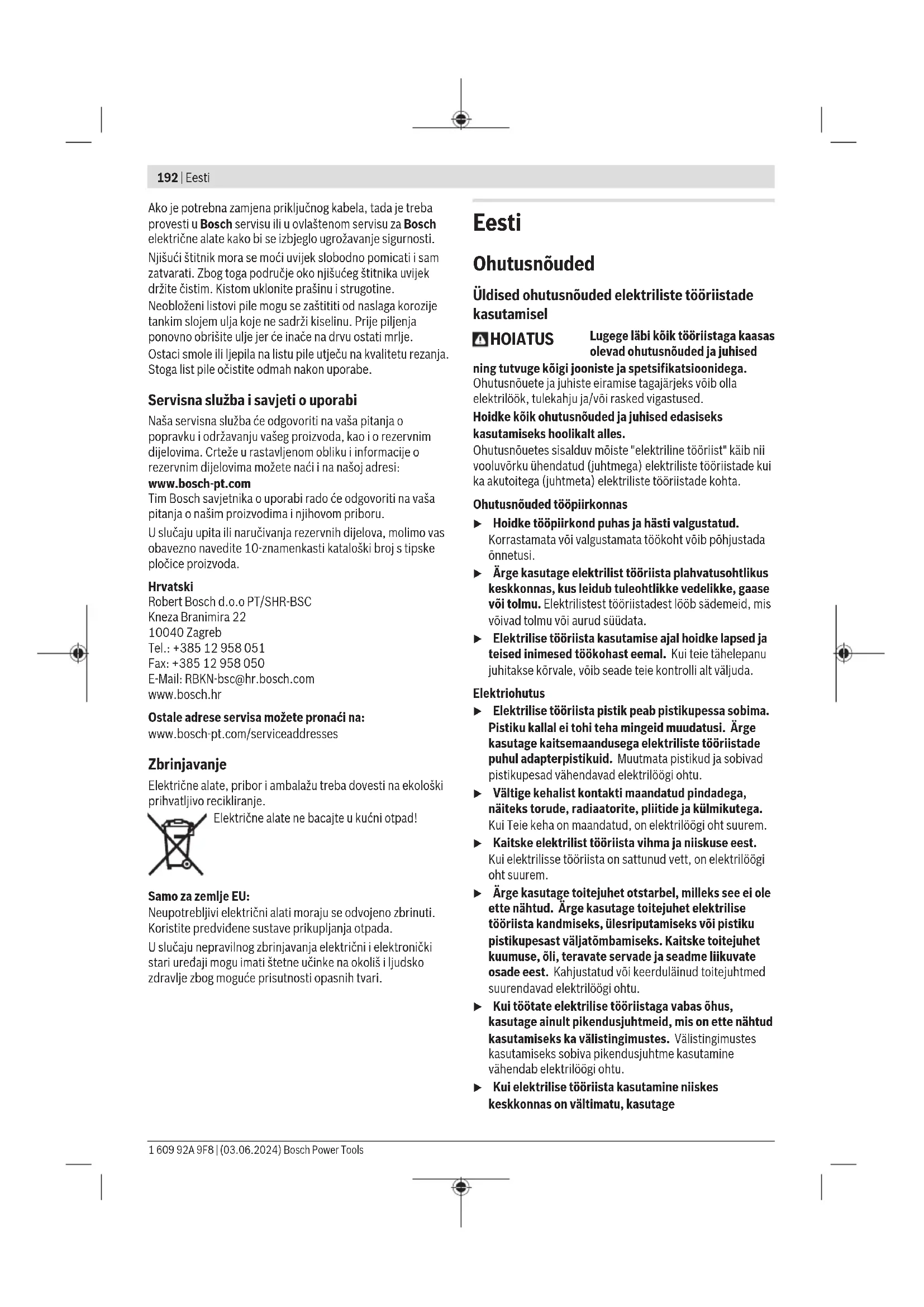 Oznaka rezanja 0° (9) prikazuje položaj lista pile kod pravokutnog reza. Oznaka rezanja 45° (8) prikazuje položaj lista pile kod reza pod 45°. Za rezanje točno na mjeru postavite kružnu pilu na izradak kao što je prikazano na slici. Najbolje provedite probno rezanje. Puštanje u rad u Pridržavajte se mrežnog napona! Napon izvora struje mora se podudarati s podacima na tipskoj pločici električnog alata. Uključivanje/isključivanje Za puštanje električnog alata u rad pritisnite najprije blokadu uključivanja (2) i zatim pritisnite prekidač za uključivanje/isključivanje (1) i držite pritisnut. Za isključivanje električnog alata otpustite prekidač za uključivanje/isključivanje (1). Napomena: Iz sigurnosnih razloga ne može se blokirati prekidač za uključivanje/isključivanje (1), nego tijekom rada mora stalno ostati pritisnut. Upute za rad u Prije svih radova na električnom alatu izvucite mrežni utikač iz utičnice. Širina rezanja varira ovisno o korištenom listu pile. Zaštitite list pile od udaraca. Pomičite električni alat ravnomjerno i laganim potiskom u smjeru reza da biste dobili dobru kvalitetu reza. Prejako pomicanje znatno smanjuje životni vijek radnih alata i može štetiti električnom alatu. Uvijek radite jednoličnim pomakom i pazite da broj okretaja lista pile ostane stalan. Izbjegavajte povećanje pomaka (npr.pri obradi mokrog drva, drva tretiranim pod tlakom ili granja) i s tim povezanim smanjenjem broja okretaja kako biste izbjegli pregrijavanje zubaca lista pile. Učinak piljenja i kvaliteta reza uglavnom ovise o stanju i obliku zubaca lista pile. Stoga koristite samo oštre listove pile koji su prikladni za obrađivani materijal. Kada započinjete ili nastavljate rezanje, centrirajte list pile u rasporu piljenja i pazite da zupci pile nisu zaglavljeni u izratku. Tako ćete izbjeći povratni udarac ili da list pile iskoči iz izratka. Piljenje drva Pravilan izbor lista pile ravna se prema vrsti drva, kvaliteti drva i prema tome radi li se o uzdužnom ili poprečnom rezanju. Kod uzdužnog rezanja smreke nastaju duge strugotine u obliku spirale. Prašina od bukve ili hrastovine je posebno štetna po zdravlje, stoga radite samo s usisavačem. Piljenje s paralelnim graničnikom (vidjeti sliku D) Paralelni graničnik (10) omogućuje izvođenje točnih rezova uz rub izratka odn. rezanje po mjeri jednakih letvica. Otpustite krilni vijak (7) i gurnite skalu paralelnog graničnika (10) kroz vodilicu u osnovnu ploču (12). Namjestite željenu širinu rezanja kao vrijednost skale na odgovarajućoj oznaci rezanja (9) odn. (8), vidjeti odlomak „Oznake rezanja“. Ponovno stegnite krilni vijak (7). Piljenje s pomoćnim graničnikom (vidjeti slike E) Za obradu velikih izradaka ili za rezanje ravnih rubova, možete na izradak pričvrstiti dasku ili letvu kao pomoćni graničnik i kružnu pilu voditi uzduž osnovne ploče kao pomoćnim graničnikom. Održavanje i servisiranje Održavanje i čišćenje u Prije svih radova na električnom alatu izvucite mrežni utikač iz utičnice. u Električni alat i otvore za hlađenje održavajte čistima kako bi se moglo dobro i sigurno raditi. Bosch Power Tools 1 609 92A 9F8 | (03.06.2024)192 | Eesti Ako je potrebna zamjena priključnog kabela, tada je treba provesti u Bosch servisu ili u ovlaštenom servisu za Bosch električne alate kako bi se izbjeglo ugrožavanje sigurnosti. Njišući štitnik mora se moći uvijek slobodno pomicati i sam zatvarati. Zbog toga područje oko njišućeg štitnika uvijek držite čistim. Kistom uklonite prašinu i strugotine. Neobloženi listovi pile mogu se zaštititi od naslaga korozije tankim slojem ulja koje ne sadrži kiselinu. Prije piljenja ponovno obrišite ulje jer će inače na drvu ostati mrlje. Ostaci smole ili ljepila na listu pile utječu na kvalitetu rezanja. Stoga list pile očistite odmah nakon uporabe. Servisna služba i savjeti o uporabi Naša servisna služba će odgovoriti na vaša pitanja o popravku i održavanju vašeg proizvoda, kao i o rezervnim dijelovima. Crteže u rastavljenom obliku i informacije o rezervnim dijelovima možete naći i na našoj adresi: www.bosch-pt.com Tim Bosch savjetnika o uporabi rado će odgovoriti na vaša pitanja o našim proizvodima i njihovom priboru. U slučaju upita ili naručivanja rezervnih dijelova, molimo vas obavezno navedite 10‑znamenkasti kataloški broj s tipske pločice proizvoda. Hrvatski Robert Bosch d.o.o PT/SHR-BSC Kneza Branimira 22 10040 Zagreb Tel.: +385 12 958 051 Fax: +385 12 958 050 E-Mail: RBKN-bsc@hr.bosch.com www.bosch.hr Ostale adrese servisa možete pronaći na: www.bosch-pt.com/serviceaddresses Zbrinjavanje Električne alate, pribor i ambalažu treba dovesti na ekološki prihvatljivo recikliranje. Električne alate ne bacajte u kućni otpad! Samo za zemljeEU: Neupotrebljivi električni alati moraju se odvojeno zbrinuti. Koristite predviđene sustave prikupljanja otpada. U slučaju nepravilnog zbrinjavanja električni i elektronički stari uređaji mogu imati štetne učinke na okoliš i ljudsko zdravlje zbog moguće prisutnosti opasnih tvari. Eesti Ohutusnõuded Üldised ohutusnõuded elektriliste tööriistade kasutamisel HOIATUS Lugege läbi kõik tööriistaga kaasas olevad ohutusnõuded ja juhised ning tutvuge kõigi jooniste ja spetsifikatsioonidega. Ohutusnõuete ja juhiste eiramise tagajärjeks võib olla elektrilöök, tulekahju ja/või rasked vigastused. Hoidke kõik ohutusnõuded ja juhised edasiseks kasutamiseks hoolikalt alles. Ohutusnõuetes sisalduv mõiste "elektriline tööriist" käib nii vooluvõrku ühendatud (juhtmega) elektriliste tööriistade kui ka akutoitega (juhtmeta) elektriliste tööriistade kohta. Ohutusnõuded tööpiirkonnas u Hoidke tööpiirkond puhas ja hästi valgustatud. Korrastamata või valgustamata töökoht võib põhjustada õnnetusi. u Ärge kasutage elektrilist tööriista plahvatusohtlikus keskkonnas, kus leidub tuleohtlikke vedelikke, gaase või tolmu. Elekt