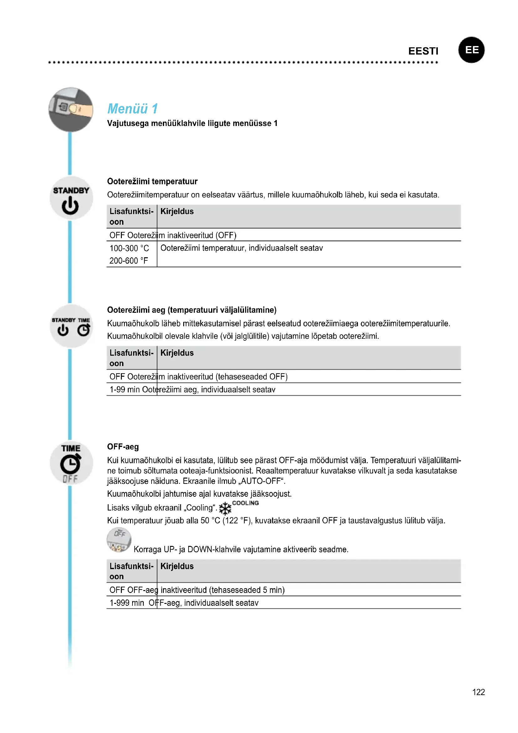 SLOVENŠČINA122 Menüü 1 Vajutusega menüüklahvile liigute menüüsse 1 Ooterežiimi temperatuur Ooterežiimitemperatuur on eelseatav väärtus, millele kuumaõhukolb läheb, kui seda ei kasutata. Lisafunktsi- oon Kirjeldus OFF Ooterežiim inaktiveeritud (OFF) 100-300 °C 200-600 °F Ooterežiimi temperatuur, individuaalselt seatav Ooterežiimi aeg (temperatuuri väljalülitamine) Kuumaõhukolb läheb mittekasutamisel pärast eelseatud ooterežiimiaega ooterežiimitemperatuurile. Kuumaõhukolbil olevale klahvile (või jalglülitile) vajutamine lõpetab ooterežiimi. Lisafunktsi- oon Kirjeldus OFF Ooterežiim inaktiveeritud (tehaseseaded OFF) 1-99 min Ooterežiimi aeg, individuaalselt seatav OFF-aeg Kui kuumaõhukolbi ei kasutata, lülitub see pärast OFF-aja möödumist välja. Temperatuuri väljalülitami- ne toimub sõltumata ooteaja-funktsioonist. Reaaltemperatuur kuvatakse vilkuvalt ja seda kasutatakse jääksoojuse näiduna. Ekraanile ilmub „AUTO-OFF“. Kuumaõhukolbi jahtumise ajal kuvatakse jääksoojust. Lisaks vilgub ekraanil „Cooling“. Kui temperatuur jõuab alla 50 °C (122 °F), kuvatakse ekraanil OFF ja taustavalgustus lülitub välja. Korraga UP- ja DOWN-klahvile vajutamine aktiveerib seadme. Lisafunktsi- oon Kirjeldus OFF OFF-aeg inaktiveeritud (tehaseseaded 5 min) 1-999 min OFF-aeg, individuaalselt seatav
