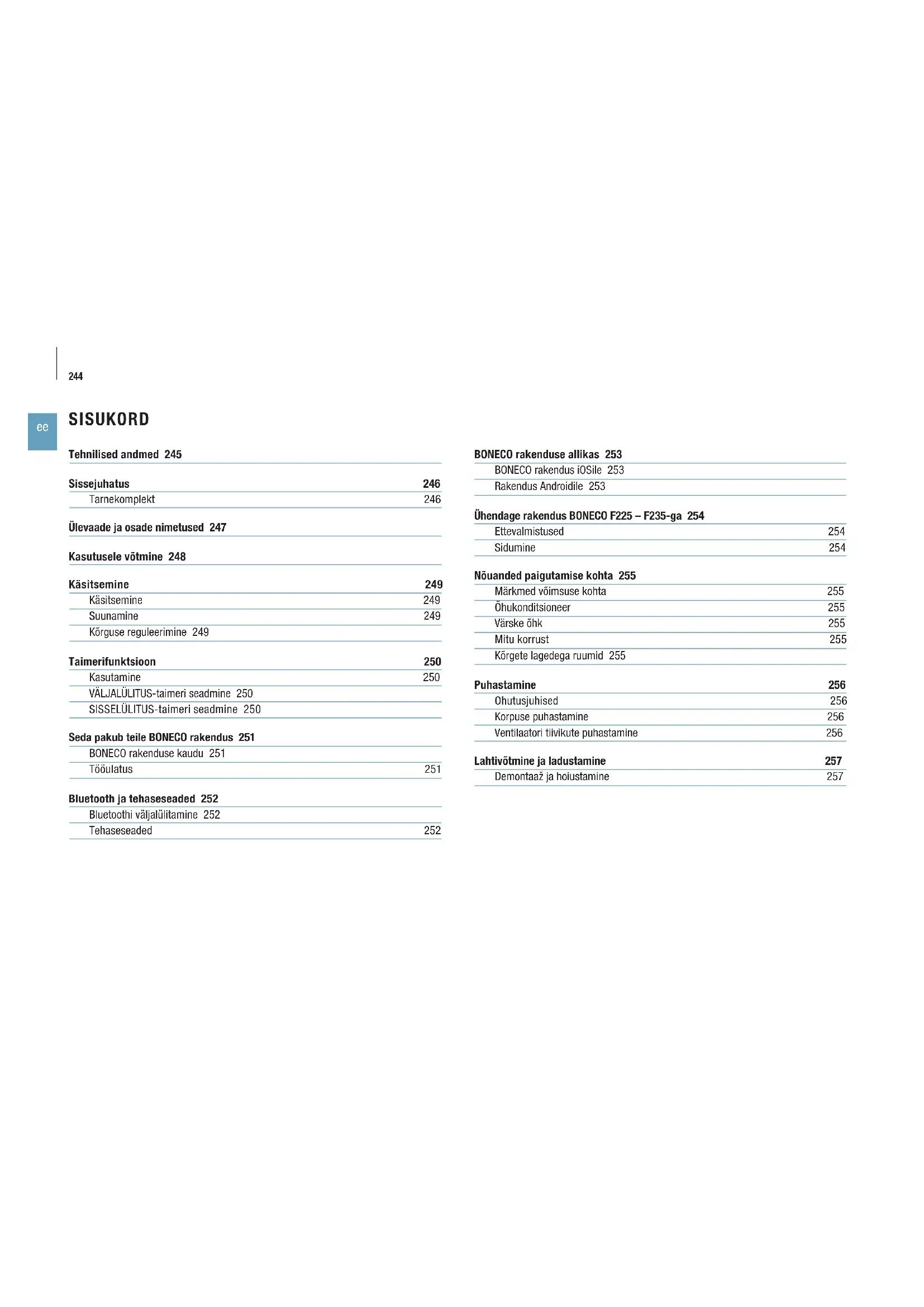 SISUKORD Tehnilised andmed 245 Sissejuhatus 246 Tarnekomplekt 246 Ülevaade ja osade nimetused 247 Kasutusele võtmine 248 Käsitsemine 249 Käsitsemine 249 Suunamine 249 Kõrguse reguleerimine 249 Taimerifunktsioon 250 Kasutamine 250 VÄLJALÜLITUS-taimeri seadmine 250 SISSELÜLITUS-taimeri seadmine 250 Seda pakub teile BONECO rakendus 251 BONECO rakenduse kaudu 251 Tööulatus 251 Bluetooth ja tehaseseaded 252 Bluetoothi väljalülitamine 252 Tehaseseaded 252 BONECO rakenduse allikas 253 BONECO rakendus iOSile 253 Rakendus Androidile 253 Ühendage rakendus BONECO F225 – F235-ga 254 Ettevalmistused 254 Sidumine 254 Nõuanded paigutamise kohta 255 Märkmed võimsuse kohta 255 Õhukonditsioneer 255 Värske õhk 255 Mitu korrust 255 Kõrgete lagedega ruumid 255 Puhastamine 256 Ohutusjuhised 256 Korpuse puhastamine 256 Ventilaatori tiivikute puhastamine 256 Lahtivõtmine ja ladustamine 257 Demontaaž ja hoiustamine 257245