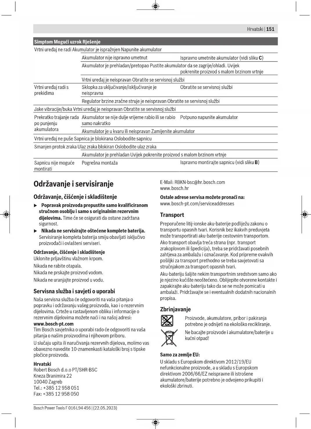 Simboli Sljedeći simboli važni su za čitanje i razumijevanje priručnika za uporabu. Zapamtite simbole i njihovo značenje. Ispravno tumačenje simbola pomoći će vam da bolje i sigurnije rabite proizvod. Simbol Značenje Smjer kretanja Uključivanje Isključivanje CLICK! Čujni zvuk Pribor Otklanjanje pogrešaka Sljedeća tablica prikazuje simptome pogrešaka i kako riješiti problem ako stroj ne radi ispravno. Ako time ne uspijete locirati i otkloniti problem, obratite se servisnoj radionici. Pozor: Isključite uređaj prije otklanjanja pogreške. Pozor: U slučaju nezgode ili loma alata odmah zaustavite stroj i izvadite akumulator. F 016 L94 456 | (22.05.2023) Bosch Power ToolsHrvatski | 151 Simptom Mogući uzrok Rješenje Vrtni uređaj ne radi Akumulator je ispražnjen Napunite akumulator Akumulator nije ispravno umetnut Ispravno umetnite akumulator (vidi sliku C) Akumulator je prehladan/pretopao Pustite akumulator da se zagrije/ohladi. Uvijek pokrenite proizvod s malom brzinom vrtnje Vrtni uređaj je neispravan Obratite se servisnoj službi Vrtni uređaj radi s prekidima Sklopka za uključivanje/isključivanje je neispravna Obratite se servisnoj službi Regulator brzine zračne struje je neispravan Obratite se servisnoj službi Jake vibracije/buka Vrtni uređaj je neispravan Obratite se servisnoj službi Prekratko trajanje rada po punjenju akumulatora Akumulator se nije dulje vrijeme rabio ili se rabio samo nakratko Potpuno napunite akumulator Akumulator je u kvaru ili neispravan Zamijenite akumulator Vrtni uređaj ne puše Sapnica je blokirana Oslobodite sapnicu Smanjen protok zraka Ulaz zraka blokiran Oslobodite ulaz zraka Akumulator je prehladan Uvijek pokrenite proizvod s malom brzinom vrtnje Sapnicu nije moguće montirati Pogrešna montaža Ispravno montirajte sapnicu (vidi sliku B) Održavanje i servisiranje Održavanje, čišćenje i skladištenje u Popravak proizvoda prepustite samo kvalificiranom stručnom osoblju i samo s originalnim rezervnim dijelovima. Time će se osigurati da ostane zadržana sigurnost. u Nikada ne servisirajte oštećene komplete baterija. Servisiranje kompleta baterija smiju obavljati isključivo proizvođači i ovlašteni serviseri. Održavanje, čišćenje i skladištenje Uklonite prljavštinu vlažnom krpom. Nikada ne rabite otapala. Nikada ne prskajte proizvod vodom. Nikada ne uranjajte proizvod u vodu. Servisna služba i savjeti o uporabi Naša servisna služba će odgovoriti na vaša pitanja o popravku i održavanju vašeg proizvoda, kao i o rezervnim dijelovima. Crteže u rastavljenom obliku i informacije o rezervnim dijelovima možete naći i na našoj adresi: www.bosch-pt.com Tim Bosch savjetnika o uporabi rado će odgovoriti na vaša pitanja o našim proizvodima i njihovom priboru. U slučaju upita ili naručivanja rezervnih dijelova, molimo vas obavezno navedite 10‑znamenkasti kataloški broj s tipske pločice proizvoda. Hrvatski Robert Bosch d.o.o PT/SHR-BSC Kneza Branimira 22 10040 Zagreb Tel.: +385 12 958 051 Fax: +385 12 958 050 E-Mail: RBKN-bsc@hr.bosch.com www.bosch.hr Ostale adrese servisa možete pronaći na: www.bosch-pt.com/serviceaddresses Transport Preporučene litij-ionske aku-baterije podliježu zakonu o transportu opasnih tvari. Korisnik bez ikakvih preduvjeta može transportirati aku-baterije cestovnim transportom. Ako transport obavlja treća strana (npr. transport zrakoplovom ili špedicija), treba se pridržavati posebnih zahtjeva za ambalažu i označavanje. Kod pripreme ovakvih pošiljki za transport prethodno se treba savjetovati sa stručnjakom za transport opasnih tvari. Aku-bateriju šaljite nekim transportnim sredstvom samo ako je njezino kućište neoštećeno. Oblijepite otvorene kontakte i zapakirajte aku-bateriju tako da se ne može pomicati u ambalaži. Pridržavajte se i eventualnih dodatnih nacionalnih propisa. Zbrinjavanje Proizvode, akumulatore, pribor i pakiranja potrebno je odnijeti na ekološko recikliranje. Ne bacajte proizvode i akumulatore/baterije u kućni otpad! Samo za zemljeEU: U skladu s Europskom direktivom 2012/19/EU nefunkcionalne proizvode, a u skladu s Europskom direktivom 2006/66/EZ neispravne ili istrošene akumulatore/baterije potrebno je odvojeno prikupiti i ekološki zbrinuti. Bosch Power Tools F 016 L94 456 | (22.05.2023)152 | Eesti U slučaju nepravilnog zbrinjavanja električni i elektronički stari uređaji mogu imati štetne učinke na okoliš i ljudsko zdravlje zbog moguće prisutnosti opasnih tvari. Aku-baterije/baterije: Litij-ionske: Pridržavajte se uputa u poglavlju Transport (vidi „Transport“, Stranica151). Eesti Ohutusnõuded Aiatööriistal olevate sümbolite selgitus Üldine oht. Lugege kasutusjuhend läbi. Mitte kasutada vihma korral. HOIATUS: Ettevaatust eemale paiskuvate osade tõttu. HOIATUS: Hoidke kõrvalseisjad seadmest eemal. Tagage, et käed, jalad ega lohvakad riided ei sattuks tööriista töötamise ajal seadme avadesse. Pöörlev puhur. Veenduge, et käed, jalad, pikad juuksed ega lohvakad riided ei satu tööriista töötamise ajal seadme avadesse. Kandke kaitseprille ja kuulmiskaitset. HOIATUS: Eemaldage aku enne hooldustöid. Elektritööriistade üldised ohutusnõuded HOIATUS Lugege läbi kõik tööriistaga kaasas olevad ohutusnõuded ja juhised ning tutvuge kõigi jooniste ja spetsifikatsioonidega. Ohutusnõuete ja juhiste eiramise tagajärjeks võib olla elektrilöök, tulekahju ja/või rasked vigastused. Hoidke kõik ohutusnõuded ja juhised edasiseks kasutamiseks hoolikalt alles. Ohutusnõuetes sisalduv mõiste "elektriline tööriist" käib nii vooluvõrku ühendatud (juhtmega) elektriliste tööriistade kui ka akutoitega (juhtmeta) elektriliste tööriistade kohta. Ohutusnõuded tööpiirkonnas u Hoidke tööpiirkond puhas ja hästi valgustatud. Korrastamata või valgustamata töökoht võib põhjustada õnnetusi. u Elektrilise tööriista kasutamise ajal hoidke lapsed ja teised inimesed töökohast eemal. Kui teie tähelepanu juhitakse