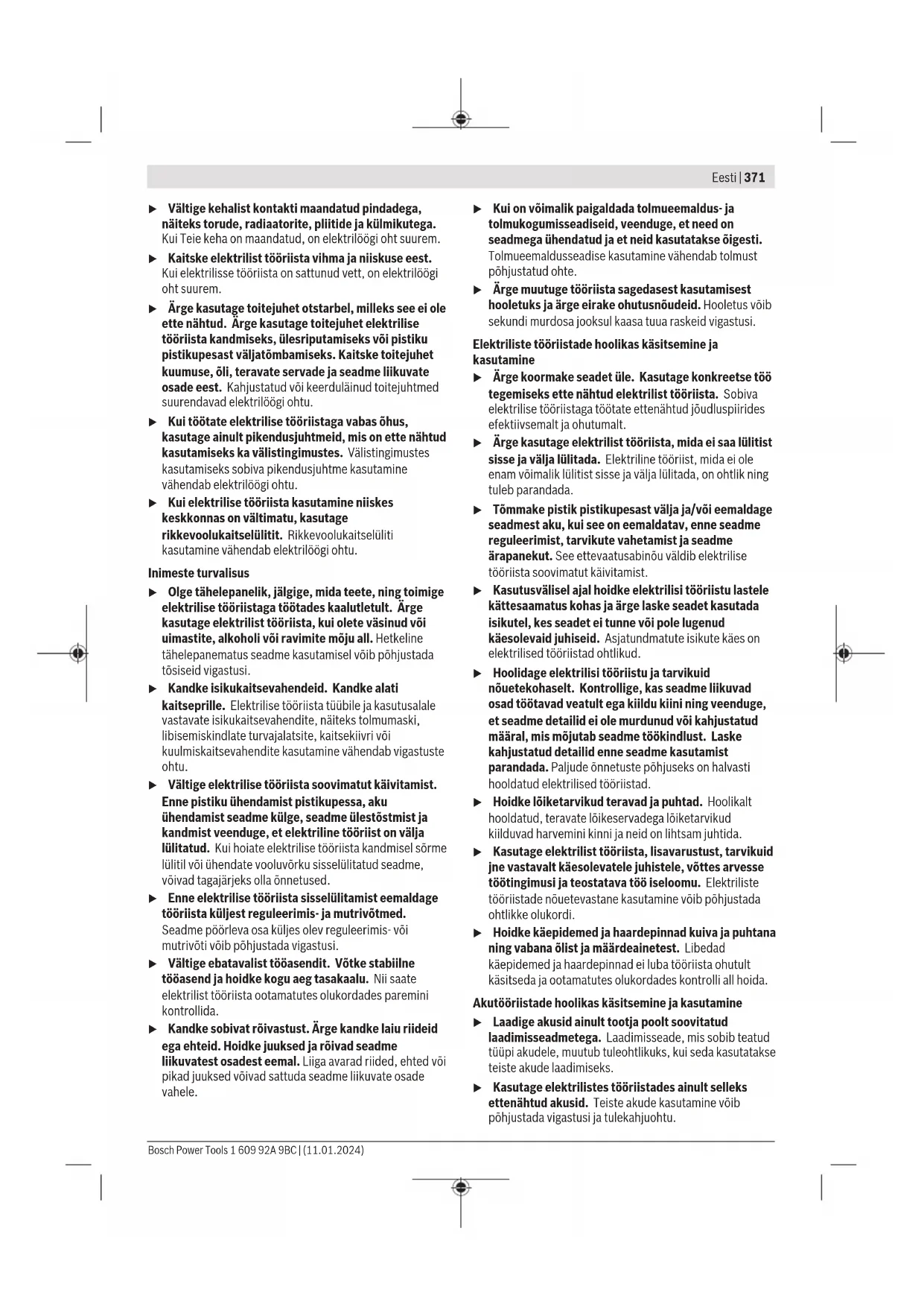 Mõõdetud 20−25°C juures akuga ProCORE18V 8.0Ah. B) Sõltuvalt kasutatud akust C) Piiratud võimsus temperatuuril <0°C. Väärtused võivad olenevalt tootest varieeruda ja oleneda kasutus- ning keskkonnatingimustest.Täiendav teave veebisaidil www.bosch-professional.com/wac. Tooriku lubatud mõõtmed (maksimaalne/minimaalne): (vaadake „Töödeldava detaili lubatud mõõtmed“, Lehekülg381) Andmed müra kohta Mürapäästuväärtused, määratud vastavalt ENIEC62841-3-9. Elektrilise tööriista ekvivalentne müratase on tavaliselt: helirõhutase 97dB(A); helivõimsustase 106dB(A). Mõõtemääramatus K=3dB. Kasutage kuulmiskaitsevahendeid! Nendes juhistes toodud mürapäästu väärtus on mõõdetud standardse mõõtemeetodiga ja seda saab kasutada elektriliste tööriistade omavaheliseks võrdlemiseks. See sobib ka vibratsioonitaseme esialgseks hindamiseks. Toodud vibratsioonitase on tüüpiline elektrilise tööriista kasutamisel ettenähtud töödeks. Kui aga elektrilist tööriista kasutatakse muudeks töödeks, rakendatakse teisi tarvikuid Bosch Power Tools 1 609 92A 9BC | (11.01.2024)376 | Eesti või kui tööriista hooldus pole piisav, võib vibratsioonitase muutuda. Selle tagajärjel võib vibratsioonitase töötamise koguperioodil tunduvalt suureneda. Vibratsiooni täpseks hindamiseks tuleb arvesse võtta ka aega, mil seade oli välja lülitatud või küll sisse lülitatud, kuid tegelikult tööle rakendamata. Selle tagajärjel võib vibratsioonitase töötamise koguperioodil tunduvalt väheneda. Aku Bosch müüb ka juhtmeta elektrilisi tööriistu ilma akuta. Pakendilt näete, kas aku kuulub teie elektrilise tööriista tarnekomplekti. Aku laadimine u Kasutage üksnes tehnilistes andmetes loetletud laadimisseadmeid. Vaid need laadimisseadmed on ette nähtud elektrilises tööriistas kasutatud liitium-ioonaku laadimiseks. Juhis: liitiumioonakud tarnitakse tehasest rahvusvaheliste transpordieeskirjade põhjal osaliselt laetutena. Selleks et aku täielikku võimsust tagada, laadige aku enne esimest kasutamist täielikult täis. Aku paigaldamine Lükake laetud aku akuhoidikusse nii, et see tuntavalt fikseeruks. Aku eemaldamine Aku eemaldamiseks vajutage lukustuse vabastamise nuppe ja tõmmake aku välja. Ärge rakendage seejuures jõudu. Akulon kakslukustusastet, mis takistavad aku väljakukkumist aku lukustuse vabastamisnupu kogemata vajutamisel. Elektritööriista paigaldatud akut hoiab õiges asendis vedru. Aku laetuse taseme näidik Märkus: kõikidel akutüüpidel ei ole laetuse taseme indikaatorit. Rohelised LEDid aku laetuse taseme näidikul näitavad aku laetuse taset. Ohutuse huvides saab aku laetuse taset vaadata ainult väljalülitatud elektrilisel tööriistal. Laetuse taseme vaatamiseks vajutage laetuse taseme näidiku nuppu või . See on võimalik ka väljavõetud aku korral. Kui laetuse taseme näidiku nupuvajutamisel ei sütti ükski LED, on aku defektne ja tuleb välja vahetada. Aku tüüp GBA 18V... LED Mahtuvus Pidev tuli 3× roheline 60–100% Pidev tuli 2× roheline 30–60% Pidev tuli 1× roheline 5–30% LED Mahtuvus Vilkuv tuli 1× roheline 0–5% Aku tüüp ProCORE18V... LED Mahtuvus Pidev tuli 5× roheline 80–100% Pidev tuli 4× roheline 60–80% Pidev tuli 3× roheline 40–60% Pidev tuli 2× roheline 20–40% Pidev tuli 1× roheline 5–20% Vilkuv tuli 1× roheline 0–5% Juhised aku käsitsemiseks Kaitske akut niiskuse ja vee eest. Hoidke aku temperatuuril –20 °C kuni 50 °C. Ärge jätke akut suvel autosse. Puhastage aku ventilatsiooniavasid pehme, puhta ja kuiva pintsliga. Oluliselt lühenenud kasutusaeg pärast laadimist näitab, et aku on muutunud kasutuskõlbmatuks ja tuleb välja vahetada. Järgige ringlussevõtu juhiseid. Paigaldus u Eemaldage aku seadmest enne mis tahes töid seadme kallal (nt hooldus, tarvikute vahetus jmt), samuti enne seadme transportimist ja hoiulepanekut. Lüliti (sisse/ välja) juhuslik käsitsemine toob kaasa vigastuste ohu. Tarnekomplekt Võtke selleks arvesse käitamisjuhendi alguses olevat tarnekomplekti kirjeldust. Kontrollige enne elektrilise tööriista kasutuselevõttu, kas tarnekomplekt sisaldab kõiki allpool nimetatud osi: – Paigaldatud saelehega järkamissaag – Lukustusratas (45) – Reguleeritav tugisiin (26) – Pitskruvi (41) – Sisekuuskantvõti/lapikkruvikeeraja (43) – Tolmukott (37) – Töödeldavate detailide toed (24) (2tükki) Märkus: Kontrollige elektritööriista võimalike kahjustuste suhtes. Enne kui jätkate elektritööriista kasutamist, kontrollige hoolikalt kaitseseadiseid või kergelt kahjustatud osi, kas need on laitmatus ja nõuetekohases töökorras. Veenduge, et liikuvad osad töötavad veatult ega kiilu kinni ja et kõik detailid on kahjustamata. Seadme laitmatu töö tagamiseks 1 609 92A 9BC | (11.01.2024) Bosch Power ToolsEesti | 377 peavad kõik seadme osad olema paigaldatud õigesti ja vastama kõikidele nõuetele. Kahjustatud kaitseseadised ja osad tuleb lasta remontida või asendada selleks volitatud remonditöökojas. Üksikosade koostamine – Võtke tarnekomplekti kõik osad pakendist ettevaatlikult välja. – Eemaldage seadme ja tarvikute küljest pakkematerjal. – Seadmega kaasasolevate elementide paigaldamisel jälgige töö lihtsustamiseks, et elektriline tööriist oleks transpordiasendis. Töödeldavate detailide tugede paigaldamine (vaata joonist A1) Töödeldavate detailide toed (24) võivad paikneda elektrilisel tööriistal vasakul, paremal või ees. Paindlik paigaldussüsteem võimaldab teile mitmeid pikendus- või laiendusvariante (vaata joonistG). – Paigaldage vastavalt vajadusele töödeldava detaili tugi (24) kinnituskohtadele (47) elektrilisel tööriistal või kinnituskohtadele (48) teisel töödeldava detaili toel. u Ärge kandke elektrilist tööriista mitte kunagi töödeldava detaili tugedest haarates. Elektrilise tööriista transportimisel kasutage alati ainult transpordiseadiseid. Lukustusratta paigaldamine (vaata joonistA2) Lukus
