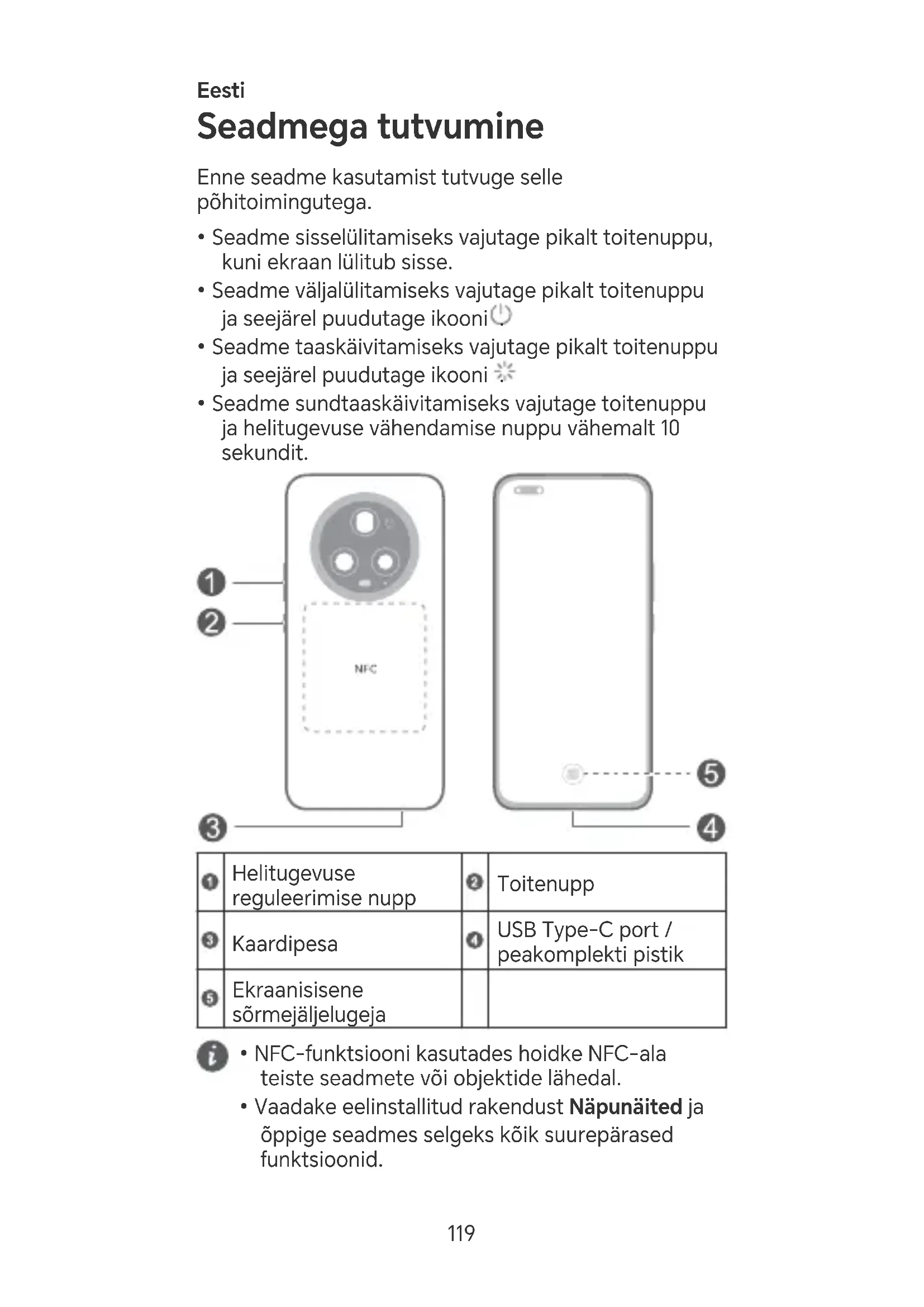 - Seadme sundtaaskäivitamiseks vajutage toitenuppu ja helitugevuse vähendamise nuppu vähemalt 10 sekundit. Helitugevuse reguleerimise nupp Toitenupp Kaardipesa USB Type-C po / peakomplekti pistik Ekraanisisene sõrmejäljelugeja