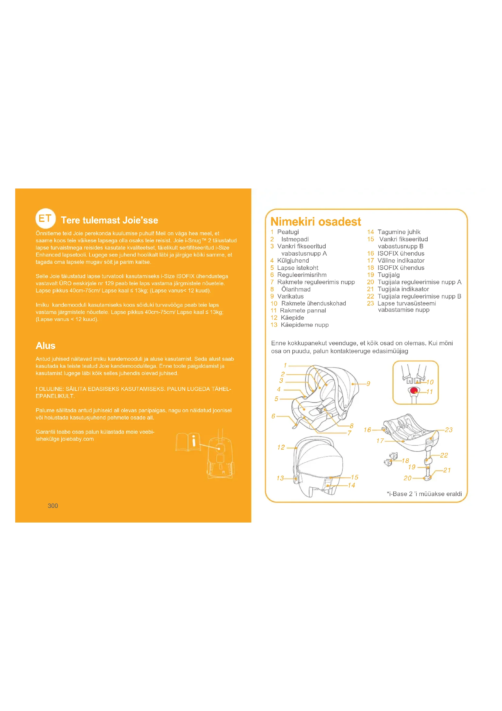 Tere tulemast Joie’sse Õnnitleme teid Joie perekonda kuulumise puhul! Meil on väga hea meel, et saame koos teie väikese lapsega olla osaks teie reisist. Joie i-Snug™ 2 täiustatud lapse turvaistmega reisides kasutate kvaliteetset, täielikult sertifitseeritud i-Size Enhanced lapsetooli. Lugege see juhend hoolikalt läbi ja järgige kõiki samme, et tagada oma lapsele mugav sõit ja parim kaitse.Selle Joie täiustatud lapse turvatooli kasutamiseks i-Size ISOFIX ühendustega vastavalt ÜRO eeskirjale nr 129 peab teie laps vastama järgmistele nõuetele. Lapse pikkus 40cm-75cm/ Lapse kaal ≤ 13kg; (Lapse vanus< 12 kuud).Imiku kandemooduli kasutamiseks koos sõiduki turvavööga peab teie laps vastama järgmistele nõuetele. Lapse pikkus 40cm-75cm/ Lapse kaal ≤ 13kg; (Lapse vanus < 12 kuud). Alus Antud juhised näitavad imiku kandemooduli ja aluse kasutamist. Seda alust saab kasutada ka teiste teatud Joie kandemoodulitega. Enne toote paigaldamist ja kasutamist lugege läbi kõik selles juhendis olevad juhised.! OLULINE: SÄILITA EDASISEKS KASUTAMISEKS. PALUN LUGEDA TÄHEL-EPANELIKULT.Palume säilitada antud juhiseid all olevas panipaigas, nagu on näidatud joonisel või hoiustada kasutusjuhend pehmete osade all.Garantii teabe osas palun külastada meie veebi-lehekülge joiebaby.com *i-Base 2 ’i müüakse eraldi301 302 HOIATUS ! OLGE ETTEVAATLIK, et täiustatud lapse turvasüsteemi jäigad esemed ja plastosad paikneksid ja on paigaldatud nii, et need ei jääks liikuva istme või sõiduki ukse vahele. ! ÄRGE kasutage täiustatud lapse turvaisteid seljaga sõidu suunas olevatel istekohtadel, kus asub aktiveeritud esiturvapadi. ! Antud täiustatud lapse turvaistme kasutamiseks koos ISOFIX-ühendustega vastavalt ÜRO eeskirjale nr 129 peab teie laps vastama järgmistele nõuetele. Lapse pikkus 40cm-75cm/ Lapse kaal ≤13kg (lapse vanus ≤12 kuud) ! Antud kandemooduli kasutamiseks koos sõiduki turvavööga peab teie laps vastama järgmistele nõuetele. Lapse pikkus 40cm-75cm/ Lapse kaal ≤13kg (lapse vanus ≤12 kuud) ! Täiustatud lapse turvaiste ei pruugi sobida kõikidesse heakskiidetud sõidukitesse. Lisateabe saamiseks vaadake kaasas olevat paigaldusnimekirja. ! Kõik rihmad, mis hoiavad täiustatud lapse turvatooli sõiduki küljes, peavad olema pingul, kõik tugijalad peaksid kokku puutuma sõiduki põrandaga, kõik last kinnitavad rihmad või löögikaitsed peaksid olema kohandatud lapse kehaga ja rihmad ei tohiks olla keerdunud. ! ÄRGE kasutage muid koormust kandvaid kontaktpunkte peale nende, mis on kirjeldatud juhistes ja märgitud täiustatud lapse turvaistmel. ! Pärast lapse asetamist täiustatud turvatooli, tuleb turvavööd õigesti kasutada. Veenduge, et kõik vöörihmad oleksid kinnitatud piisavalt madalal, nii et vaagnaluu oleks kindlalt kinni. ! Antud täiustatud lapse turvatool tuleks välja vahetada, kui see on õnnetuse käigus tugevalt viga saanud. Õnnetus võib tekitada kahju toolile, mis ole silmaga nähtav. ! Arvesse võtta võimalikku ohtu, kui seadmesse teha muudatusi või täiendusi ilma vastava volituseta või ei järgita tootja antud paigaldusjuhiseid täpselt. ! Hoidke täiustatud lapse turvatooli päikesevalguse eest eemal, vastasel juhul võib see lapse naha jaoks liiga kuum olla. Enne lapse turvatooli asetamist puudutage seda alati. ! ÄRGE jätke oma last täiustatud lapse turvaistmesse järelevalveta. HOIATUS ! Pagas või muud esemed, mis võivad kokkupõrke korral vigastusi põhjustada, peavad olema korralikult kinnitatud. ! Täiustatud lapse turvaistet EI TOHI KASUTADA ilma pehmete esemeteta. ! Pehmeid esemeid ei tohi asendada ühegi muuga kui tootja soovitatuga, sest pehmed esemed on turvasüsteemi toimimise lahutamatu osa. ! Enne ostmist kontrollige, kas antud täiustatud lapse turvatooli saab teie sõidukisse õigesti paigaldada. ! ÜKSKI täiustatud lapse turvaiste ei taga täielikku kaitset vigastuste eest õnnetuses. Antud turvaistme õige kasutamine vähendab aga teie lapsel tõsiste vigastuste või surma ohtu. ! ÄRGE paigaldage täiustatud lapse turvatooli ilma praeguse juhendi juhiseid järgimata, vastasel juhul võib teie laps tõsiselt vigastada või surma saada. ! ÄRGE kasutage seda täiustatud lapse turvatooli, kui sellel on kahjustatud või puuduvad osad. ! Antud juhised võib säilitada kogu selle eluea jooksul. ! i-Size täiustatud lapseturvasüsteemi puhul tuleb kasutajal viidata ka sõiduki tootja käsiraamatule.303 304 Figure for Installation Child height 40cm-75cm/ Child weight≤13kg (Child age≤12 months) Child height 40cm-75cm/ Child weight≤13kg (Child age≤12 months) Suitable for Child height 40cm-75cm/ Child weight≤13kg Child age≤12 months Erakorraline juhtum Hädaolukorra või õnnetusjuhtumite korral on kõige olulisem, et teie laps saaks koheselt esmaabi. Installeerimisjoonis Sobilikkus Lapse pikkus 40cm 75cm/ Lapse kaal≤13kg (Lapse vanus ≤12 kuud) Lapse pikkus 40cm 75cm/ Lapse kaal≤13kg (Lapse vanus ≤12 kuud) Lapse pikkus 40cm 75cm/ Lapse kaal≤13kg (Lapse vanus ≤12 kuud) Toote informatsioon RGE kasutage täiustatud lapse turvaisteid seljaga sõidu suunas olevatel istekohtadel, kus asub aktiveeritud esiturvapadi i-Snug™ 2 lapsekandmismoodul ühildub i-Base 2, i-Base lx 2’e, i-Base Advance'i, i-Base Encore'iga