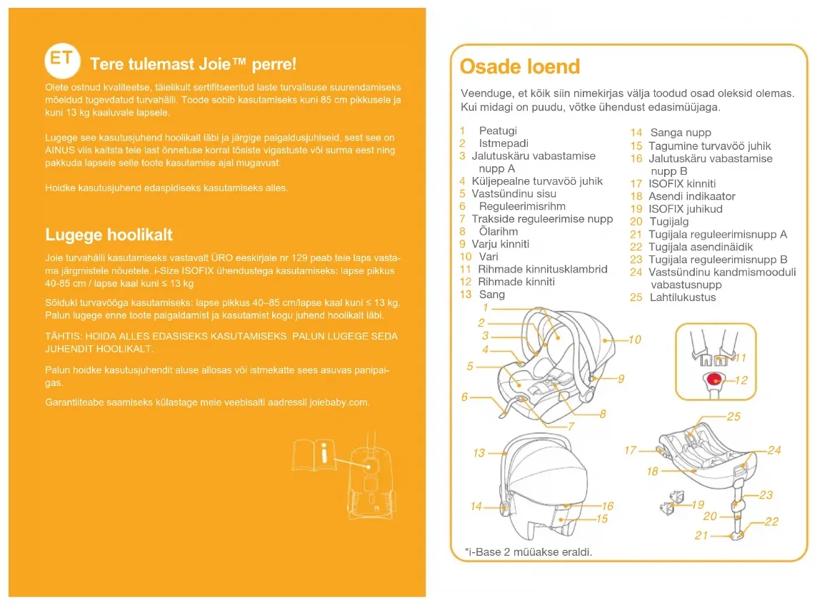 Tere tulemast Joie™ perre! Olete ostnud kvaliteetse, täielikult sertifitseeritud laste turvalisuse suurendamiseks mõeldud tugevdatud turvahälli. Toode sobib kasutamiseks kuni 85 cm pikkusele ja kuni 13 kg kaaluvale lapsele.Lugege see kasutusjuhend hoolikalt läbi ja järgige paigaldusjuhiseid, sest see on AINUS viis kaitsta teie last õnnetuse korral tõsiste vigastuste või surma eest ning pakkuda lapsele selle toote kasutamise ajal mugavust.Hoidke kasutusjuhend edaspidiseks kasutamiseks alles. Lugege hoolikalt Joie turvahälli kasutamiseks vastavalt ÜRO eeskirjale nr 129 peab teie laps vasta-ma järgmistele nõuetele. i-Size ISOFIX ühendustega kasutamiseks: lapse pikkus 40-85 cm / lapse kaal kuni ≤ 13 kgSõiduki turvavööga kasutamiseks: lapse pikkus 40–85 cm/lapse kaal kuni ≤ 13 kg. Palun lugege enne toote paigaldamist ja kasutamist kogu juhend hoolikalt läbi.TÄHTIS: HOIDA ALLES EDASISEKS KASUTAMISEKS. PALUN LUGEGE SEDA JUHENDIT HOOLIKALT.Palun hoidke kasutusjuhendit aluse allosas või istmekatte sees asuvas panipai- gas. Garantiiteabe saamiseks külastage meie veebisaiti aadressil joiebaby.com.*i-Base 2 müüakse eraldi.