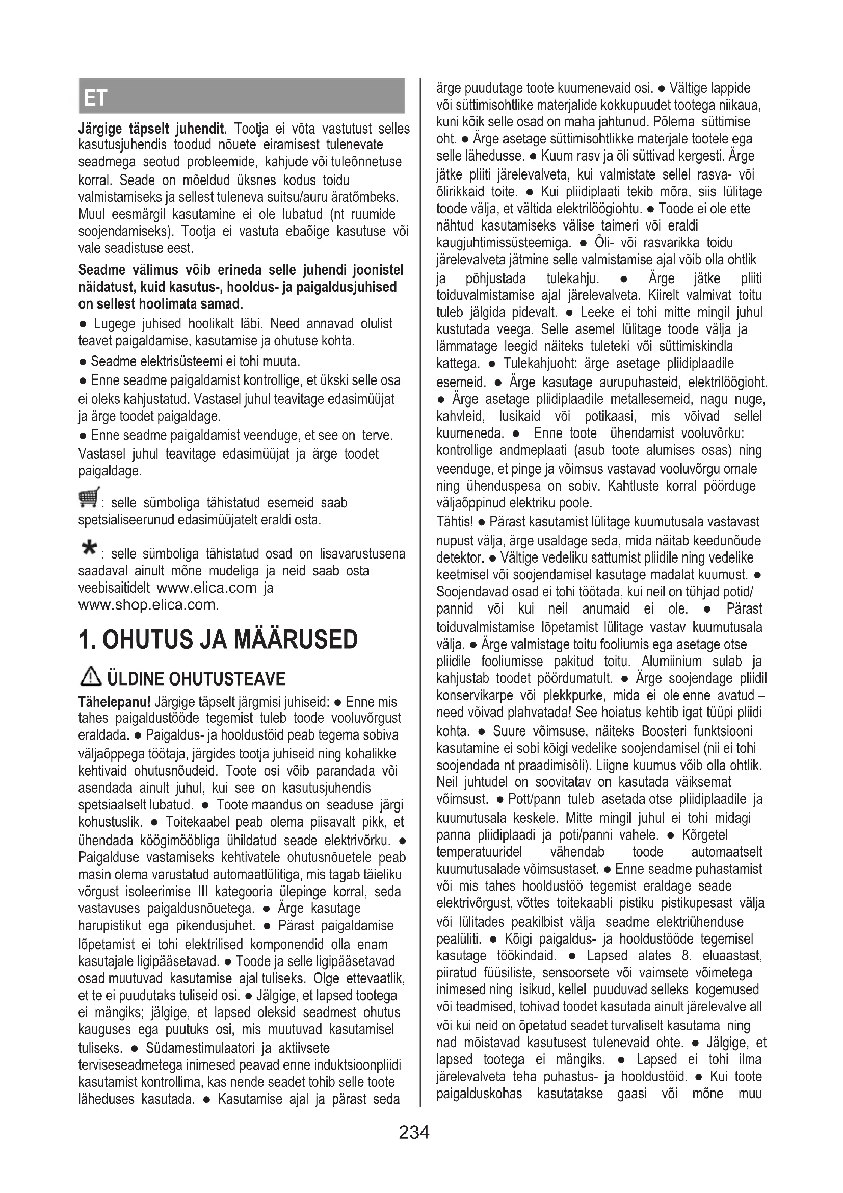 Егер тексерулерден кейін ақау жойылмаса, ең жақын Тұтынушыларды қолдау орталығына хабарласыңыз. 233ET Järgige täpselt juhendit. Tootja ei võta vastutust selles kasutusjuhendis toodud nõuete eiramisest tulenevate seadmega seotud probleemide, kahjude või tuleõnnetuse korral. Seade on mõeldud üksnes kodus toidu valmistamiseks ja sellest tuleneva suitsu/auru äratõmbeks. Muul eesmärgil kasutamine ei ole lubatud (nt ruumide soojendamiseks). Tootja ei vastuta ebaõige kasutuse või vale seadistuse eest. Seadme välimus võib erineda selle juhendi joonistel näidatust, kuid kasutus-, hooldus- ja paigaldusjuhised on sellest hoolimata samad. ● Lugege juhised hoolikalt läbi. Need annavad olulist teavet paigaldamise, kasutamise ja ohutuse kohta. ● Seadme elektrisüsteemi ei tohi muuta. ● Enne seadme paigaldamist kontrollige, et ükski selle osa ei oleks kahjustatud. Vastasel juhul teavitage edasimüüjat ja ärge toodet paigaldage. ● Enne seadme paigaldamist veenduge, et see on terve. Vastasel juhul teavitage edasimüüjat ja ärge toodet paigaldage. : selle sümboliga tähistatud esemeid saab spetsialiseerunud edasimüüjatelt eraldi osta. : selle sümboliga tähistatud osad on lisavarustusena saadaval ainult mõne mudeliga ja neid saab osta veebisaitidelt www.elica.com ja www.shop.elica.com.
