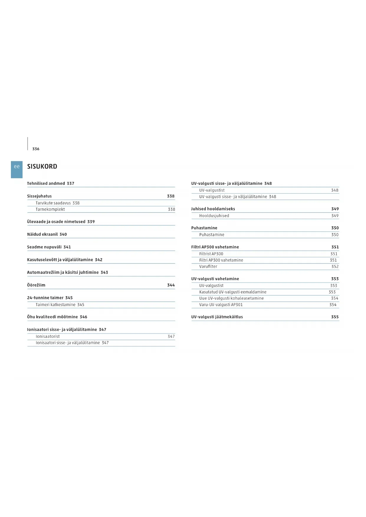 SISUKORD Tehnilised andmed 337 Sissejuhatus 338 Tarvikute saadavus 338 Tarnekomplekt 338 Ülevaade ja osade nimetused 339 Näidud ekraanil 340 Seadme nupuväli 341 Kasutuselevõtt ja väljalülitamine 342 Automaatrežiim ja käsitsi juhtimine 343 Öörežiim 344 24-tunnine taimer 345 Taimeri katkestamine 345 Õhu kvaliteedi mõõtmine 346 Ionisaatori sisse- ja väljalülitamine 347 Ionisaatorist 347 Ionisaatori sisse- ja väljalülitamine 347 UV-valgusti sisse- ja väljalülitamine 348 UV-valgustist 348 UV-valgusti sisse- ja väljalülitamine 348 Juhised hooldamiseks 349 Hooldusjuhised 349 Puhastamine 350 Puhastamine 350 Filtri AP300 vahetamine 351 Filtrist AP300 351 Filtri AP300 vahetamine 351 Varufilter 352 UV-valgusti vahetamine 353 UV-valgustist 353 Kasutatud UV-valgusti eemaldamine 353 Uue UV-valgusti kohaleasetamine 354 Varu-UV-valgusti AP301 354 UV-valgusti jäätmekäitlus 355337