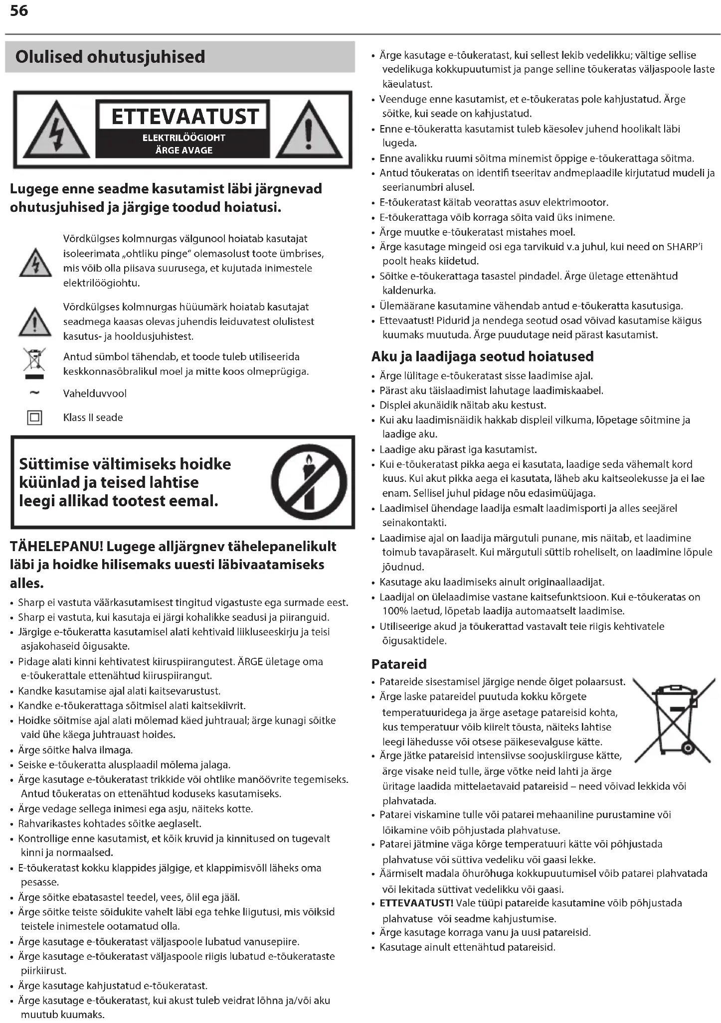 - Sharp ei vastuta väärkasutamisest tingitud vigastuste ega surmade eest.• Sharp ei vastuta, kui kasutaja ei järgi kohalikke seadusi ja piiranguid.• Järgige e-tõukeratta kasutamisel alati kehtivaid liikluseeskirju ja teisi asjakohaseid õigusakte.• Pidage alati kinni kehtivatest kiiruspiirangutest. ÄRGE ületage oma e-tõukerattale ettenähtud kiiruspiirangut.• Kandke kasutamise ajal alati kaitsevarustust.• Kandke e-tõukerattaga sõitmisel alati kaitsekiivrit.• Hoidke sõitmise ajal alati mõlemad käed juhtraual; ärge kunagi sõitke vaid ühe käega juhtrauast hoides.• Ärge sõitke halva ilmaga.• Seiske e-tõukeratta alusplaadil mõlema jalaga.• Ärge kasutage e-tõukeratast trikkide või ohtlike manöövrite tegemiseks. Antud tõukeratas on ettenähtud koduseks kasutamiseks.• Ärge vedage sellega inimesi ega asju, näiteks kotte.• Rahvarikastes kohtades sõitke aeglaselt.• Kontrollige enne kasutamist, et kõik kruvid ja kinnitused on tugevalt kinni ja normaalsed.• E-tõukeratast kokku klappides jälgige, et klappimisvõll läheks oma pesasse.• Ärge sõitke ebatasastel teedel, vees, õlil ega jääl.• Ärge sõitke teiste sõidukite vahelt läbi ega tehke liigutusi, mis võiksid teistele inimestele ootamatud olla.• Ärge kasutage e-tõukeratast väljaspoole lubatud vanusepiire.• Ärge kasutage e-tõukeratast väljaspoole riigis lubatud e-tõukerataste piirkiirust.• Ärge kasutage kahjustatud e-tõukeratast.• Ärge kasutage e-tõukeratast, kui akust tuleb veidrat lõhna ja/või aku muutub kuumaks.• Ärge kasutage e-tõukeratast, kui sellest lekib vedelikku; vältige sellise vedelikuga kokkupuutumist ja pange selline tõukeratas väljaspoole laste käeulatust.• Veenduge enne kasutamist, et e-tõukeratas pole kahjustatud. Ärge sõitke, kui seade on kahjustatud.• Enne e-tõukeratta kasutamist tuleb käesolev juhend hoolikalt läbi lugeda.• Enne avalikku ruumi sõitma minemist õppige e-tõukerattaga sõitma.• Antud tõukeratas on identi tseeritav andmeplaadile kirjutatud mudeli ja seerianumbri alusel.• E-tõukeratast käitab veorattas asuv elektrimootor.• E-tõukerattaga võib korraga sõita vaid üks inimene.• Ärge muutke e-tõukeratast mistahes moel.• Ärge kasutage mingeid osi ega tarvikuid v.a juhul, kui need on SHARP’i poolt heaks kiidetud.• Sõitke e-tõukerattaga tasastel pindadel. Ärge ületage ettenähtud kaldenurka.• Ülemäärane kasutamine vähendab antud e-tõukeratta kasutusiga.• Ettevaatust! Pidurid ja nendega seotud osad võivad kasutamise käigus kuumaks muutuda. Ärge puudutage neid pärast kasutamist. Aku ja laadijaga seotud hoiatused