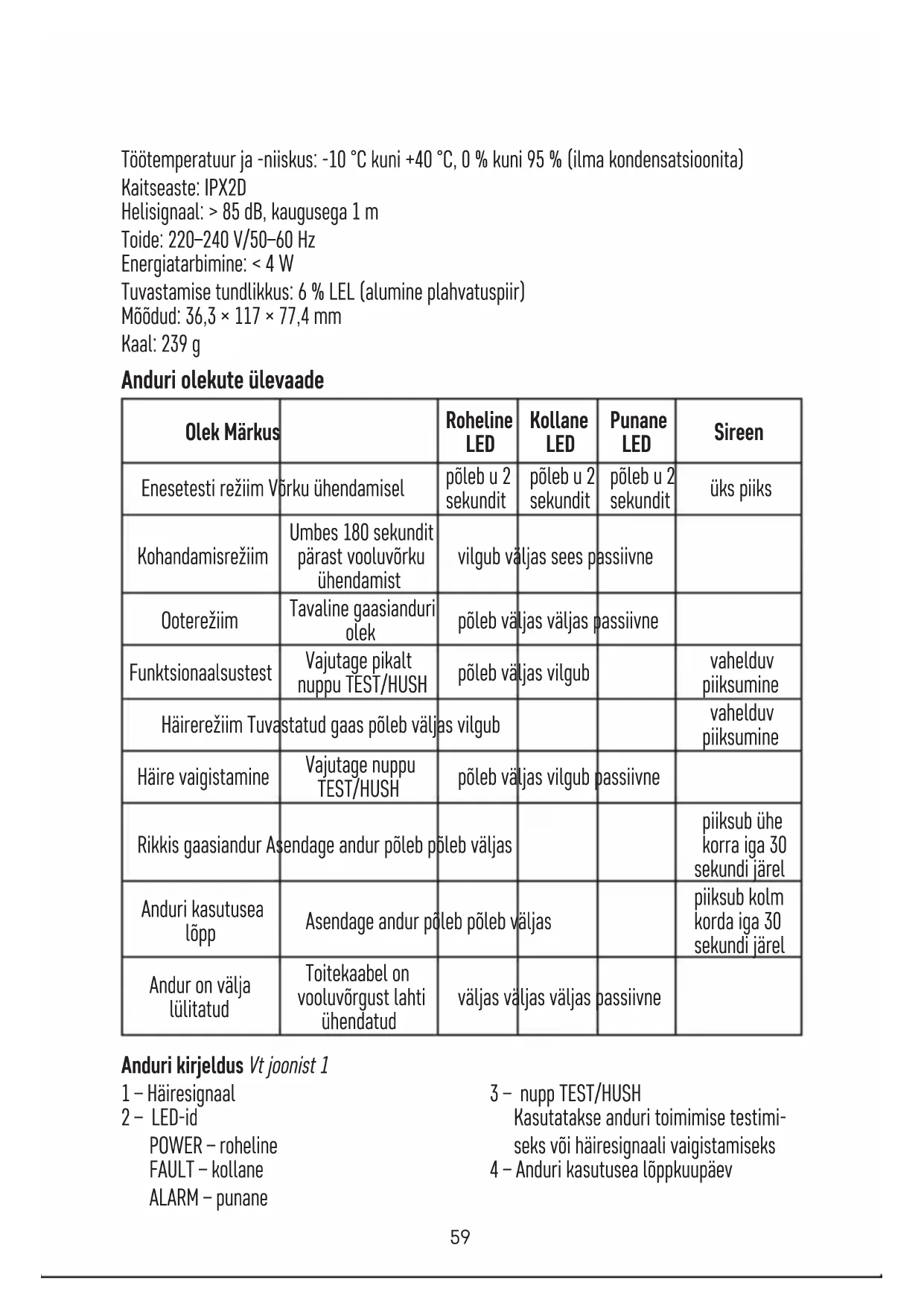 - Šī ierīce nav paredzēta izmantošanai personām (tostarp bērniem), kuru ziskā, uztveres vai garīgā nespēja vai pieredzes un zināšanu trūkums neļauj to droši lietot, ja vien šīs personas neuzrauga vai norādījumus par ierīces lietošanu tām nesniedz par viņu drošību atbildīgā persona. Bērni vienmēr ir jāuzrauga un viņi nedrīkst spēlēties ar izstrādājumu. Neizmetiet kopā ar sadzīves atkritumiem. Šim nolūkam izmantojiet īpašus atkritumu šķi- rošanas un savākšanas punktus. Lai gūtu informāciju par šādiem savākšanas punktiem, sazinieties ar vietējo pašvaldību. Ja elektroniskās ierīces tiek likvidētas izgāztuvē, bīstamas vielas var nonākt pazemes ūdeņos un tālāk arī barības ķēdē, kur tās var ietekmēt cilvēka veselību. EE | Gaasiandur Andur tuvastab tuleohtlike gaaside (maagaas, metaan, propaan, butaan) lekkeid majapidamistes. See juhend sisaldab anduri paigaldamise ja käsitsemisega seotud olulist ohutusteavet. Lugege seda juhendit põhjalikult ja hoidke see kindlas kohas alles. Tutvustage anduri tööpõhimõtteid hoone teistele elanikele, et nad saaksid selle signaalidele asjakohaselt reageerida. Tehniline informatsioon: Anduri tüüp: pooljuht Vastavalt standardile EN 50194-1:2009 Kasutusiga: 5 aastat Tuvastamine: maagaas, metaan, propaan, butaan59 Töötemperatuur ja -niiskus: -10 °C kuni +40 °C, 0 % kuni 95 % (ilma kondensatsioonita) Kaitseaste: IPX2D Helisignaal: > 85 dB, kaugusega 1 m Toide: 220–240 V/50–60 Hz Energiatarbimine: < 4 W Tuvastamise tundlikkus: 6 % LEL (alumine plahvatuspiir) Mõõdud: 36,3 × 117 × 77,4 mm Kaal: 239 g Anduri olekute ülevaade Olek Märkus Roheline LED Kollane LED Punane LED Sireen Enesetesti režiim Võrku ühendamisel põleb u 2 sekundit põleb u 2 sekundit põleb u 2 sekundit üks piiks Kohandamisrežiim Umbes 180 sekundit pärast vooluvõrku ühendamist vilgub väljas sees passiivne Ooterežiim Tavaline gaasianduri olek põleb väljas väljas passiivne Funktsionaalsustest Vajutage pikalt nuppu TEST/HUSH põleb väljas vilgub vahelduv piiksumine Häirerežiim Tuvastatud gaas põleb väljas vilgub vahelduv piiksumine Häire vaigistamine Vajutage nuppu TEST/HUSH põleb väljas vilgub passiivne Rikkis gaasiandur Asendage andur põleb põleb väljas piiksub ühe korra iga 30 sekundi järel Anduri kasutusea lõpp Asendage andur põleb põleb väljas piiksub kolm korda iga 30 sekundi järel Andur on välja lülitatud Toitekaabel on vooluvõrgust lahti ühendatud väljas väljas väljas passiivne Anduri kirjeldus Vt joonist 1 1 – Häiresignaal 2 – LED-id POWER – roheline FAULT – kollane ALARM – punane 3 – nupp TEST/HUSH Kasutatakse anduri toimimise testimi- seks või häiresignaali vaigistamiseks 4 – Anduri kasutusea lõppkuupäev60 Paigaldamine Paigaldada tohib üksnes vastava kvalikatsiooniga isik. Paigaldaja vastutab toote nõuetekohase paigalduse eest. Kahtluse korral laske toode paigaldada spetsialistil. Ideaalis tuleb andur paigaldada ruumi, kus gaasilekke oht on suurim, nt köök. Maagaas on õhust kergem ja kaldub tõusma ja täitma lekkekoha kohal asuva ruumi. Andur tuleb paigaldada tõenäolise lekkekoha kohale, u 30 cm kaugusele laest. Ärge paigaldage detektorit kohta, kus õhuvoolu takistavad mööbel ja muud seadmed. Andur tuleb paigaldada ligipääsetavasse kohta, et kasutaja saaks häiresignaali korral vajutada nuppu TEST/HUSH. Andur tuleb paigaldada kohta, kust häiresignaali on kerge kuulda. Ärge paigaldage andurit: