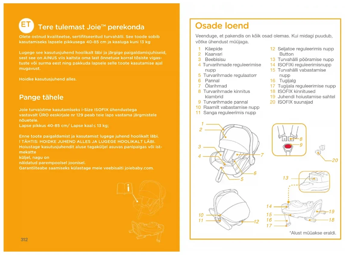 Tere tulemast Joie™ perekonda Olete ostnud kvaliteetse﹐ sertifitseeritud turvahälli. See toode sobib kasutamiseks lapsele pikkusega 40-85 cm ja kaaluga kuni 13 kgLugege see kasutusjuhend hoolikalt läbi ja järgige paigaldamisjuhiseid﹐ sest see on AINUS viis kaitsta oma last õnnetuse korral tõsiste vigas-tuste või surma eest ning pakkuda lapsele selle toote kasutamise ajal mugavust.Hoidke kasutusjuhend alles. Pange tähele Joie turvaistme kasutamiseks i-Size ISOFIX ühendustegavastavalt ÜRO eeskirjale nr 129 peab teie laps vastama järgmistele nõuetele.Lapse pikkus 40-85 cm/ Lapse kaal 13 kg; Enne toote paigaldamist ja kasutamist lugege juhend hoolikalt läbi.! TÄHTIS: HOIDKE JUHEND ALLES JA LUGEGE HOOLIKALT LÄBI.Hoiustage kasutusjuhendit aluse tagaküljel asuvas panipaigas või ist-mekatteküljel﹐ nagu onnäidatud parempoolsel joonisel.Garantiiteabe saamiseks külastage meie veebisaiti joiebaby.com. Veenduge, et pakendis on kõik osad olemas. Kui midagi puudub, võtke ühendust müüjaga. 1 Käepide 2 Kaarvari 3 Beebisisu 4 Turvarihmade reguleerimise nupp 5 Turvarihmade regulaatorr 6 Pannal 7 Õlarihmad 8 Turvarihmade kinnitus klambrid 9 Turvarihmade pannal 10 Raamilt vabastamise nupp 11 Sanga reguleerimis nupp Osade loend