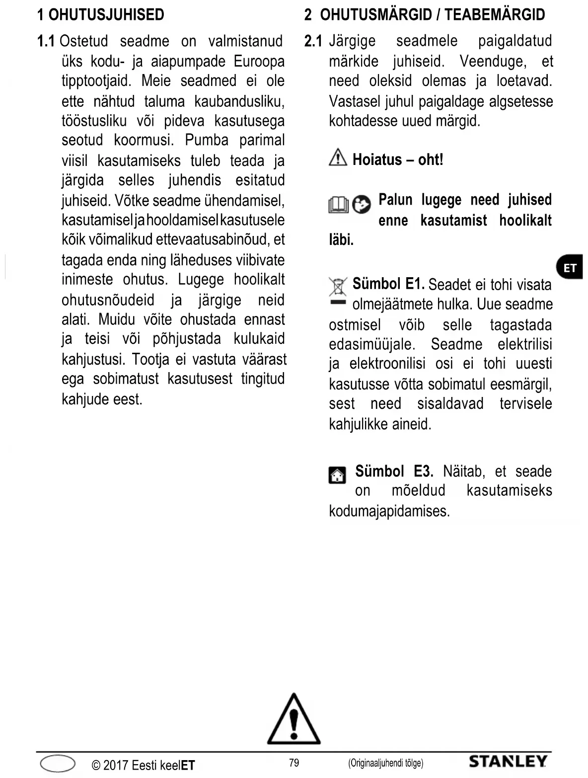 Järgige seadmele paigaldatud märkide juhiseid. Veenduge, et need oleksid olemas ja loetavad. Vastasel juhul paigaldage algsetesse kohtadesse uued märgid. Hoiatus – oht! Palun lugege need juhised enne kasutamist hoolikalt läbi. Sümbol E1. Seadet ei tohi visata olmejäätmete hulka. Uue seadme ostmisel võib selle tagastada edasimüüjale. Seadme elektrilisi ja elektroonilisi osi ei tohi uuesti kasutusse võtta sobimatul eesmärgil, sest need sisaldavad tervisele kahjulikke aineid. Sümbol E3. Näitab, et seade on mõeldud kasutamiseks kodumajapidamises.80 (Originaaljuhendi tõlge) © 2017 Eesti keelET