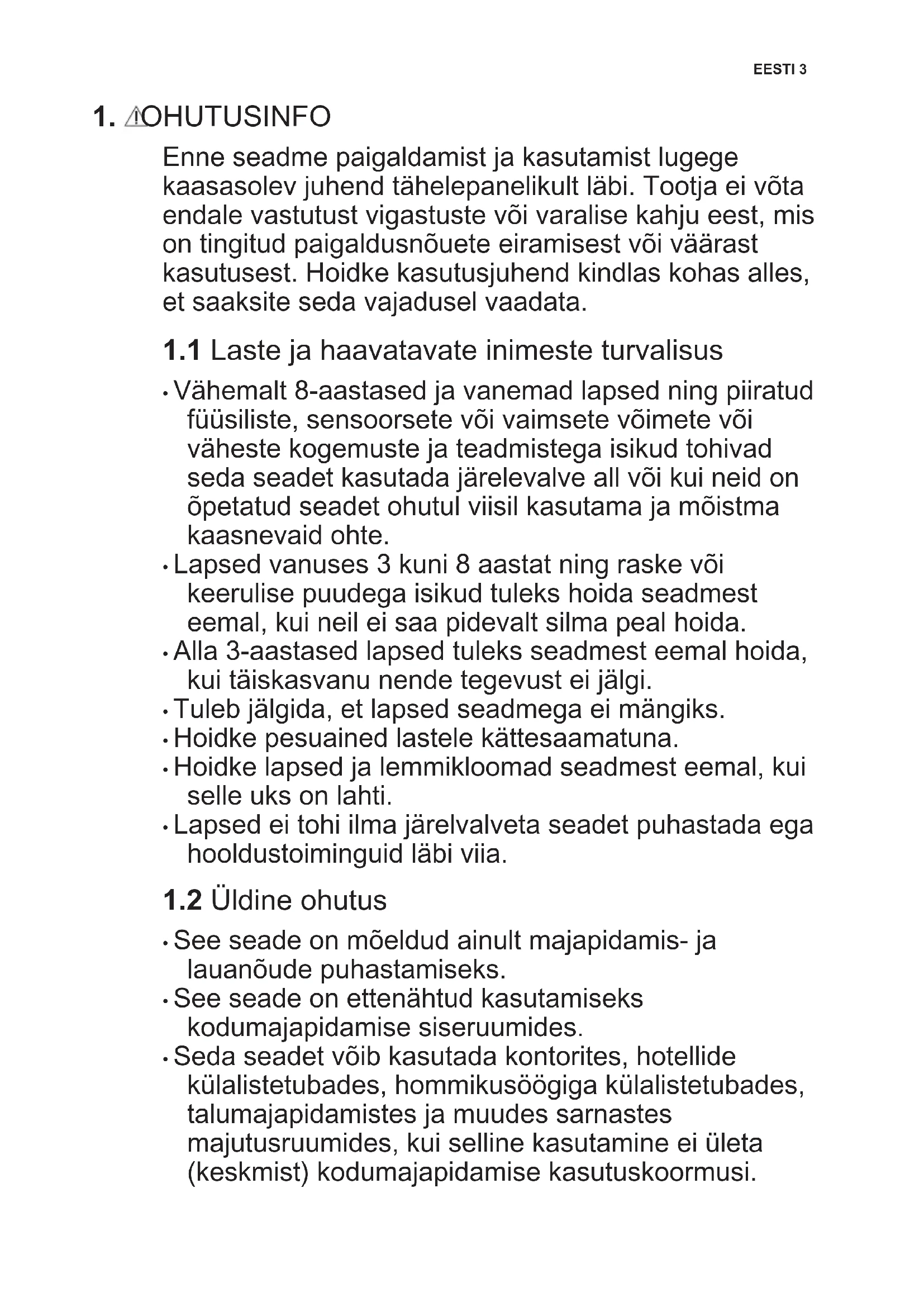 Alati tuleb kasutada originaalvaruosi. Volitatud teeninduskeskusesse pöördumisel peaksid teil olema varuks alljärgnevad andmed: mudel, PNC, seerianumber. Teave on toodud andmeplaadil. Hoiatused / Ettevaatusabinõud – ohutusteave Üldine teave ja vihjed Keskkonnateave Jäetakse õigus teha muutusi. www.electrolux.com21. OHUTUSINFO Enne seadme paigaldamist ja kasutamist lugege kaasasolev juhend tähelepanelikult läbi. Tootja ei võta endale vastutust vigastuste või varalise kahju eest, mis on tingitud paigaldusnõuete eiramisest või väärast kasutusest. Hoidke kasutusjuhend kindlas kohas alles, et saaksite seda vajadusel vaadata.