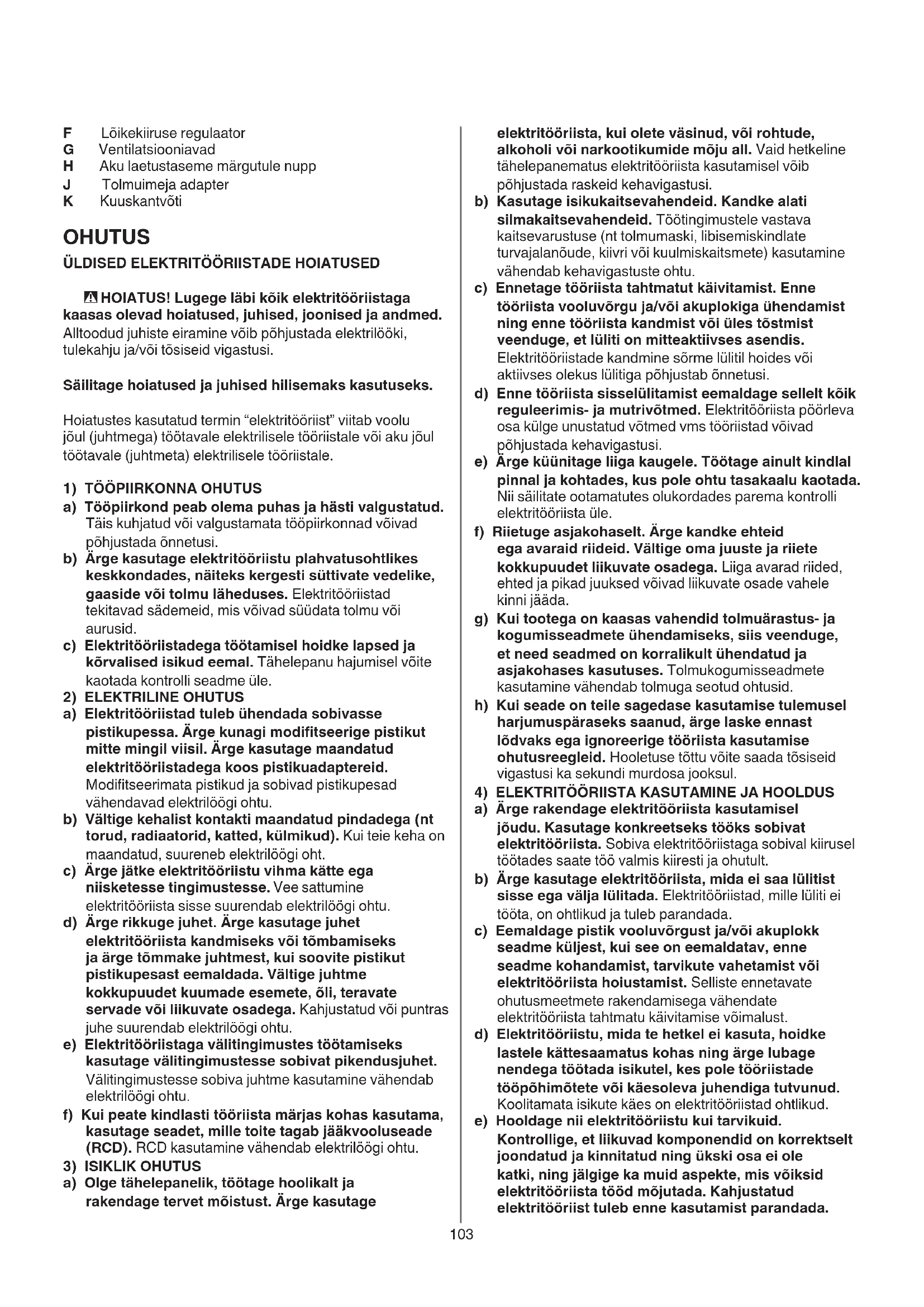 a) Ärge rakendage elektritööriista kasutamisel jõudu. Kasutage konkreetseks tööks sobivat elektritööriista. Sobiva elektritööriistaga sobival kiirusel töötades saate töö valmis kiiresti ja ohutult. b) Ärge kasutage elektritööriista, mida ei saa lülitist sisse ega välja lülitada. Elektritööriistad, mille lüliti ei tööta, on ohtlikud ja tuleb parandada. c) Eemaldage pistik vooluvõrgust ja/või akuplokk seadme küljest, kui see on eemaldatav, enne seadme kohandamist, tarvikute vahetamist või elektritööriista hoiustamist. Selliste ennetavate ohutusmeetmete rakendamisega vähendate elektritööriista tahtmatu käivitamise võimalust. d) Elektritööriistu, mida te hetkel ei kasuta, hoidke lastele kättesaamatus kohas ning ärge lubage nendega töötada isikutel, kes pole tööriistade tööpõhimõtete või käesoleva juhendiga tutvunud. Koolitamata isikute käes on elektritööriistad ohtlikud. e) Hooldage nii elektritööriistu kui tarvikuid. Kontrollige, et liikuvad komponendid on korrektselt joondatud ja kinnitatud ning ükski osa ei ole katki, ning jälgige ka muid aspekte, mis võiksid elektritööriista tööd mõjutada. Kahjustatud elektritööriist tuleb enne kasutamist parandada. F Lõikekiiruse regulaator G Ventilatsiooniavad H Aku laetustaseme märgutule nupp