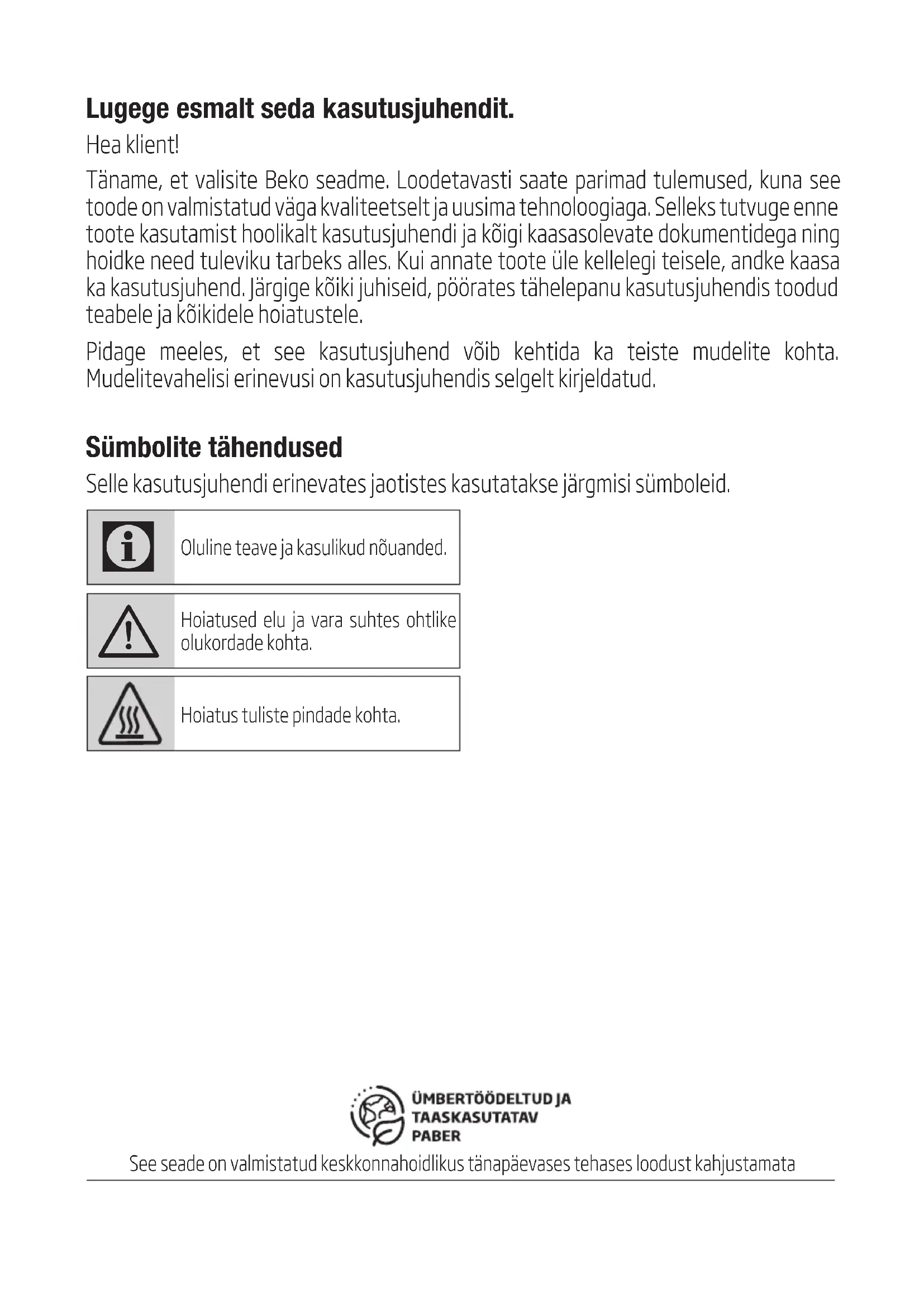 - Gabenkite gaminį įprastoje padėtyje. Neguldy- kite jo ant šono ar galo.Lugege esmalt seda kasutusjuhendit. Hea klient! Täname, et valisite Beko seadme. Loodetavasti saate parimad tulemused, kuna see toode on valmistatud väga kvaliteetselt ja uusima tehnoloogiaga. Selleks tutvuge enne toote kasutamist hoolikalt kasutusjuhendi ja kõigi kaasasolevate dokumentidega ning hoidke need tuleviku tarbeks alles. Kui annate toote üle kellelegi teisele, andke kaasa ka kasutusjuhend. Järgige kõiki juhiseid, pöörates tähelepanu kasutusjuhendis toodud teabele ja kõikidele hoiatustele. Pidage meeles, et see kasutusjuhend võib kehtida ka teiste mudelite kohta. Mudelitevahelisi erinevusi on kasutusjuhendis selgelt kirjeldatud. Sümbolite tähendused Selle kasutusjuhendi erinevates jaotistes kasutatakse järgmisi sümboleid.