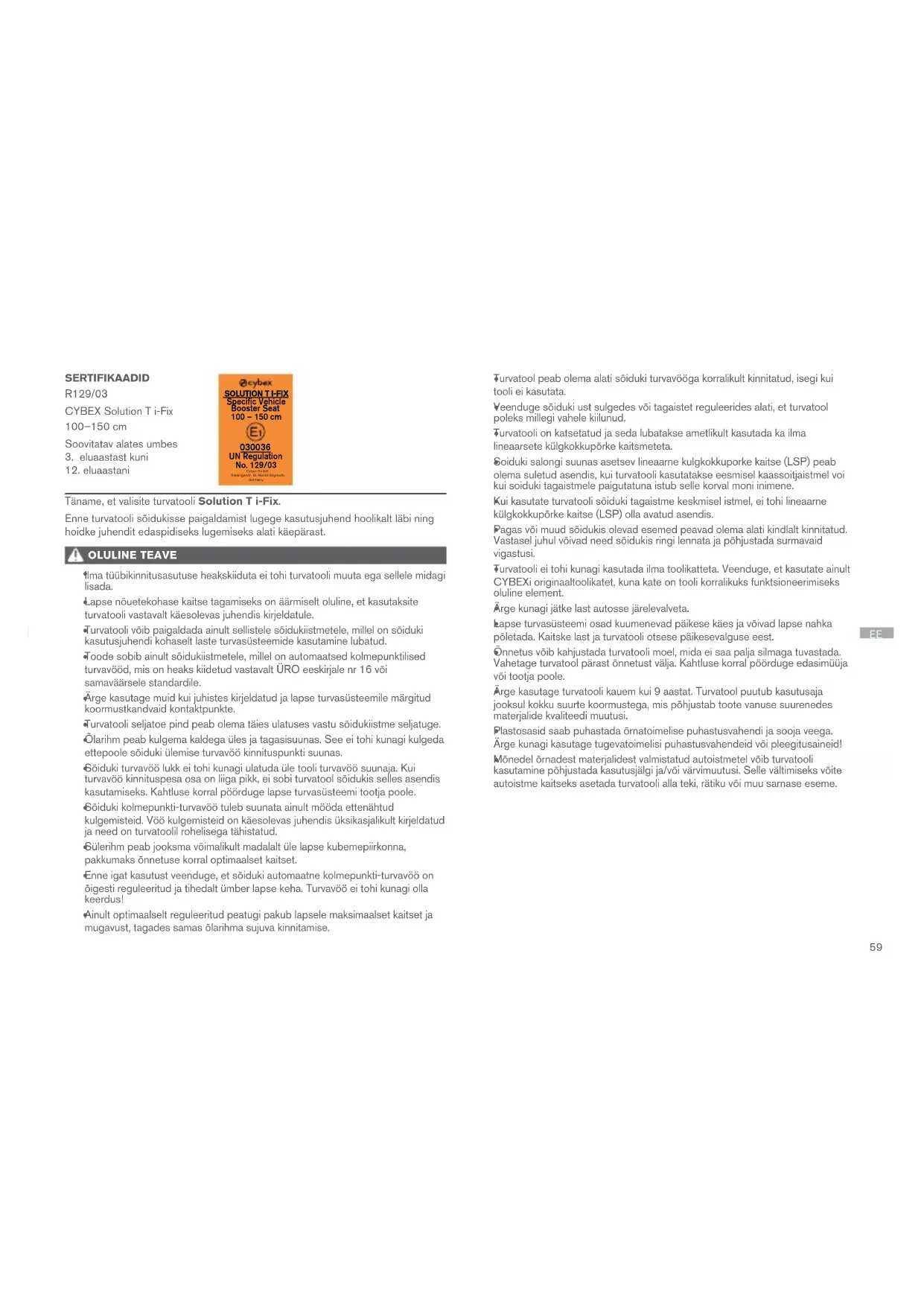 Cybex GmbHRiedingerstr. 18, 95448 BayreuthGermany UN Regulation No. 129/03 Täname, et valisite turvatooli Solution T i-Fix. Enne turvatooli sõidukisse paigaldamist lugege kasutusjuhend hoolikalt läbi ning hoidke juhendit edaspidiseks lugemiseks alati käepärast. OLULINE TEAVE