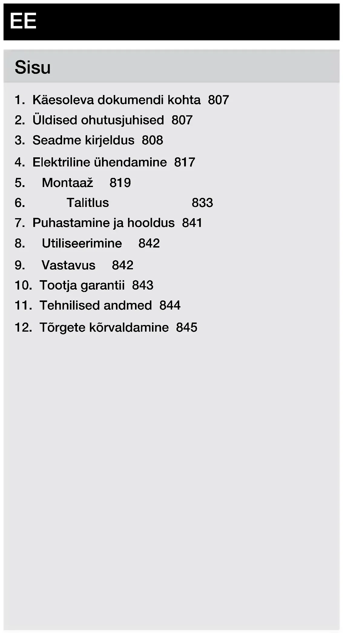 - Hoidke kättesaadavas kohas. – Elektrivooluga ümberkäimine võib tuua kaasa ohtlikke olukordi. Elektrit juhtivate osade puudutamine võib põhjustada elektrišokki, põletusi või surma. – Võrgupingel töid tohivad teha ainult kvalitseeritud spetsialistid. – Tuleb järgida riigisiseseid installatsioonieeskirju ja ühen- damistingimusi (nt DE VDE 0100, AT: ÖVE-ÖNORM E8001-1, CH:SEV 1000). – Kasutage ainult originaalvaruosi. – Parandustöid tohivad teha ainult spetsialistid.– 808 – Sisu
