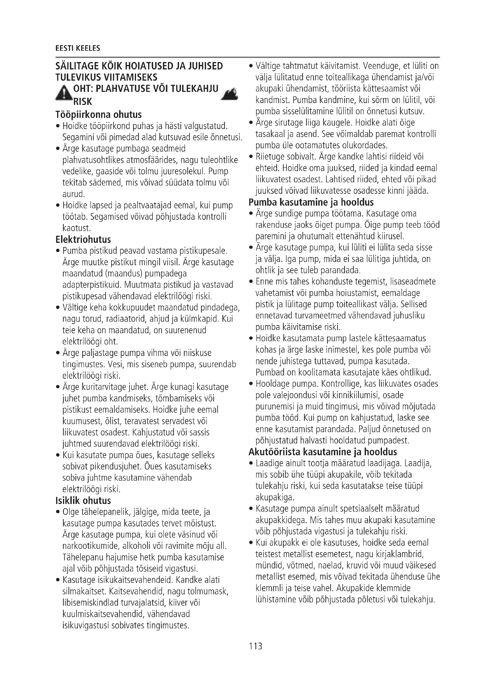 - Ärge kasutage pumbaga seadmeid plahvatusohtlikes atmosfäärides, nagu tuleohtlike vedelike, gaaside või tolmu juuresolekul. Pump tekitab sädemed, mis võivad süüdata tolmu või aurud.