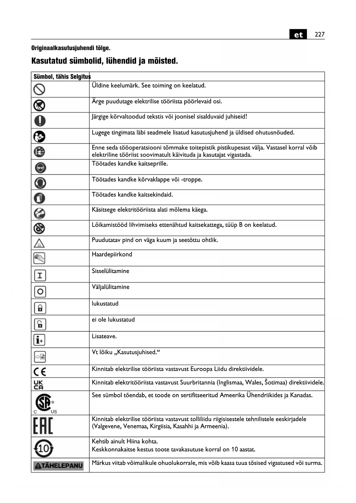 Originaalkasutusjuhendi tõlge. Kasutatud sümbolid, lühendid ja mõisted. Sümbol, tähis Selgitus Üldine keelumärk. See toiming on keelatud. Ärge puudutage elektrilise tööriista pöörlevaid osi. Järgige kõrvaltoodud tekstis või joonisel sisalduvaid juhiseid! Lugege tingimata läbi seadmele lisatud kasutusjuhend ja üldised ohutusnõuded. Enne seda tööoperatsiooni tõmmake toitepistik pistikupesast välja. Vastasel korral võib elektriline tööriist soovimatult käivituda ja kasutajat vigastada. Töötades kandke kaitseprille. Töötades kandke kõrvaklappe või -troppe. Töötades kandke kaitsekindaid. Käsitsege elektritööriista alati mõlema käega. Lõikamistööd lihvimiseks ettenähtud kaitsekattega, tüüp B on keelatud. Puudutatav pind on väga kuum ja seetõttu ohtlik. Haardepiirkond Sisselülitamine Väljalülitamine lukustatud ei ole lukustatud Lisateave. Vt lõiku „Kasutusjuhised.“ Kinnitab elektrilise tööriista vastavust Euroopa Liidu direktiividele. Kinnitab elektritööriista vastavust Suurbritannia (Inglismaa, Wales, Šotimaa) direktiividele. See sümbol tõendab, et toode on sertifitseeritud Ameerika Ühendriikides ja Kanadas. Kinnitab elektrilise tööriista vastavust tolliliidu riigisisestele tehnilistele eeskirjadele (Valgevene, Venemaa, Kirgiisia, Kasahhi ja Armeenia). Kehtib ainult Hiina kohta. Keskkonnakaitse kestus toote tavakasutuse korral on 10 aastat. Märkus viitab võimalikule ohuolukorrale, mis võib kaasa tuua tõsised vigastused või surma.228