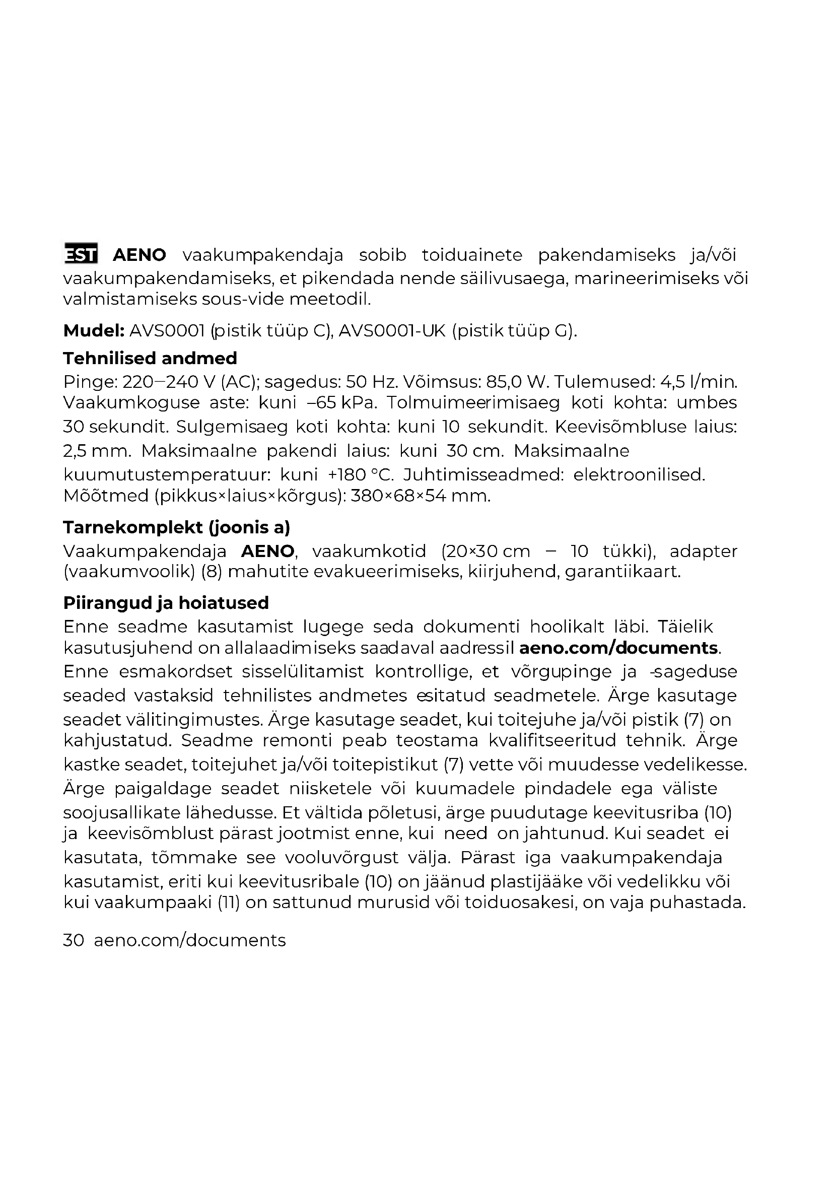 ASBISc behält sich das Recht vor, das Gerät zu modifizieren und Änderungen an diesem Dokument ohne vorherige Ankündigung. Die Garantiezeit und Lebensdauer beträgt 2 Jahre ab dem Kaufdatum des Produkts. Herstellerangaben: ASBISc Enterprises PLC, Iapetou, 1, Agios Athanasios, 4101, Limassol, Cyprus (Zypern). Hergestellt in China.Aktuelle Informationen und detaillierte Gerätebeschreibungen sowie Anschlussanleitungen, Zertifikate, Qualitätsansprüche und Garantieinformationen stehen unter aeno.com/documents zum Download bereit. Alle genannten Warenzeichen und Markennamen sind Eigentum der jeweiligen Inhaber.30 aeno.com/documents EST AENO vaakumpakendaja sobib toiduainete pakendamiseks ja/või vaakumpakendamiseks, et pikendada nende säilivusaega, marineerimiseks või valmistamiseks sous-vide meetodil. Mudel: AVS0001 (pistik tüüp C), AVS0001-UK (pistik tüüp G). Tehnilised andmed Pinge: 220‒240 V (AC); sagedus: 50 Hz. Võimsus: 85,0 W. Tulemused: 4,5 l/min. Vaakumkoguse aste: kuni –65 kPa. Tolmuimeerimisaeg koti kohta: umbes 30 sekundit. Sulgemisaeg koti kohta: kuni 10 sekundit. Keevisõmbluse laius: 2,5 mm. Maksimaalne pakendi laius: kuni 30 cm. Maksimaalne kuumutustemperatuur: kuni +180 °C. Juhtimisseadmed: elektroonilised. Mõõtmed (pikkus×laius×kõrgus): 380×68×54 mm. Tarnekomplekt (joonis a) Vaakumpakendaja AENO, vaakumkotid (20×30 cm ‒ 10 tükki), adapter (vaakumvoolik) (8) mahutite evakueerimiseks, kiirjuhend, garantiikaart. Piirangud ja hoiatused Enne seadme kasutamist lugege seda dokumenti hoolikalt läbi. Täielik kasutusjuhend on allalaadimiseks saadaval aadressil aeno.com/documents. Enne esmakordset sisselülitamist kontrollige, et võrgupinge ja -sageduse seaded vastaksid tehnilistes andmetes esitatud seadmetele. Ärge kasutage seadet välitingimustes. Ärge kasutage seadet, kui toitejuhe ja/või pistik (7) on kahjustatud. Seadme remonti peab teostama kvalifitseeritud tehnik. Ärge kastke seadet, toitejuhet ja/või toitepistikut (7) vette või muudesse vedelikesse. Ärge paigaldage seadet niisketele või kuumadele pindadele ega väliste soojusallikate lähedusse. Et vältida põletusi, ärge puudutage keevitusriba (10) ja keevisõmblust pärast jootmist enne, kui need on jahtunud. Kui seadet ei kasutata, tõmmake see vooluvõrgust välja. Pärast iga vaakumpakendaja kasutamist, eriti kui keevitusribale (10) on jäänud plastijääke või vedelikku või kui vaakumpaaki (11) on sattunud murusid või toiduosakesi, on vaja puhastada.aeno.com/documents 31 Tõmmake seade vooluvõrgust välja, tõmmates võrgupistiku (7) pistikupesast, ja laske seadmel jahtuda. Pühkige selle pinda sooja veega või maheda seebilahusega immutatud pehme lapiga. Seejärel pühkige puhta veega niisutatud pehme lapiga ja pühkige kuivaks. Ärge kasutage karmi puhastusvahendeid, abrasiivseid pastasid, poleerimisvahendeid ega happeid või lahusteid sisaldavaid puhastusvahendeid. Kasutage vaakumpakendajat, et vaakumida ja/või sulgeda ainult kuivad tooted. Seade ei ole ette nähtud märja või vedela toidu käitlemiseks. Kasutage ainult spetsiaalseid kotte ja mahuteid vaakumpakendite jaoks. Vaakumpakendiga kaasas olevat adapterit (vaakumvoolikut) (8) kasutatakse ainult õhu evakueerimiseks spetsiaalsetest vaakumkonteineritest. Enne kottidesse või konteineritesse pakitud toidu mikrolaineahju panemist tehke kotti auk või avage konteineri väljalaskeklapp (13), et aur saaks väljuda. Kasutage ainult tootja soovitatud tarvikuid, tarvikuid ja/või varuosi. Üksikasjalik teave on esitatud täielikus käsiraamatus, mis on allalaaditav aadressil aeno.com/documents. Ärge jätke seadet järelevalveta sisse lülitatud. Laske seadmel pärast kasutamist jahtuda. Seadet võivad kasutada ainult liikumispuudega inimesed otsese järelevalve ja kontrolli all. Kui seadet ei kasutata, on soovitav panna vaakumpakendaja sisse paberi sisseheide, et vältida tihendi (9) deformeerumist ja seadme töövõime kahjustamist, ning sulgeda kaas lõdvalt ilma kaanelukustusi (12) lukustamata. Ärge lubage lastel seadet kasutada ja/või sellega mängida. Seadme haldamine Enne vaakumpakendaja esmakordset sisselülitamist veenduge, et kogu pakkematerjal on seadmest eemaldatud. Tihenduskotid
