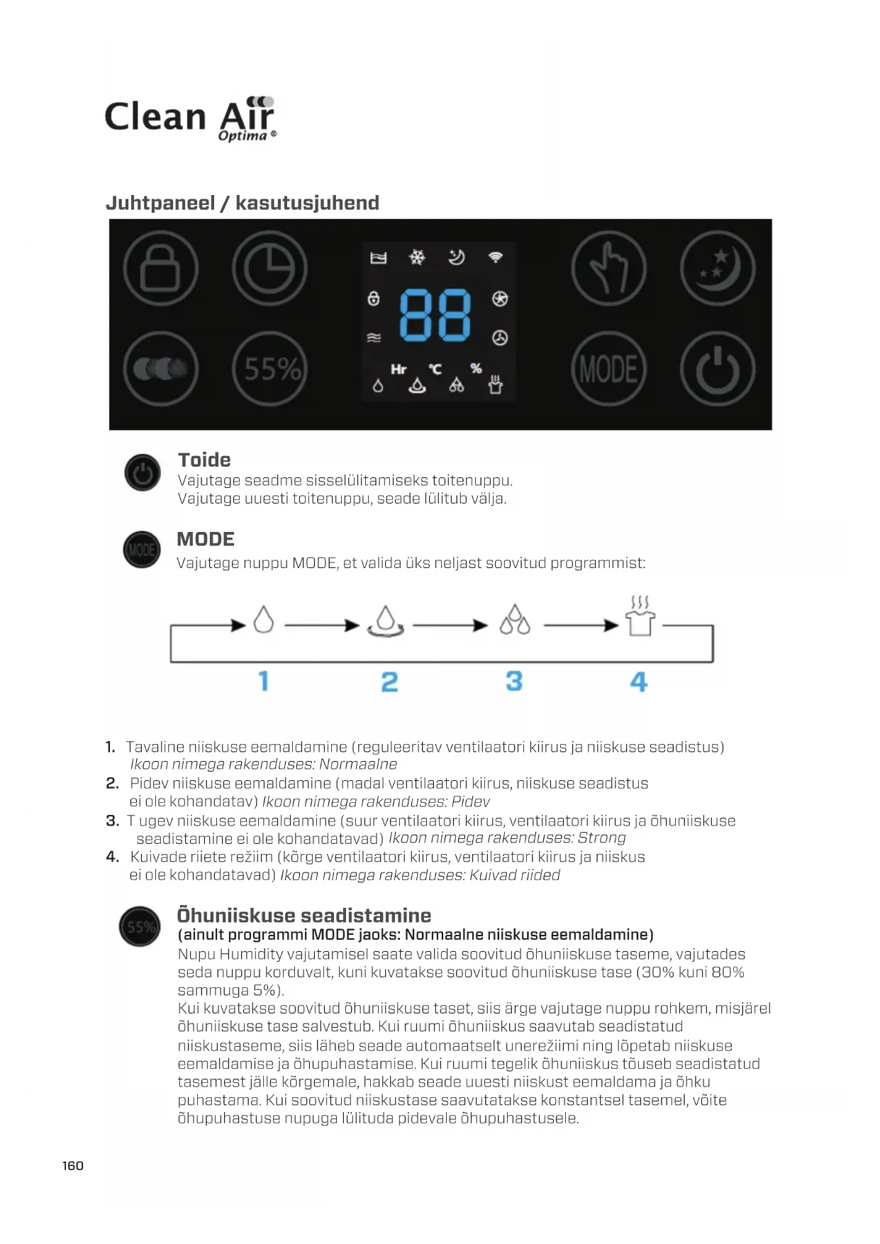 Paigaldamine Veenduge, et seade oleks seintest ja mööblist 20 cm eemal, vt allolevat joonist.160 Juhtpaneel / kasutusjuhend Toide Vajutage seadme sisselülitamiseks toitenuppu. Vajutage uuesti toitenuppu, seade lülitub välja. MODE Vajutage nuppu MODE, et valida üks neljast soovitud programmist: