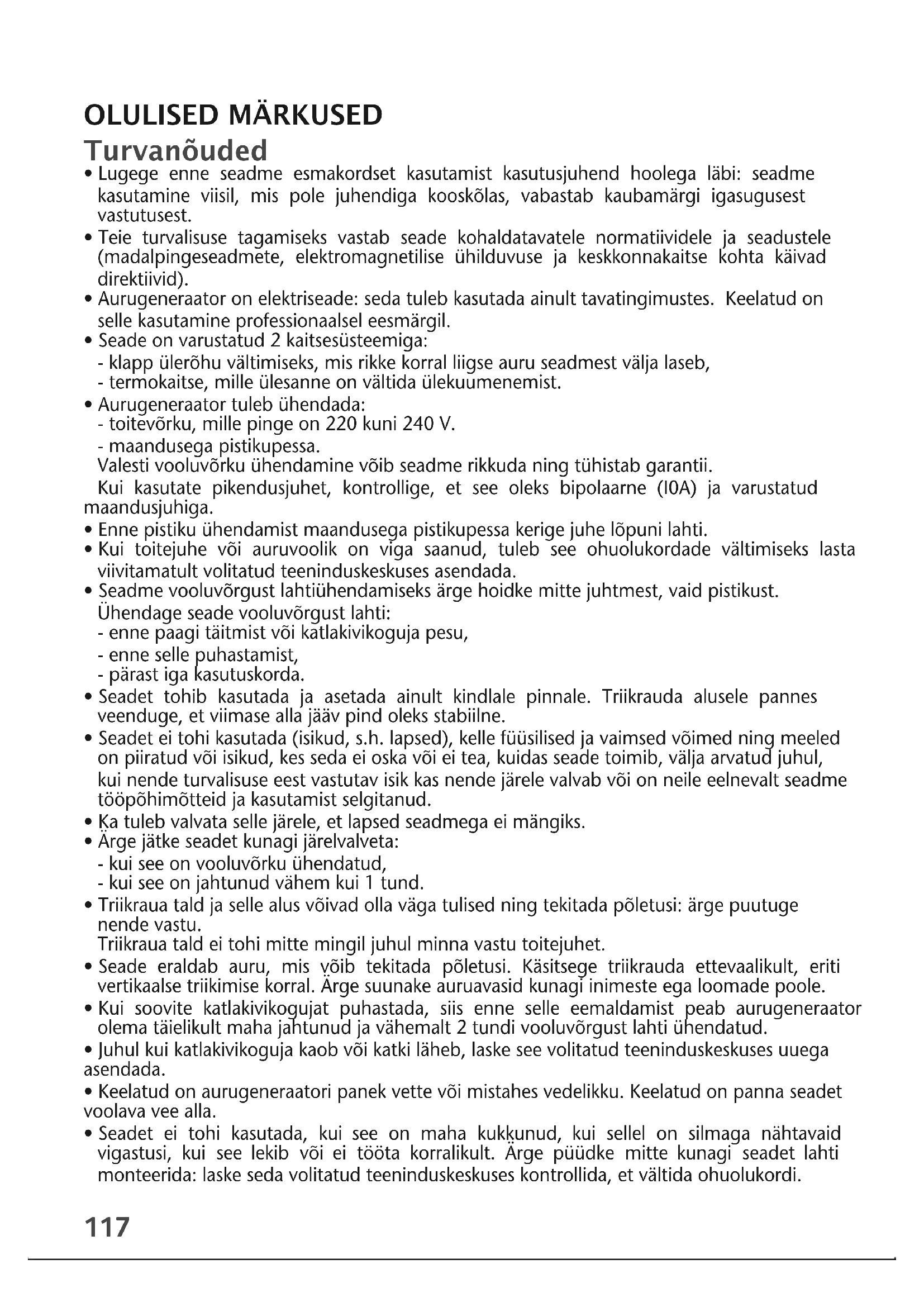 - Aurugeneraator on elektriseade: seda tuleb kasutada ainult tavatingimustes. Keelatud on selle kasutamine professionaalsel eesmärgil.