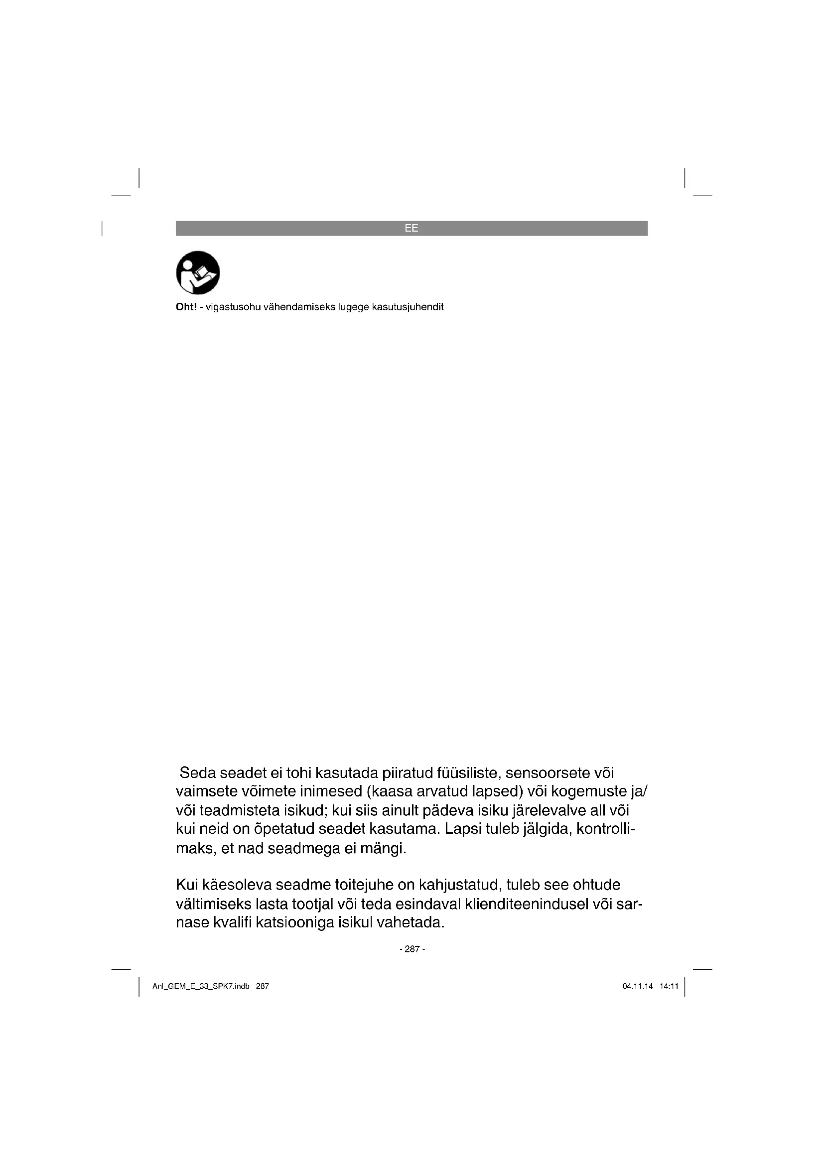 Oht! - vigastusohu vähendamiseks lugege kasutusjuhendit Seda seadet ei tohi kasutada piiratud füüsiliste, sensoorsete või vaimsete võimete inimesed (kaasa arvatud lapsed) või kogemuste ja/ või teadmisteta isikud; kui siis ainult pädeva isiku järelevalve all või kui neid on õpetatud seadet kasutama. Lapsi tuleb jälgida, kontrolli- maks, et nad seadmega ei mängi. Kui käesoleva seadme toitejuhe on kahjustatud, tuleb see ohtude vältimiseks lasta tootjal või teda esindaval klienditeenindusel või sar- nase kvalifi katsiooniga isikul vahetada. Anl_GEM_E_33_SPK7.indb 287Anl_GEM_E_33_SPK7.indb 287 04.11.14 14:1104.11.14 14:11EE