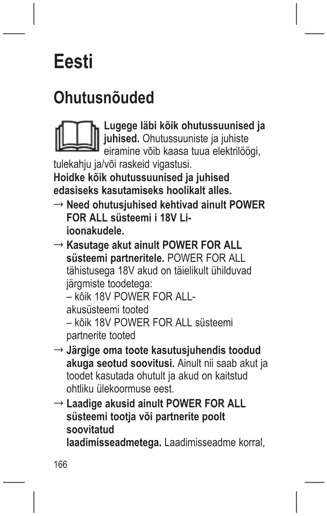 Laadige akusid ainult POWER FOR ALL süsteemi tootja või partnerite poolt soovitatud laadimisseadmetega. Laadimisseadme korral, 166mis on ette nähtud teatavat liiki akudele, on tulekahjuoht, kui seda kasutatakse muud liiki akude jaoks.