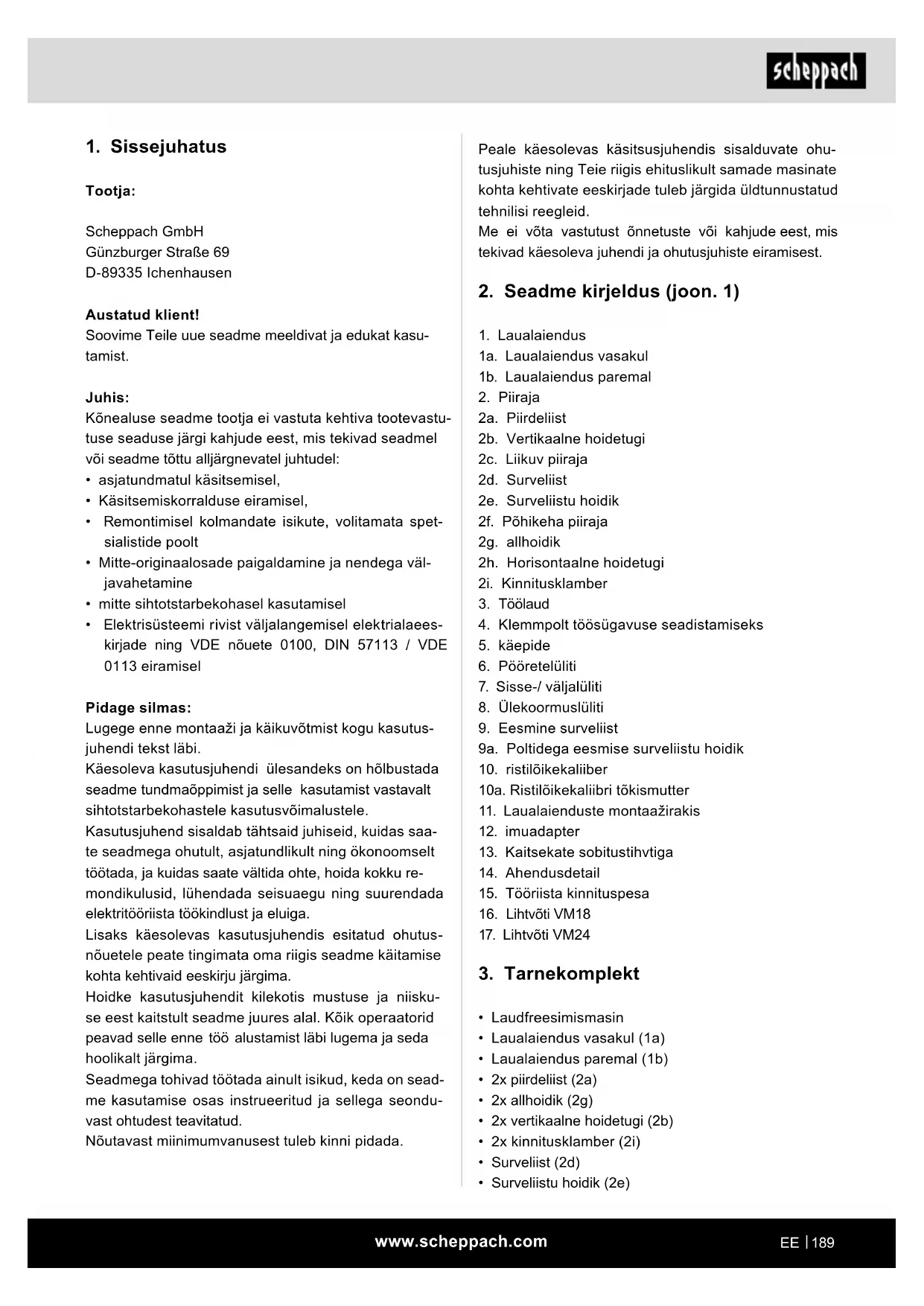 - Elektrisüsteemi rivist väljalangemisel elektrialaees- kirjade ning VDE nõuete 0100, DIN 57113 / VDE 0113 eiramisel Pidage silmas: Lugege enne montaaži ja käikuvõtmist kogu kasutus- juhendi tekst läbi. Käesoleva kasutusjuhendi ülesandeks on hõlbustada seadme tundmaõppimist ja selle kasutamist vastavalt sihtotstarbekohastele kasutusvõimalustele. Kasutusjuhend sisaldab tähtsaid juhiseid, kuidas saa- te seadmega ohutult, asjatundlikult ning ökonoomselt töötada, ja kuidas saate vältida ohte, hoida kokku re- mondikulusid, lühendada seisuaegu ning suurendada elektritööriista töökindlust ja eluiga. Lisaks käesolevas kasutusjuhendis esitatud ohutus- nõuetele peate tingimata oma riigis seadme käitamise kohta kehtivaid eeskirju järgima. Hoidke kasutusjuhendit kilekotis mustuse ja niisku- se eest kaitstult seadme juures alal. Kõik operaatorid peavad selle enne töö alustamist läbi lugema ja seda hoolikalt järgima. Seadmega tohivad töötada ainult isikud, keda on sead- me kasutamise osas instrueeritud ja sellega seondu- vast ohtudest teavitatud. Nõutavast miinimumvanusest tuleb kinni pidada.www.scheppach.com
