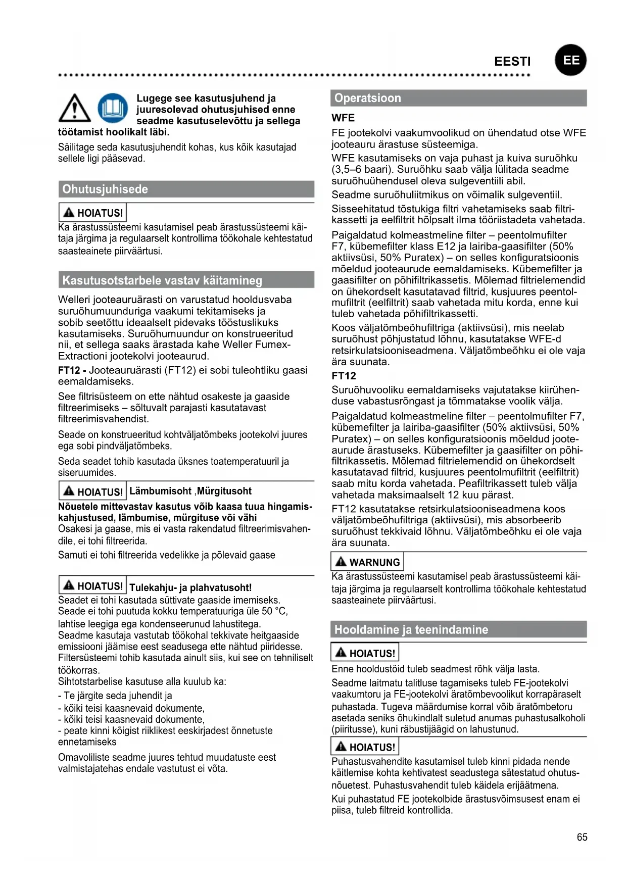 - vastavalt hooldusplaanile Mustunud ltreid tuleb käidelda eriprügina. Kandke sobivat kaitsevarustust. Juhis Eri räbustid, räbusti osad ja äratõmmatavas õhus sisalduvad tolmuosakesed võivad ltri tööiga tunduvalt vähendada.Klee- puva suitsu äratõmbamiseks tuleb kasutada lairiba-gaasiltrit (ilma hõljumltrita). Garantii Ostja pretensioonid puuduste kohta aeguvad ühe aasta jook- sul kauba tarnimisest. See ei kehti ostja nõuetele vastavalt §§ 478, 479 BGB. Meie antud garantii osas vastutame me ainult siis, kui oleme andnud kirjalikus vormis omaduste ja säilivuse garantii ning garantii on antud, kasutades mõistet „Garantii“. Garantii kaotab kehtivuse mittesihtotstarbelise kasutuse korral ja juhul, kui kvalitseerimata isikud teevad seadme juures muudatusi. Tootjapoolsed tehnilised muudatused on võimalikud! Lisainfot leiate veebilehel www.weller-tools.com Tehnilised Andmed Jootegaaside äratõmbesüsteem WFE FT12 Töörõhk (kuiv õlivaba suruõhk) bar psi 3,5 - 6