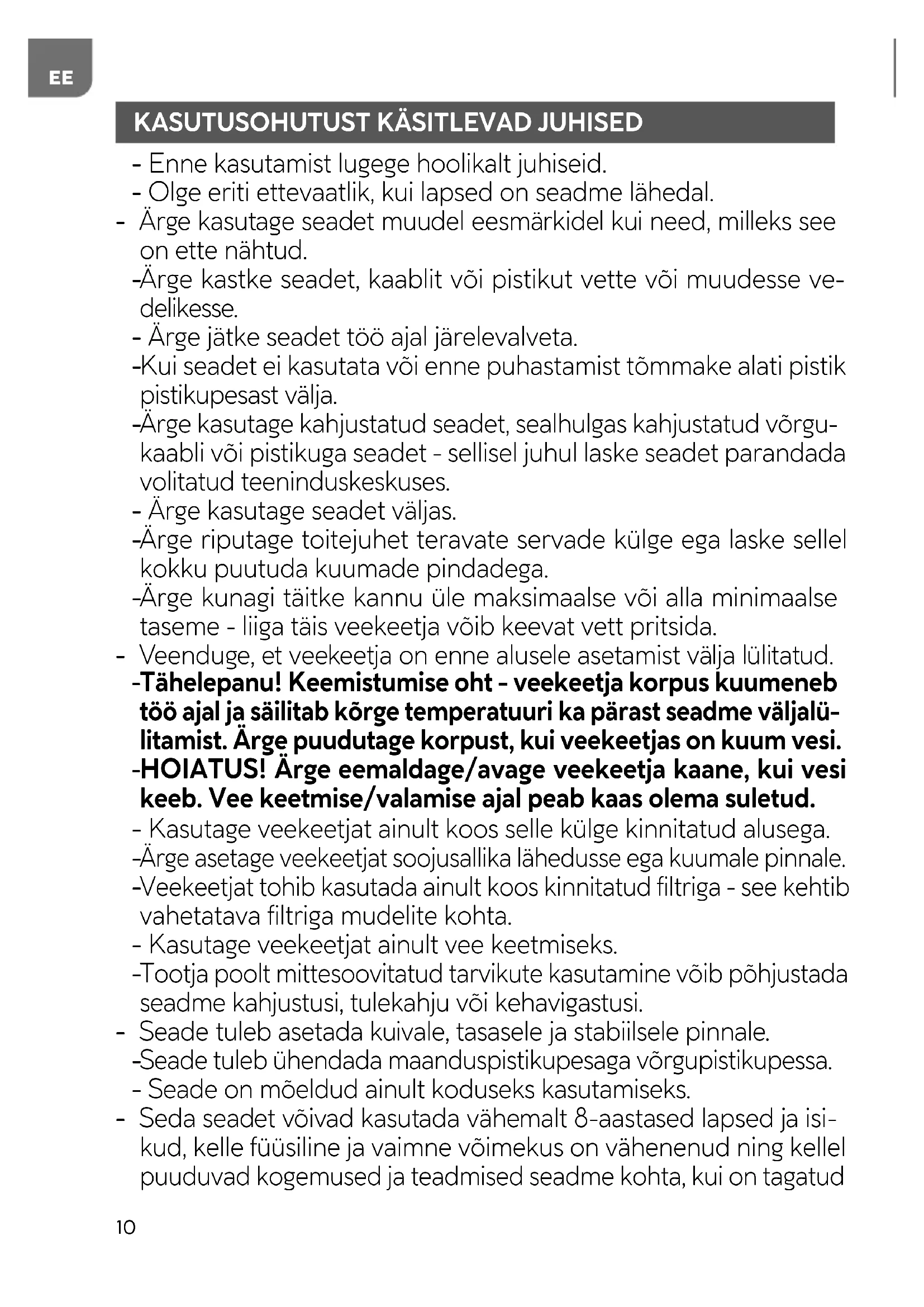 Veekeetjat tohib kasutada ainult koos kinnitatud filtriga - see kehtib vahetatava filtriga mudelite kohta. - Kasutage veekeetjat ainult vee keetmiseks.