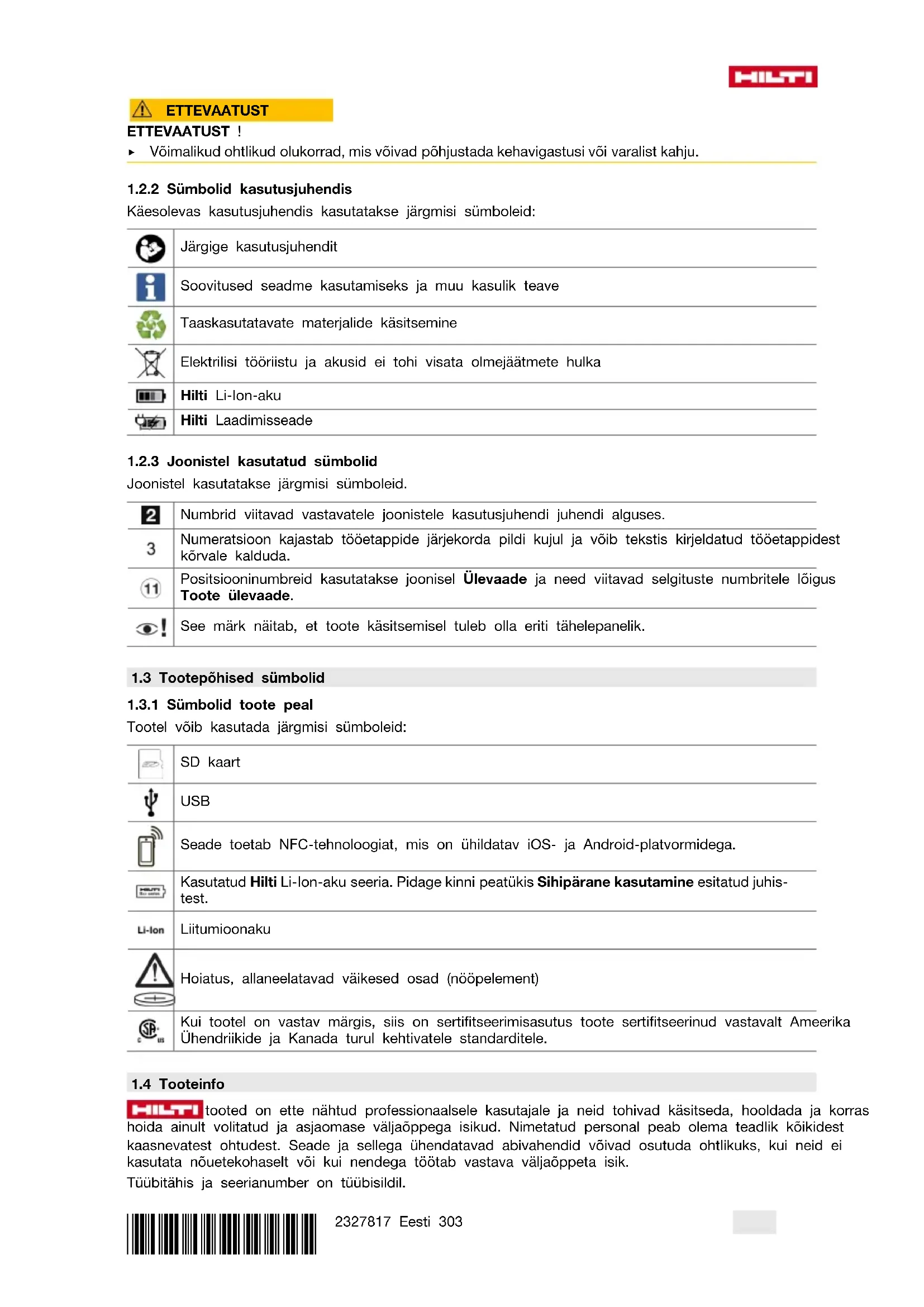 Käesolevas kasutusjuhendis kasutatakse järgmisi sümboleid: Järgige kasutusjuhendit Soovitused seadme kasutamiseks ja muu kasulik teave Taaskasutatavate materjalide käsitsemine Elektrilisi tööriistu ja akusid ei tohi visata olmejäätmete hulka Hilti Li-Ion-aku Hilti Laadimisseade