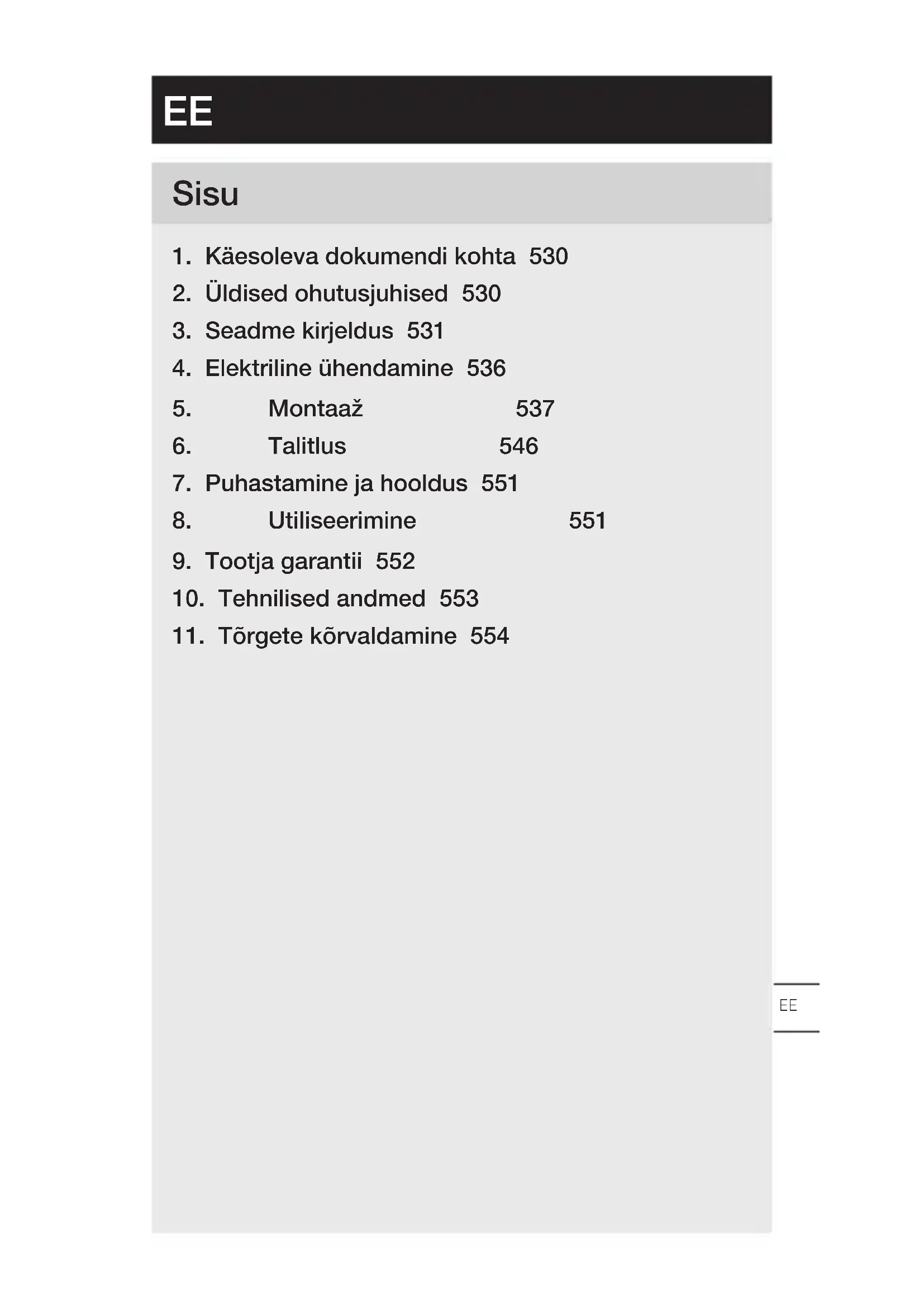 - Hoidke kättesaadavas kohas. – Elektrivooluga ümberkäimine võib tuua kaasa ohtlikke olukordi. Elektrit juhtivate osade puudutamine võib põhjustada elektrilööki põletusi või surma. – Võrgupingel töid tohivad teha ainult kvalifitseeritud spetsialistid. – Tuleb järgida riigisiseseid installatsioonieeskirju ja ühen- damistingimusi (nt DE VDE 0100, AT: ÖVE-ÖNORM E8001-1, CH:SEV1000). – Kasutage ainult originaalvaruosi. – Parandustöid tohivad teha ainult spetsialistid.– 531 – Sisu
