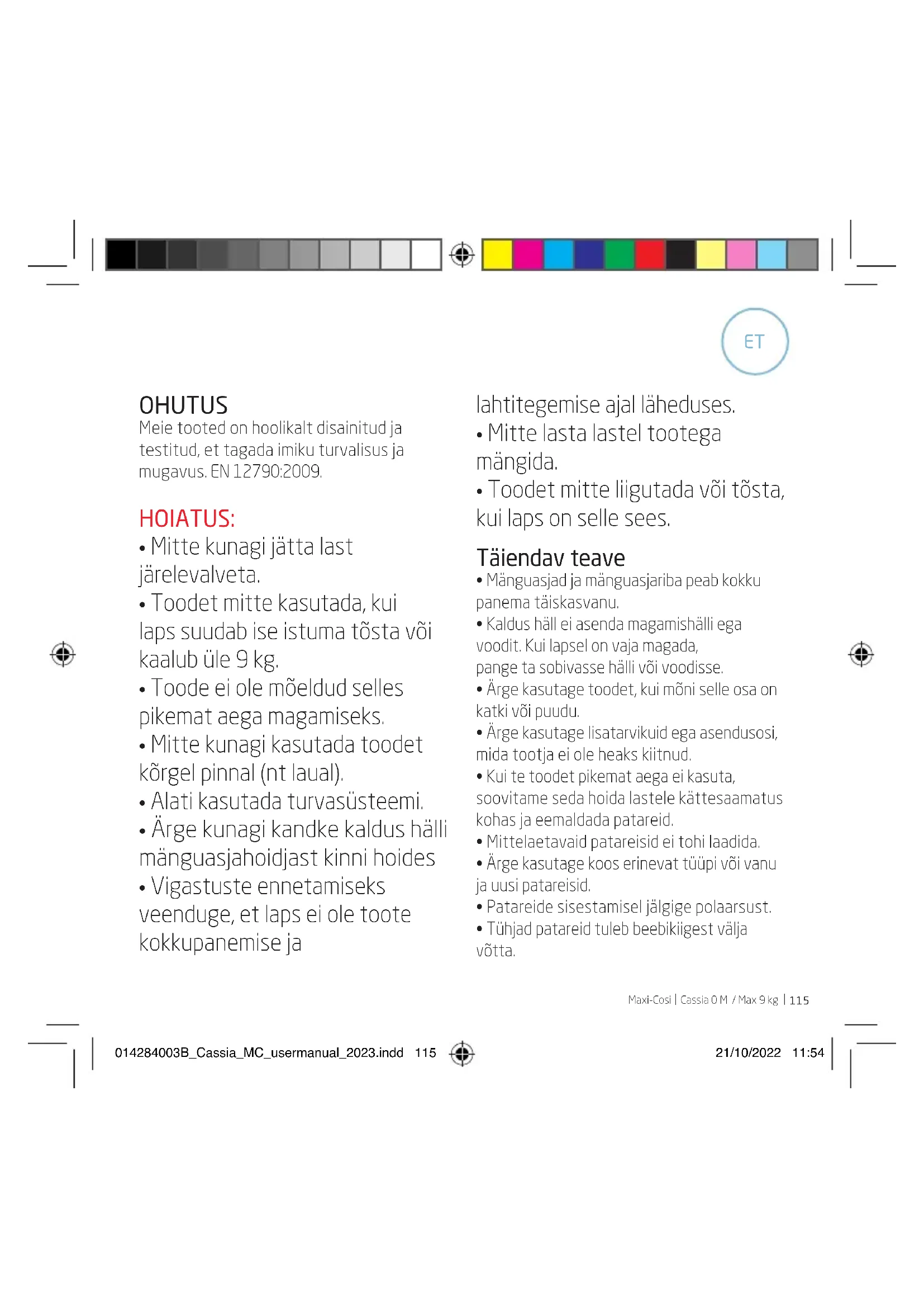 Maxi-Cosi kuni 24 kuud enne garantiiteenuse taotlemist. Kõige lihtsam on, kui kiidame teie garantiiteenuse taotluse eelnevalt heaks. Kui esitate garantiiperioodi ajal taotluse, võime paluda teil toote kooskõlas meie juhistega volitatud turustaja või jaemüüja juurde toimetada. Meie tasume toote transpordi- ja tagastamiskulud, kui olete juhiseid järginud. Kahjustused ja/ või defektid, millele meie garantii ega kliendi seaduslikud õigused ei laiene, ja/ või toodete kahjustused ja/või defektid, mida meie garantii ei kata, saab kõrvaldada mõistliku tasu eest. Kliendi õigused: Kliendil on seaduslikud õigused kooskõlas tarbijakaitseseadustega, mis võivad riigiti erineda. Kliendi õigusi, mis on kooskõlas kehtivate riiklikke seadustega, see garantii ei mõjuta. Selle garantii on andnud Dorel Netherlands. Oleme registreeritud Madalmaades ärinumbri 17060920 all. Meie kaubandusaadress on Korendijk 5, 5704 RD Helmond, The Netherlands, ja postiaadress P.O. Box 6071, 5700 ET Helmond, The Netherlands. Dorel grupi teiste tütarettevõtete nimed ja aadressid leiate selle juhendi viimaselt lehelt ja vastava kaubamärgi veebilehelt. (1) Jaemüüjatelt või edasimüüjatelt ostetud tooteid, mille sildid või identifitseerimisnumbrid on eemaldatud või muudetud, ei aktsepteerita. Volitamata jaemüüjatelt või edasimüüjatelt ostetud tooteid ei peeta volitatud toodeteks. Nendele toodetele garantii ei laiene, kuna toote autentsust ei ole võimalik tuvastada.