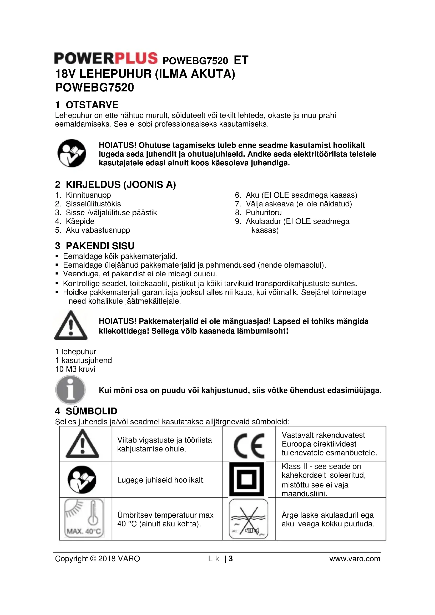 Nimipinge 18V Max õhukiirus 160 km/h Aku ühendus külge lükatav Pehme käepide Jah 14 MÜRA Müraväärtusi mõõdetakse vastavalt asjakohastele standarditele. (K=3) Helirõhu tase LpA 80 dB(A) Helivõimsuse tase LwA 95 dB(A) TÄHELEPANU! Helivõimsuse tase võib ületada 85 dB(A). Sellisel juhul tuleb kanda kuulmekaitset.POWEBG7520 ET Copyright © 2018 VARO Lk | 9 www.varo.com aw (vibratsioon) 6,6 m/s² K = 1,5 m/s² 15 GARANTII