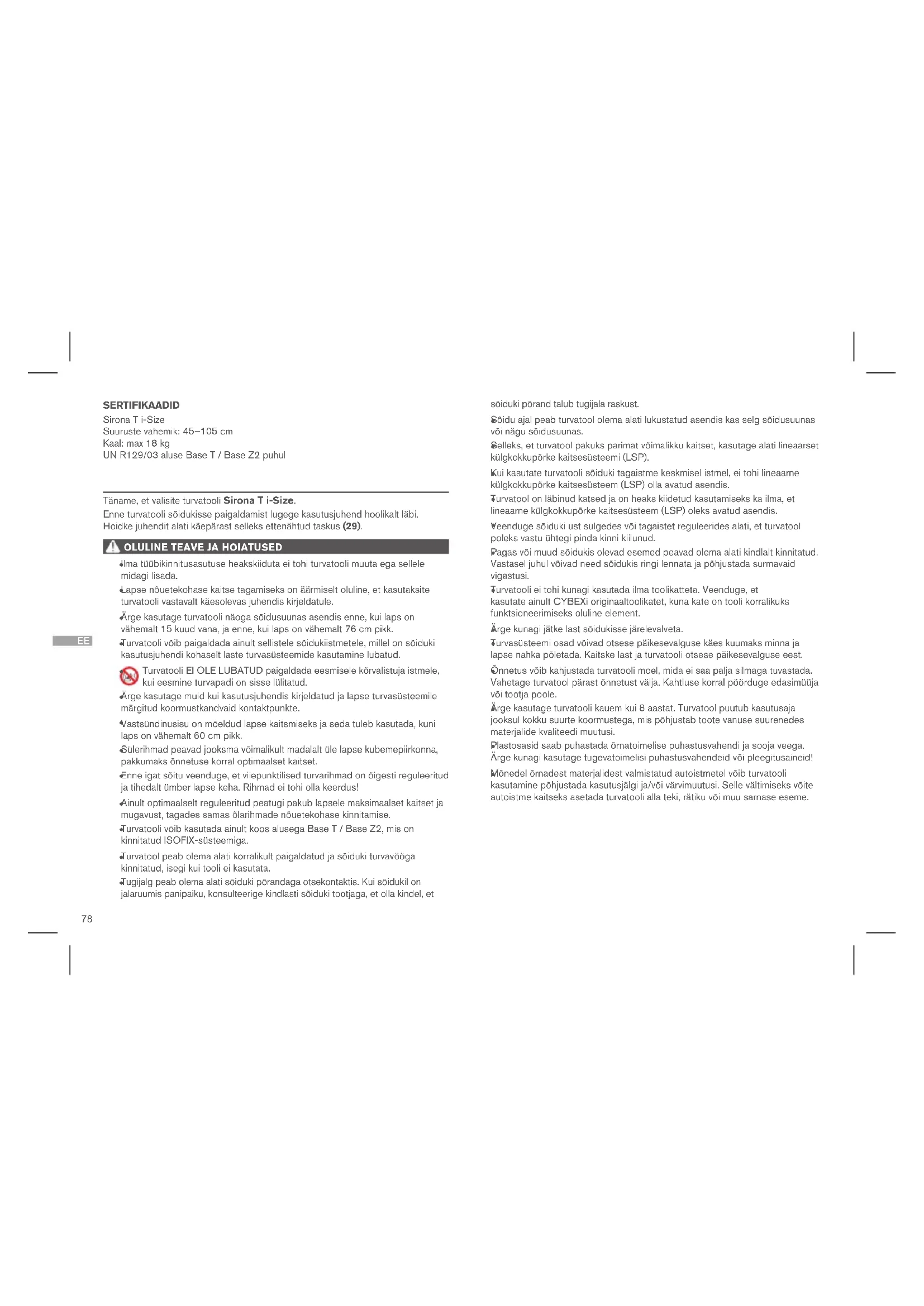 Tugijalg peab olema alati sõiduki põrandaga otsekontaktis. Kui sõidukil on jalaruumis panipaiku, konsulteerige kindlasti sõiduki tootjaga, et olla kindel, et SERTIFIKAADID Sirona T i-Size Suuruste vahemik: 45–105 cm Kaal: max 18 kg UN R129/03 aluse Base T / Base Z2 puhul sõiduki põrand talub tugijala raskust.