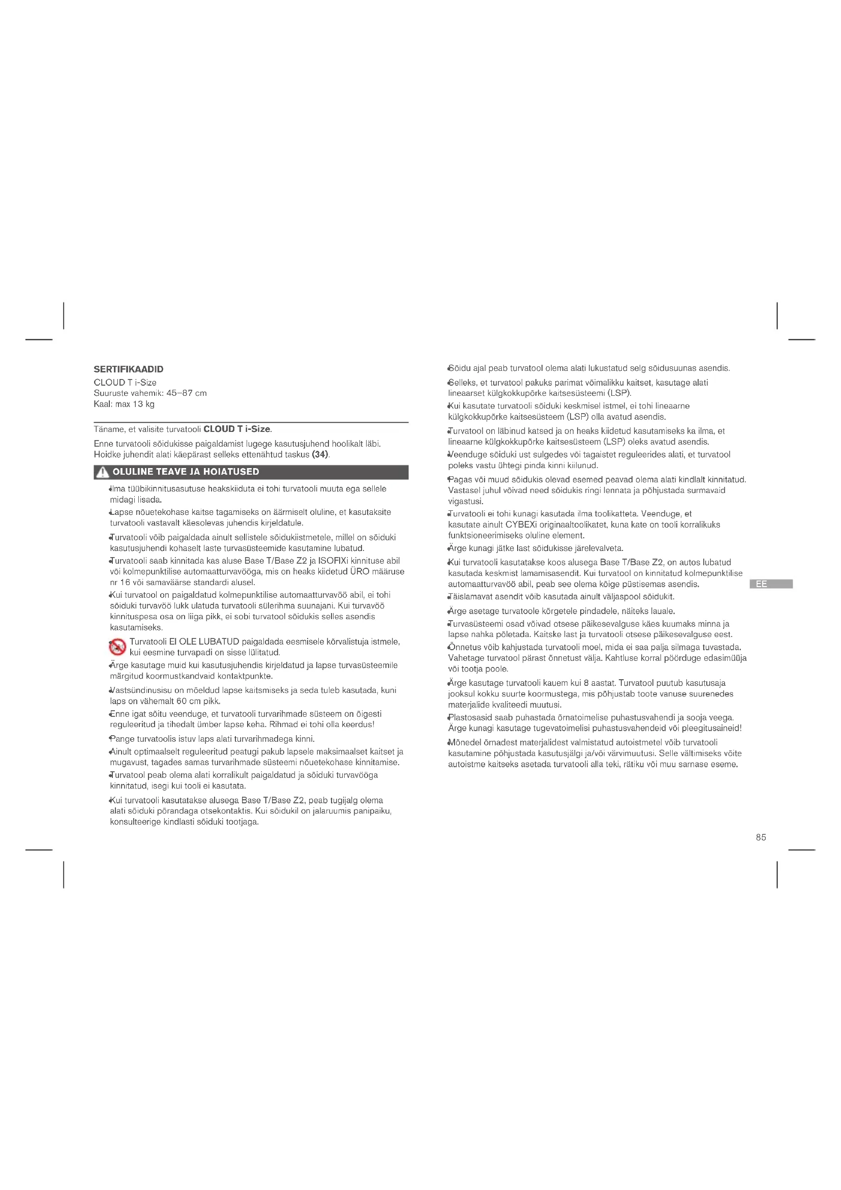 Kui turvatooli kasutatakse alusega Base T/Base Z2, peab tugijalg olema alati sõiduki põrandaga otsekontaktis. Kui sõidukil on jalaruumis panipaiku, konsulteerige kindlasti sõiduki tootjaga. SERTIFIKAADID CLOUD T i-Size Suuruste vahemik: 45–87 cm Kaal: max 13 kg