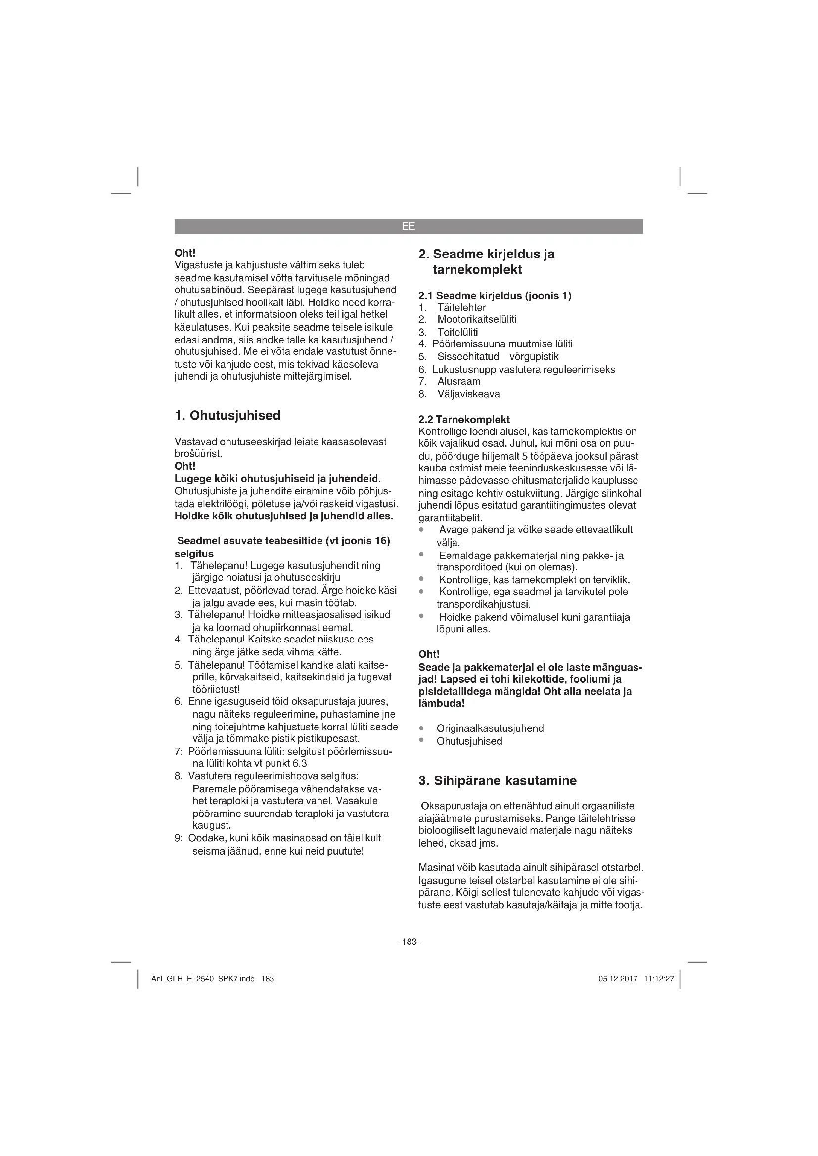 Oksapurustaja on ettenähtud ainult orgaaniliste aiajäätmete purustamiseks. Pange täitelehtrisse bioloogiliselt lagunevaid materjale nagu näiteks lehed, oksad jms. Masinat võib kasutada ainult sihipärasel otstarbel. Igasugune teisel otstarbel kasutamine ei ole sihi- pärane. Kõigi sellest tulenevate kahjude või vigas- tuste eest vastutab kasutaja/käitaja ja mitte tootja. Anl_GLH_E_2540_SPK7.indb 183Anl_GLH_E_2540_SPK7.indb 183 05.12.2017 11:12:2705.12.2017 11:12:27EE