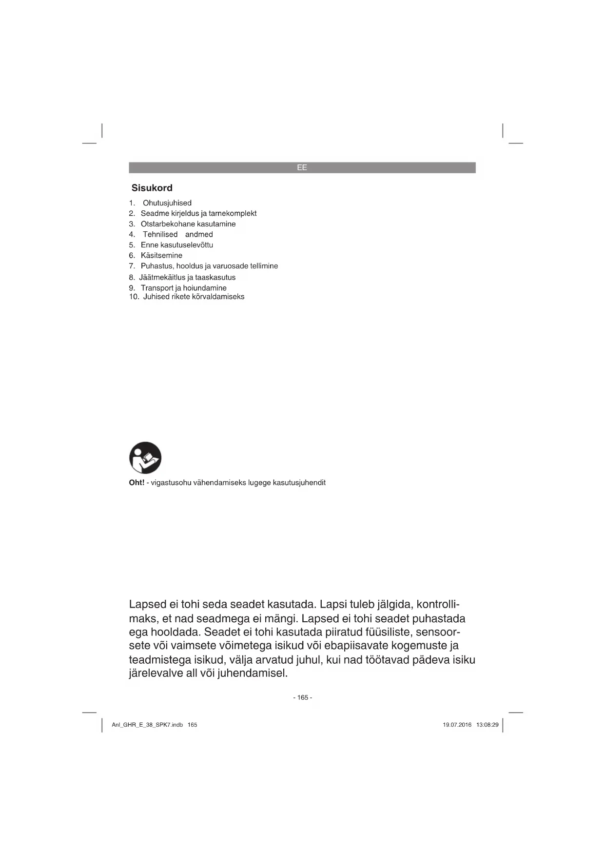 Lapsed ei tohi seda seadet kasutada. Lapsi tuleb jälgida, kontrolli- maks, et nad seadmega ei mängi. Lapsed ei tohi seadet puhastada ega hooldada. Seadet ei tohi kasutada piiratud füüsiliste, sensoor- sete või vaimsete võimetega isikud või ebapiisavate kogemuste ja teadmistega isikud, välja arvatud juhul, kui nad töötavad pädeva isiku järelevalve all või juhendamisel. Oht! - vigastusohu vähendamiseks lugege kasutusjuhendit Anl_GHR_E_38_SPK7.indb 165Anl_GHR_E_38_SPK7.indb 165 19.07.2016 13:08:2919.07.2016 13:08:29EE