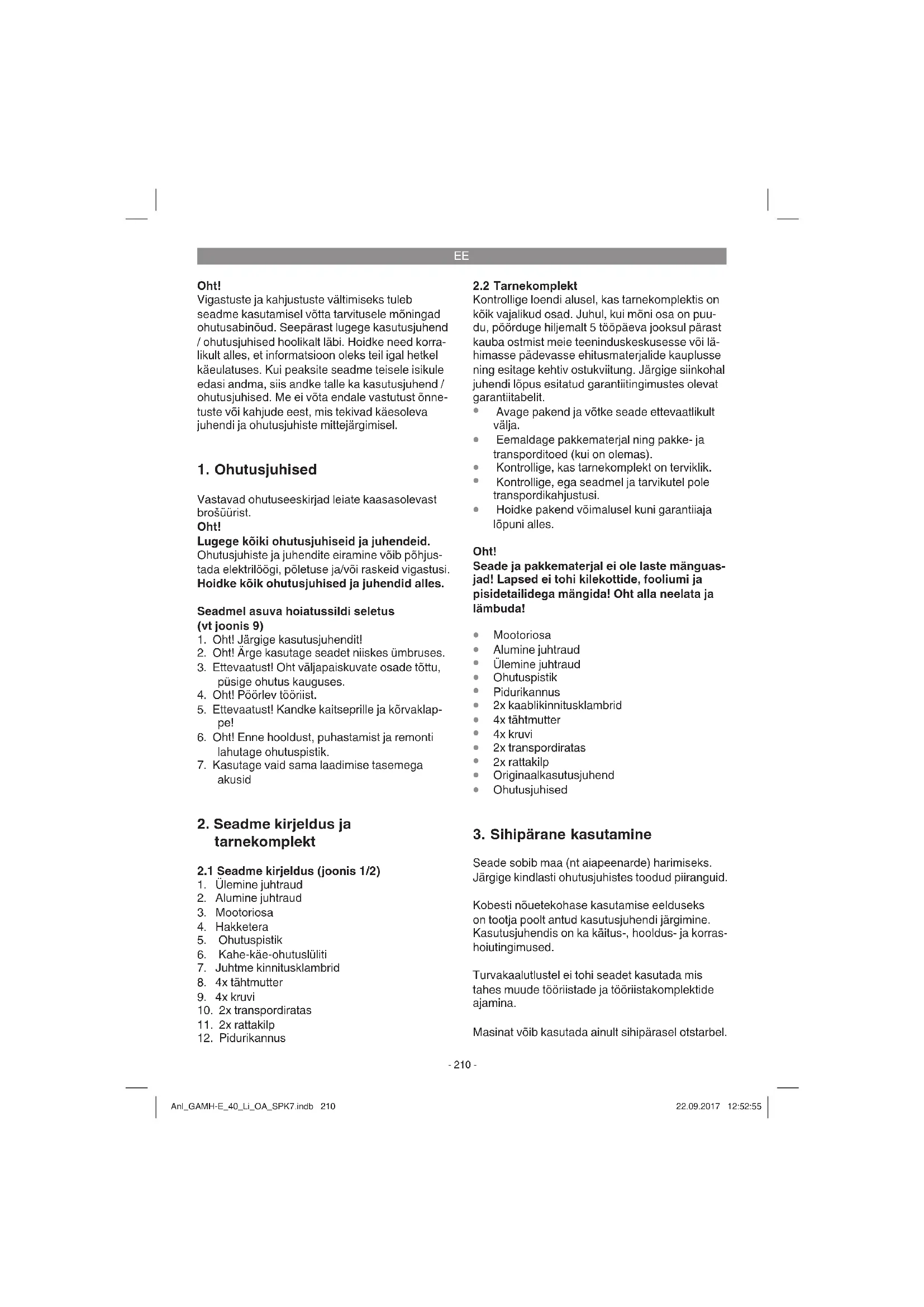 Ainult Euroopa Liidu riikidele Ärge visake elektrilisi tööriistu olmeprügi hulka! Euroopa Liidu direktiiviga 2012/19/EÜ elektri- ja elektroonikaseadmete jäätmete kohta ja siseriiklikele kohaldamistele tuleb kasutatud elektrilised tööriistad koguda kokku eraldi ja leida neile keskkonnasääst- lik taaskasutus. Taaskasutusalternatiiv tagasisaatmisnõudele: Elektriseadme omanik on kohustatud omandisuhte lõppemisel alternatiivina tagasisaatmisele kaasa aitama sobivale taaskasutusele. Seega võib vana seadme loovutada ka tagasivõtukohta, mis korraldab selle kõrvaldamise riikliku ringlusmajanduse ja jäätmeseadusandluse tähenduses. Asjasse ei puutu va- nade seadmete elektrikomponentideta lisaseadmed ja abivahendid. Tootedokumentatsiooni ja kaasasolevate dokumentide kordustrükk või muul viisil paljundamine, ka osa- liselt, on lubatud ainult iSC GmbH loal. Tehniliste muudatuste õigus reserveeritud Anl_GAMH-E_40_Li_OA_SPK7.indb 217Anl_GAMH-E_40_Li_OA_SPK7.indb 217 22.09.2017 12:52:5622.09.2017 12:52:56EE