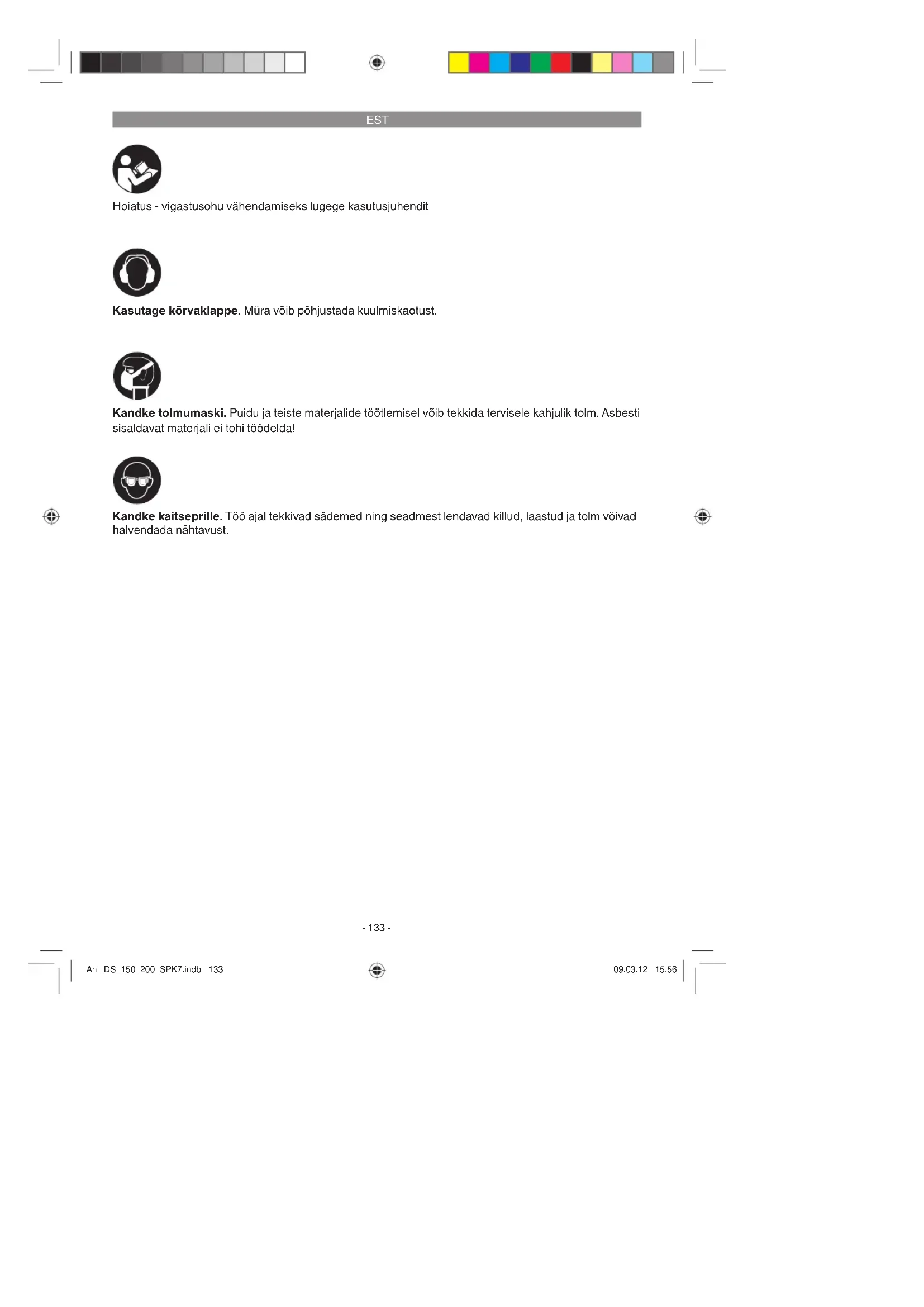 Hoiatus - vigastusohu vähendamiseks lugege kasutusjuhendit Kasutage kõrvaklappe. Müra võib põhjustada kuulmiskaotust. Kandke kaitseprille. Töö ajal tekkivad sädemed ning seadmest lendavad killud, laastud ja tolm võivad halvendada nähtavust. Kandke tolmumaski. Puidu ja teiste materjalide töötlemisel võib tekkida tervisele kahjulik tolm. Asbesti sisaldavat materjali ei tohi töödelda! Anl_DS_150_200_SPK7.indb 133Anl_DS_150_200_SPK7.indb 133 09.03.12 15:5609.03.12 15:56EST