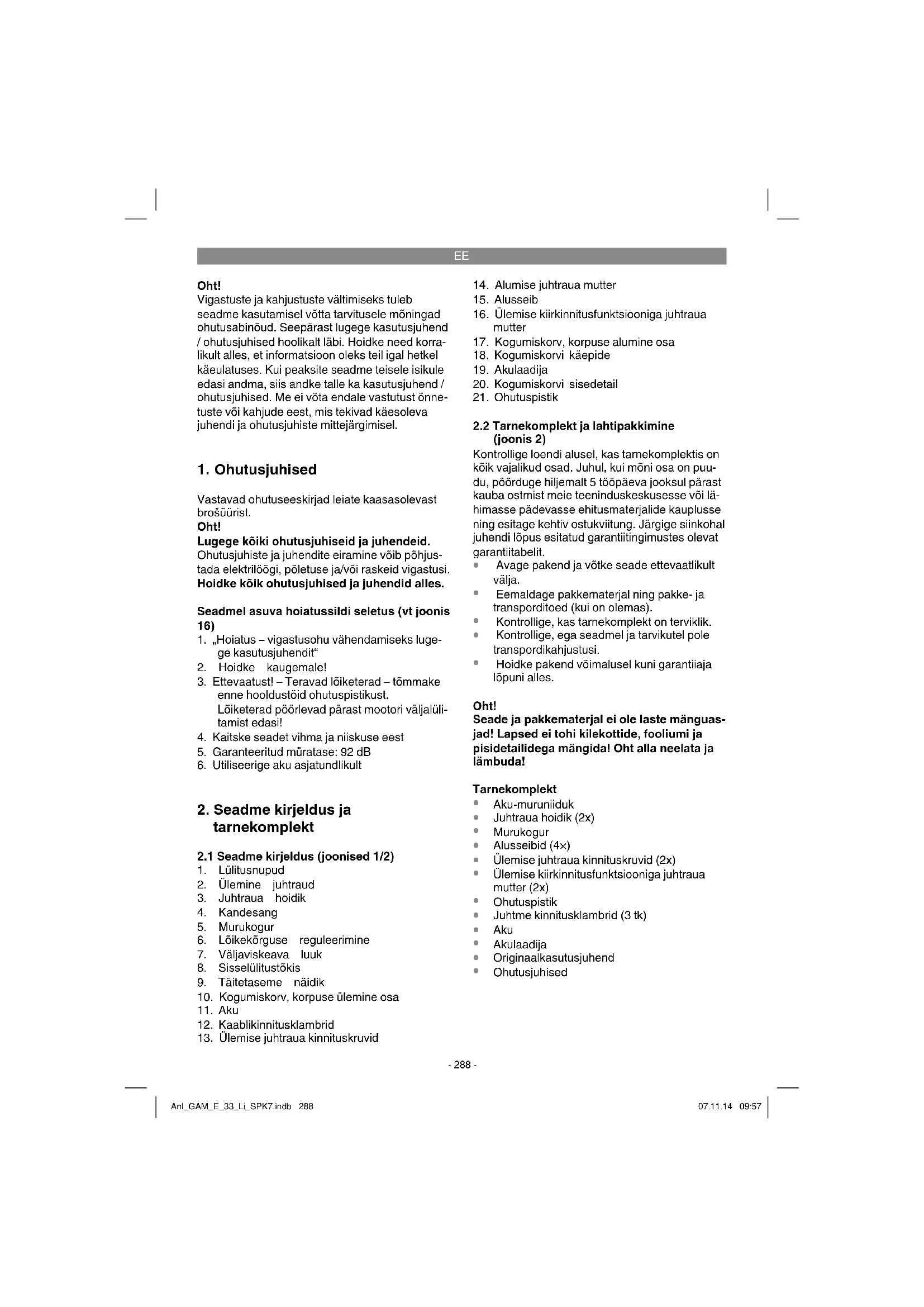 Ainult Euroopa Liidu riikidele Ärge visake elektrilisi tööriistu olmeprügi hulka! Euroopa Liidu direktiiviga 2012/19/EÜ elektri- ja elektroonikaseadmete jäätmete kohta ja siseriiklikele kohaldamistele tuleb kasutatud elektrilised tööriistad koguda kokku eraldi ja leida neile keskkonnasääst- lik taaskasutus. Taaskasutusalternatiiv tagasisaatmisnõudele: Elektriseadme omanik on kohustatud omandisuhte lõppemisel alternatiivina tagasisaatmisele kaasa aitama sobivale taaskasutusele. Seega võib vana seadme loovutada ka tagasivõtukohta, mis korraldab selle kõrvaldamise riikliku ringlusmajanduse ja jäätmeseadusandluse tähenduses. Asjasse ei puutu va- nade seadmete elektrikomponentideta lisaseadmed ja abivahendid. Tootedokumentatsiooni ja kaasasolevate dokumentide kordustrükk või muul viisil paljundamine, ka osa- liselt, on lubatud ainult iSC GmbH loal. Tehniliste muudatuste õigus reserveeritud Anl_GAM_E_33_Li_SPK7.indb 296Anl_GAM_E_33_Li_SPK7.indb 296 07.11.14 09:5707.11.14 09:57EE