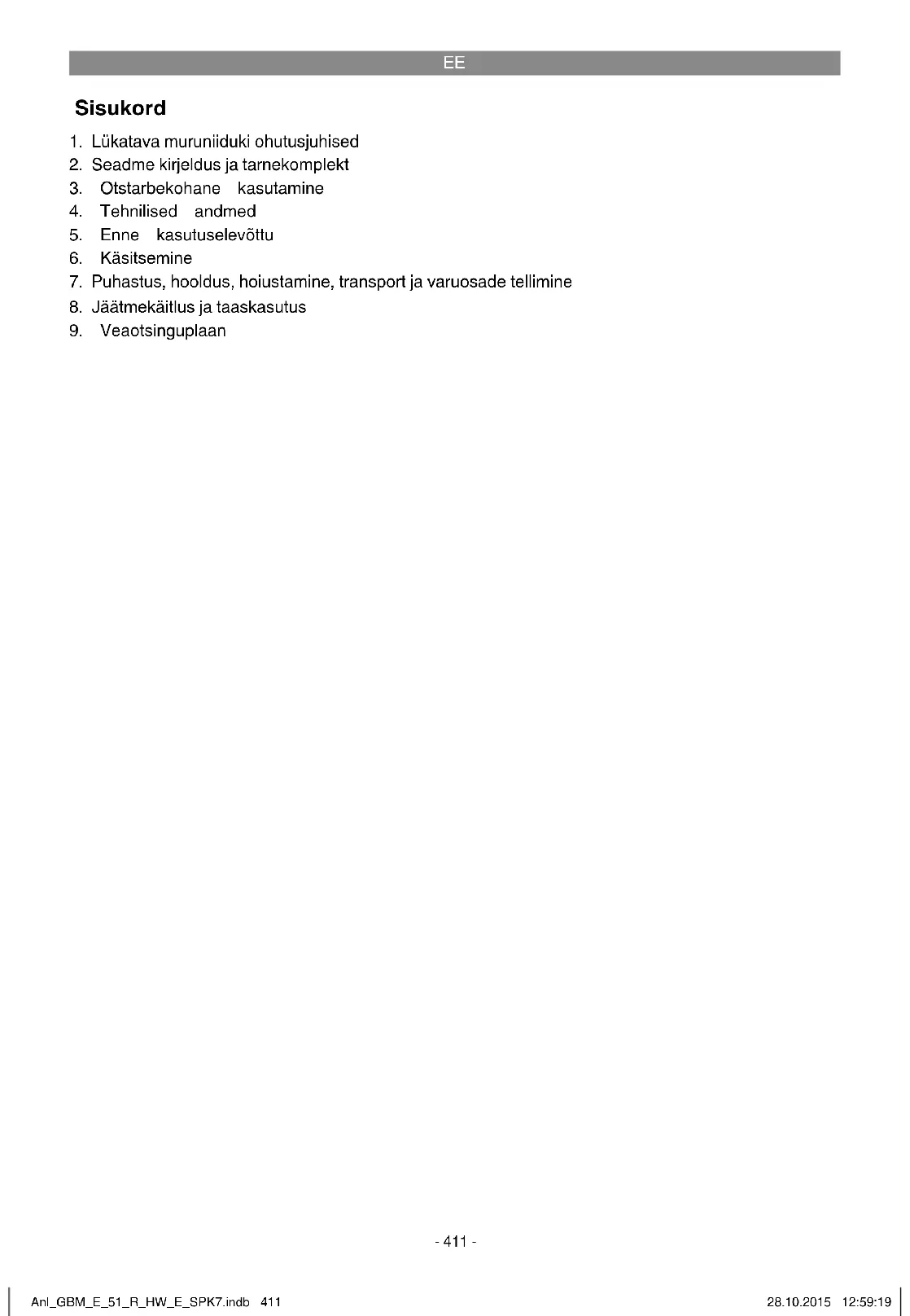 Transpordikahjustuste vältimiseks on seade pakendis. See pakend on toormaterjal ja seega taaskasutatav ning selle saab toorainetöötlusse tagasi toimetada. Seade ja selle tarvikud koosne- vad mitmesugustest materjalidest nagu nt metall ja plast. Viige katkised detailid spetsiaalsesse kogumiskohta. Küsige lisateavet erialakauplusest või kohalikust omavalitsusest! Anl_GBM_E_51_R_HW_E_SPK7.indb 423Anl_GBM_E_51_R_HW_E_SPK7.indb 423 28.10.2015 12:59:2028.10.2015 12:59:20EE